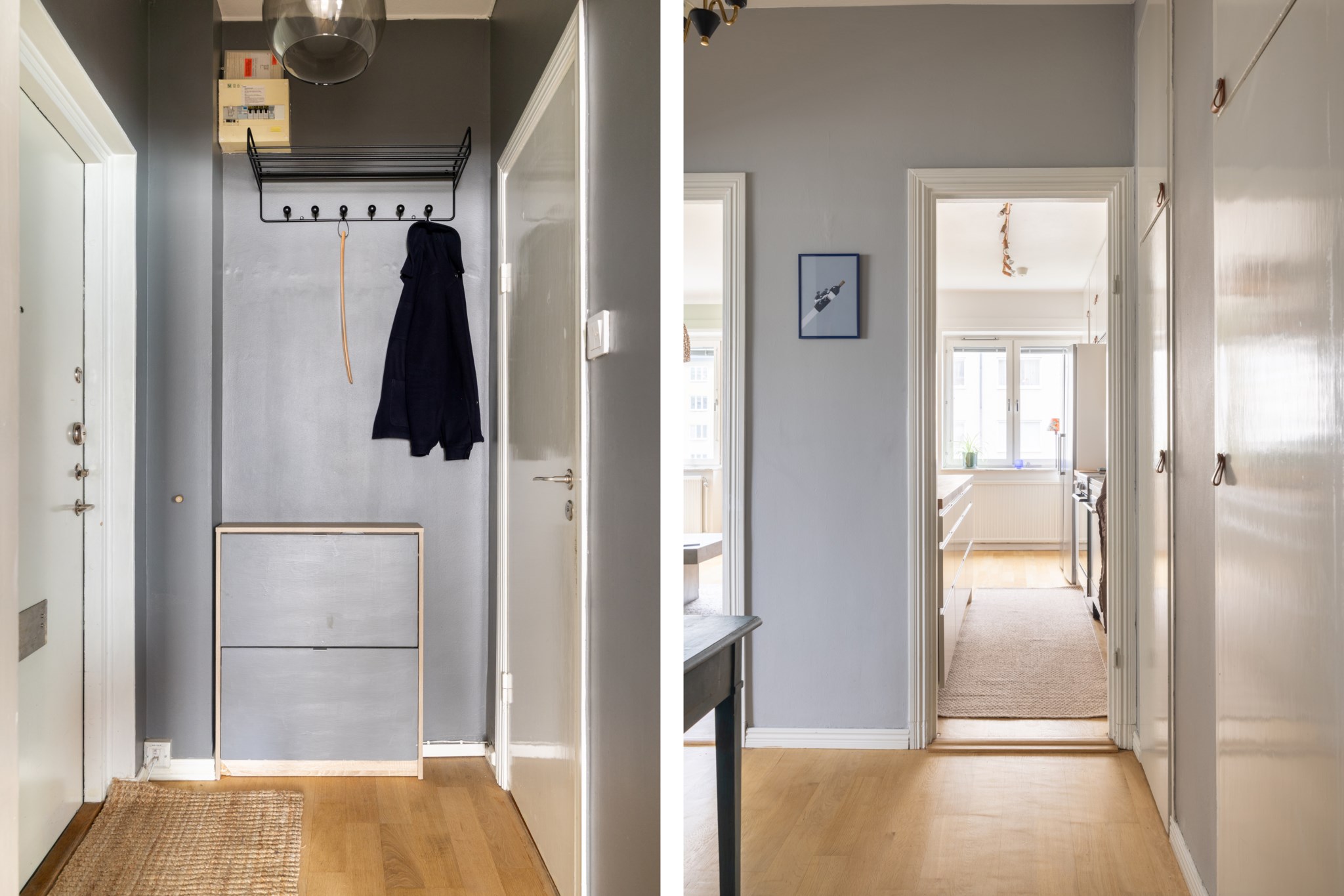 Välkomnande hall med målade ytskikt och parkettgolv. Här finns avhängning för ytterkläder och skor direkt intill ytterdörren samt ytterligare förvaring i flera inbyggda garderober med överskåp. Hallen erbjuder även plats för annat möblemang om så önskas.