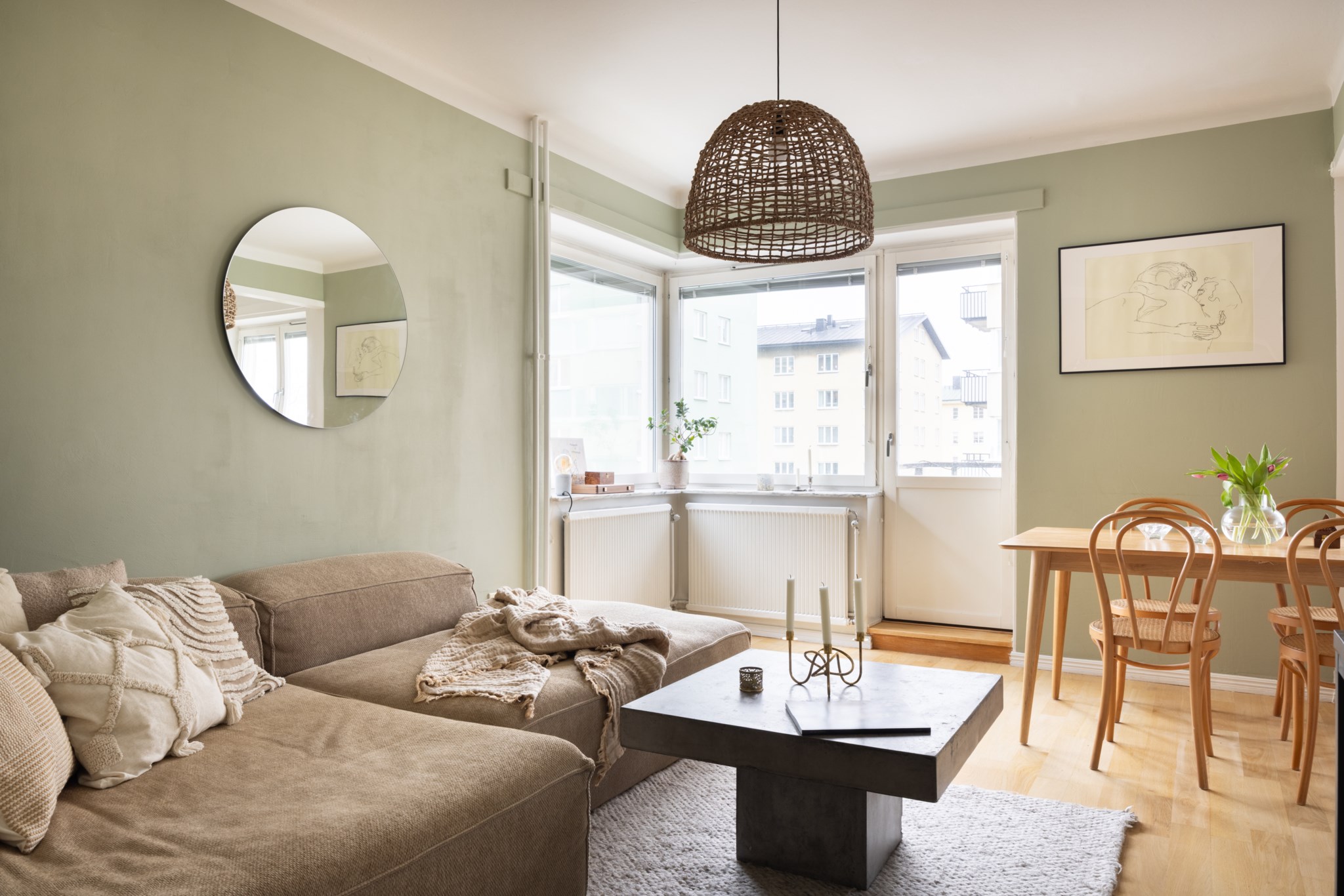 Trivsamt vardagsrum med generösa sociala ytor och ett fint naturligt ljusinsläpp från ett stort fönsterparti i vinkel, kombinerat med balkongöppning samt ljusinsläpp från kökets fönster. Rummet erbjuder gott om plats för en generös soffgrupp och annat möblemang samt personlig inredning efter behov. Utgången till bostadens balkong skapar under de varmare månaderna en naturlig förbindelse mellan ute och inne. Målade ytskikt och parkettgolv.