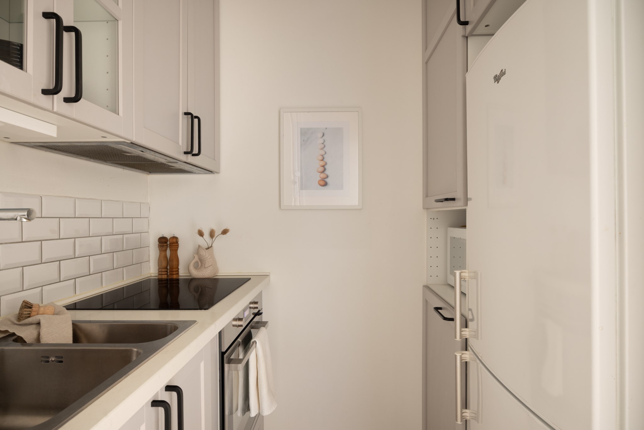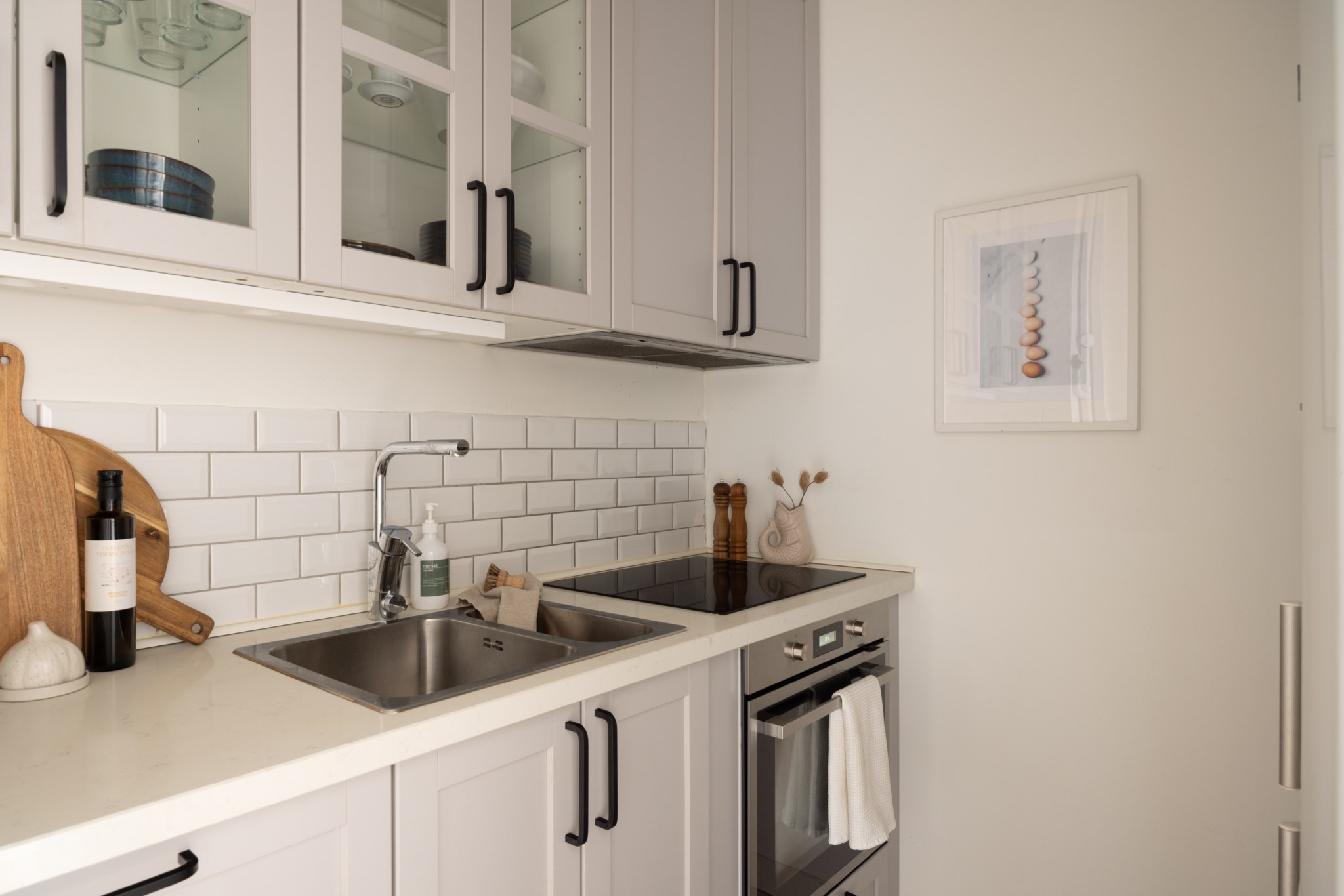 Ljust och fräscht kök med harmoniska färgval på luckorna. God arbetsyta och maskinell utrustning som består av kyl/frys, spis och ugn. Det finns även plats för mikro om så önskas. Ett ljust stänkskydd pryder en del av väggen.