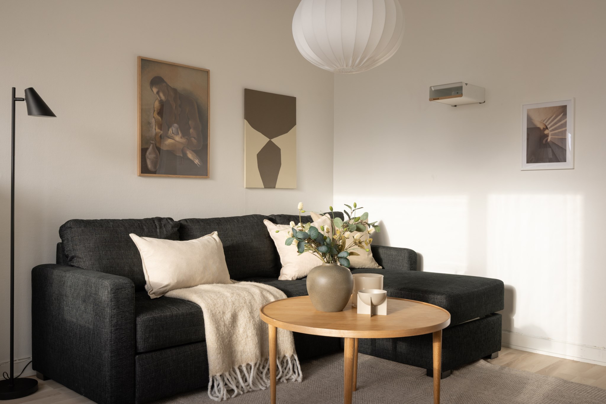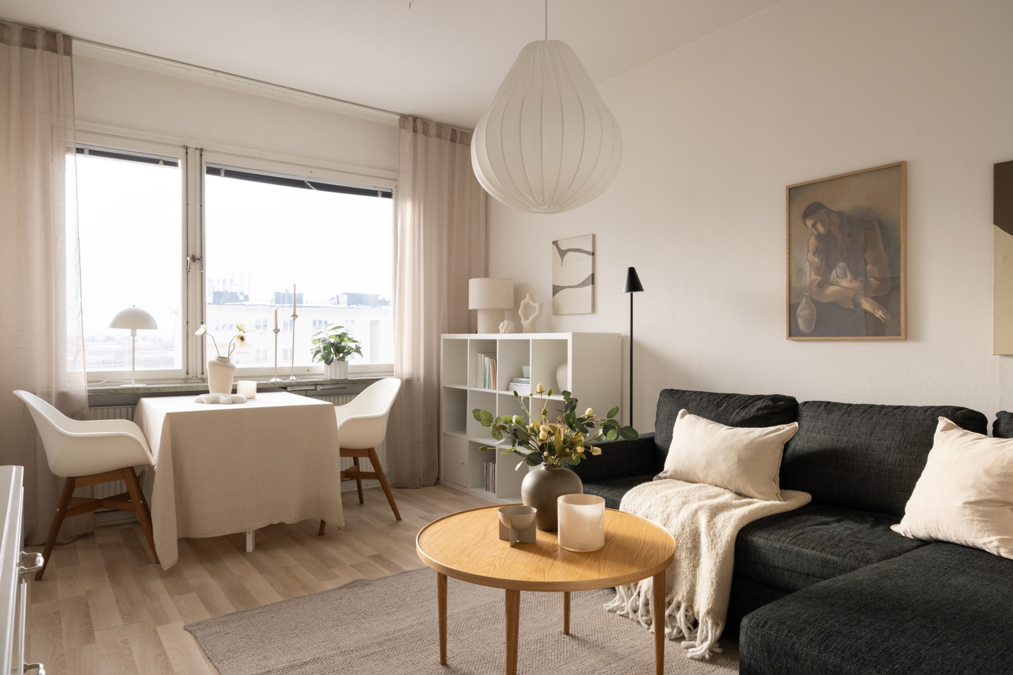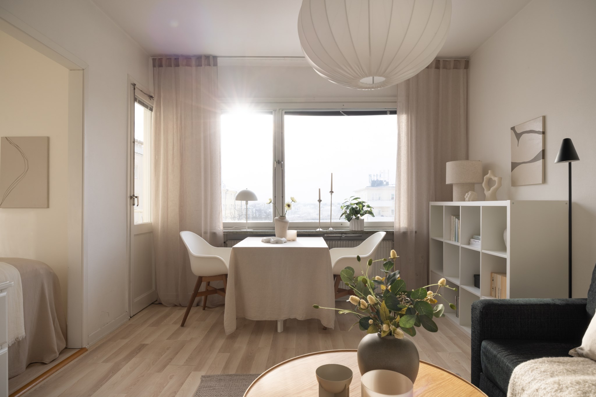 Öppet och ljust vardagsrum med stort fönsterparti som ger gott ljusinsläpp. Plats finns för både soff- och matgrupp, vilket skapar en flexibel yta för avkoppling och socialt umgänge. Rummet har ljust målade väggar och ljust golv.