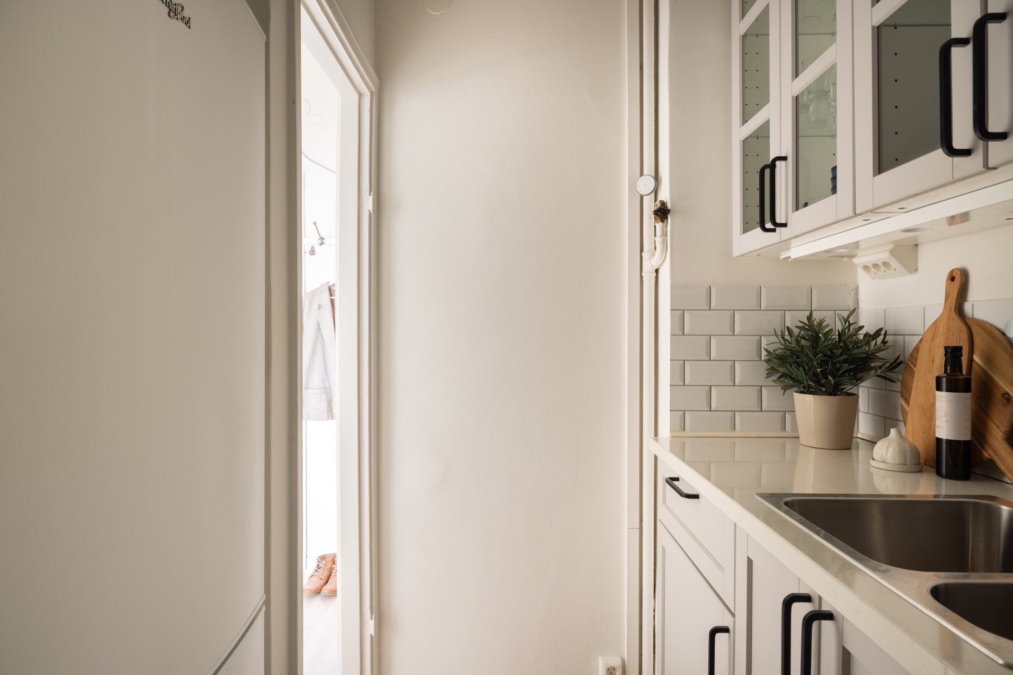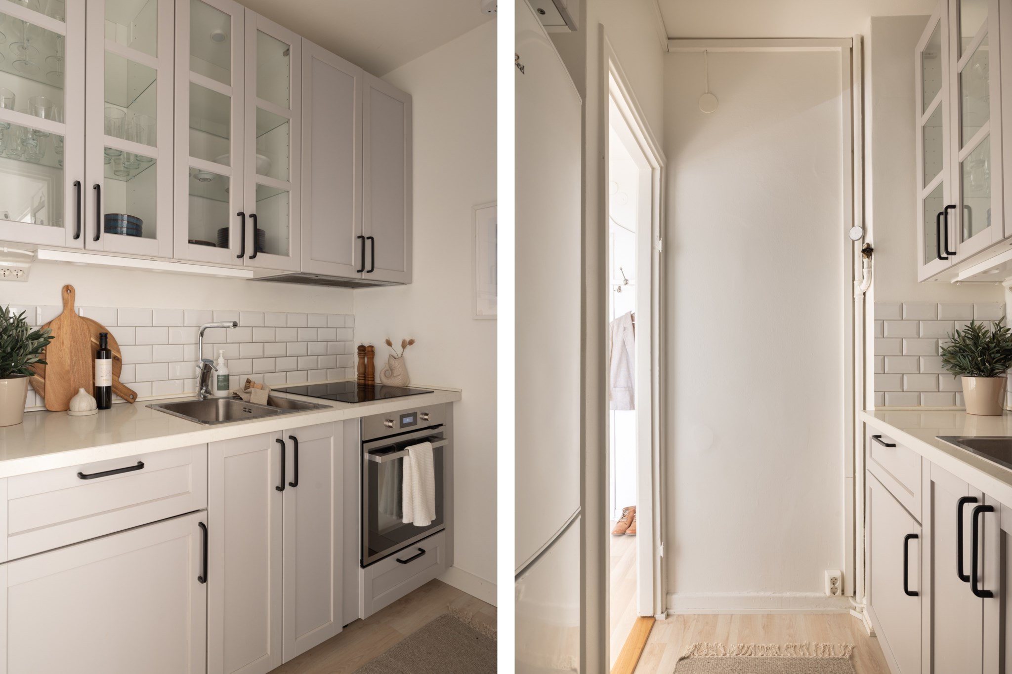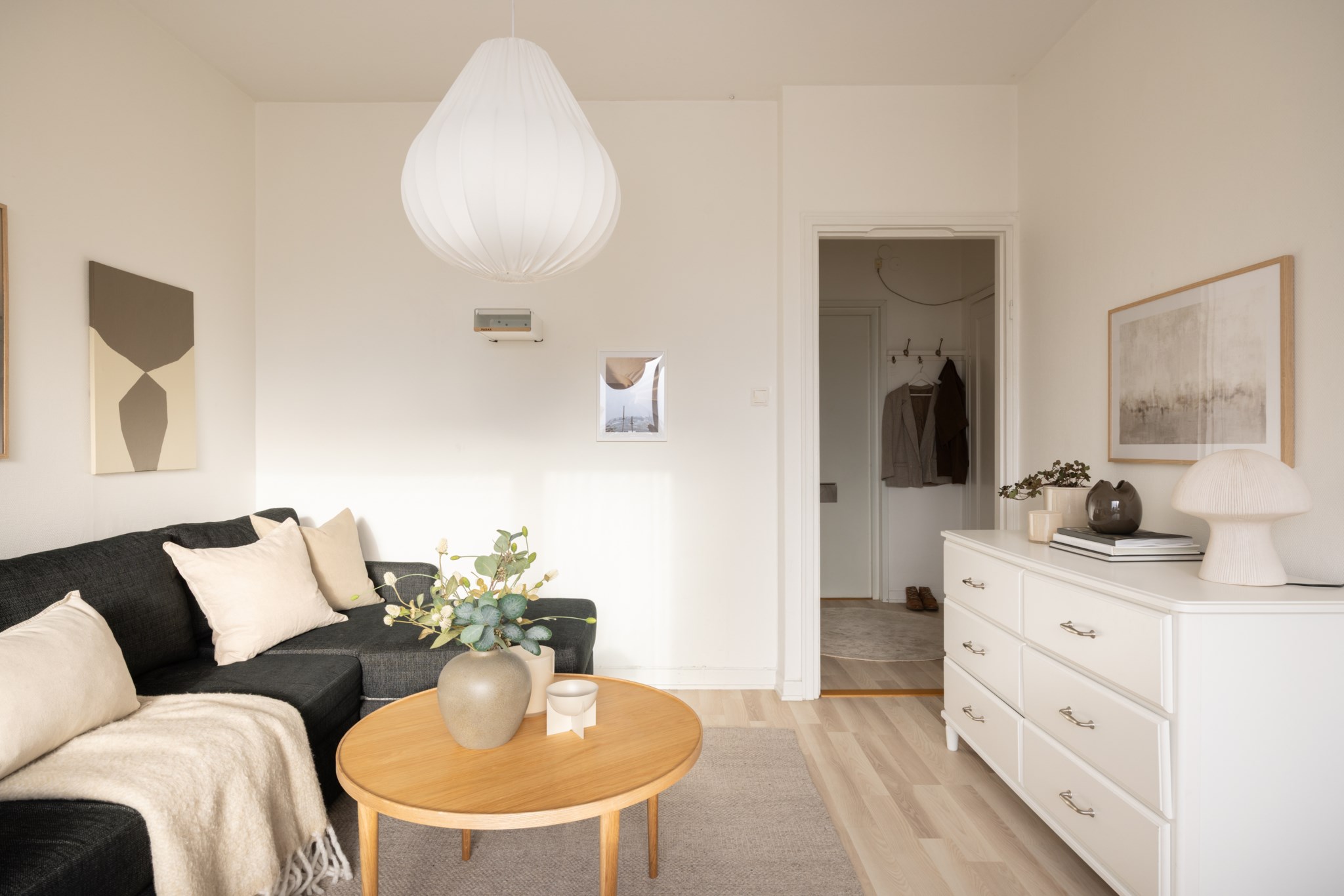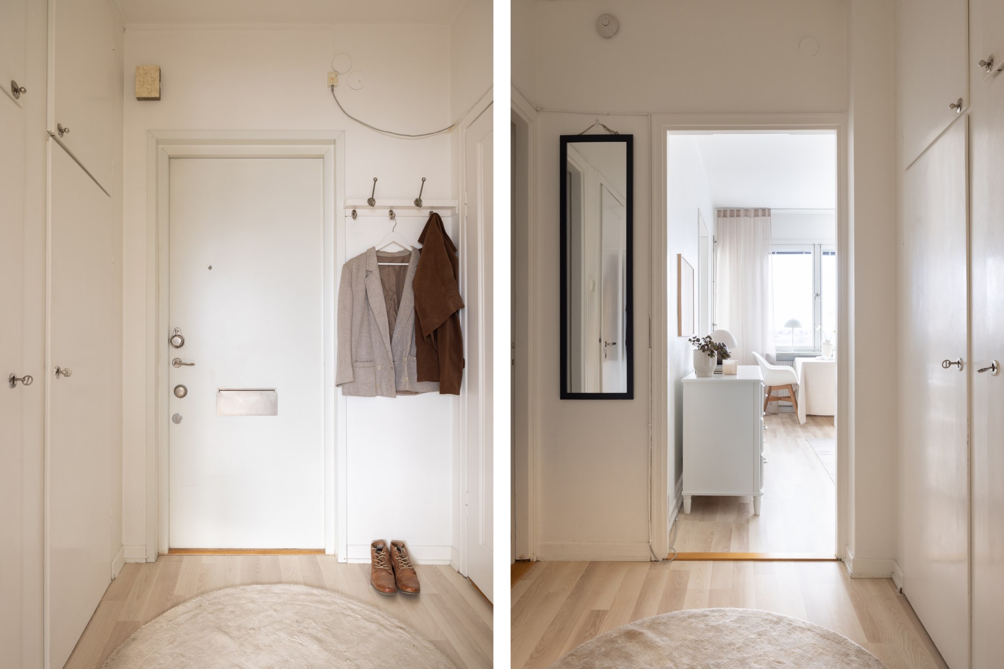 Välkomnande hall med ljus och luftig känsla. Ljusa ytskikt och ett ljust golv förstärker hallens karaktär. Hallen erbjuder praktisk förvaring i inbyggda garderober som sträcker sig från golv till tak.