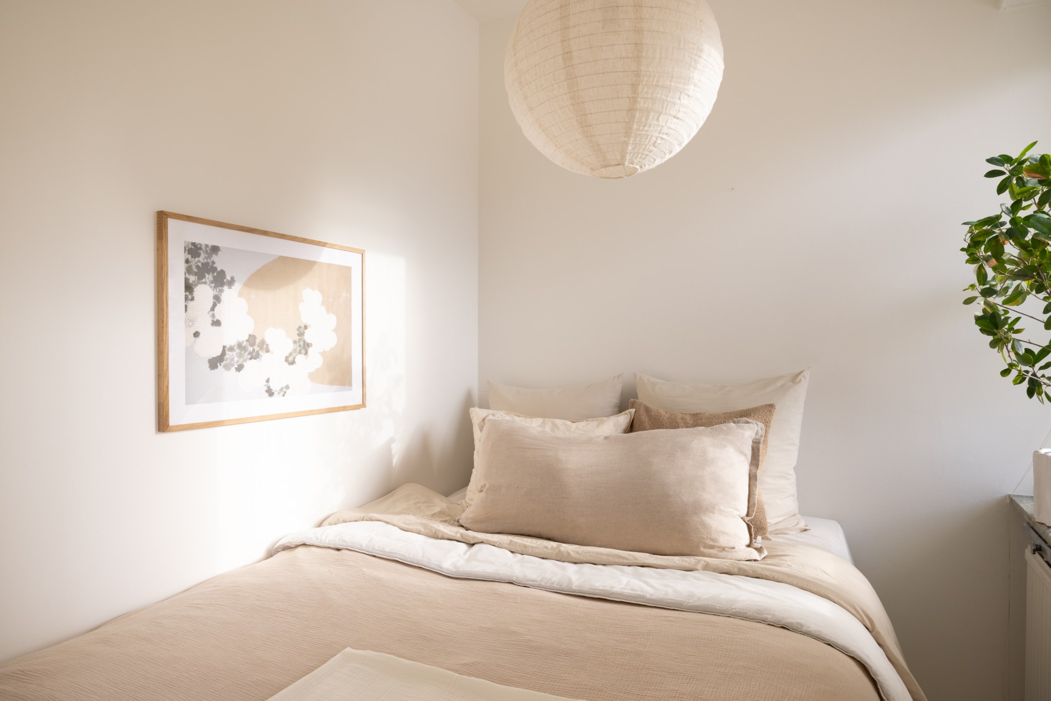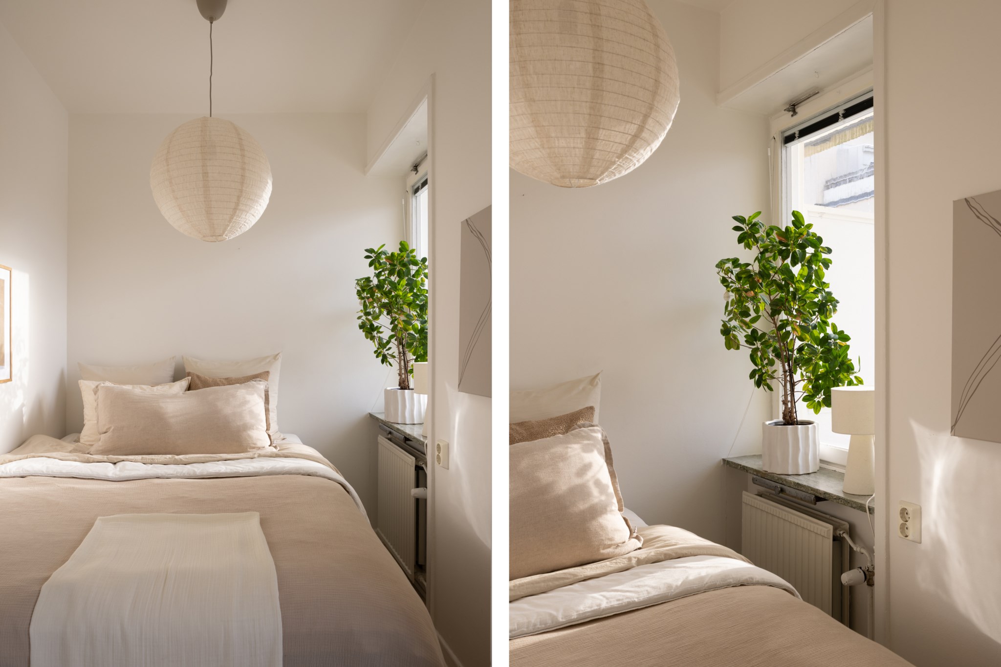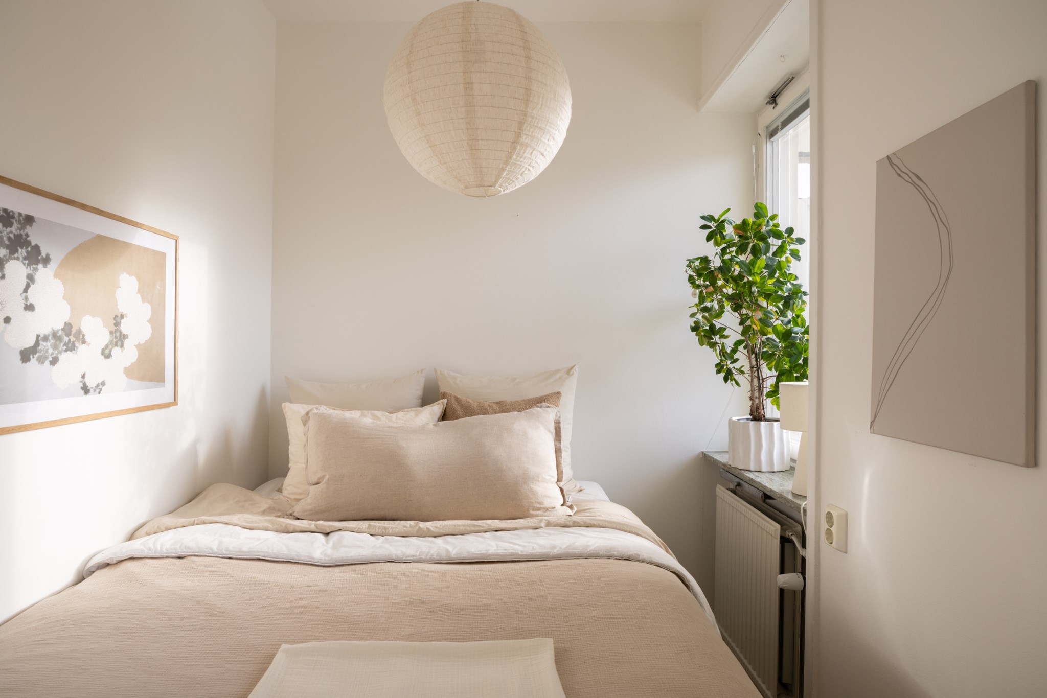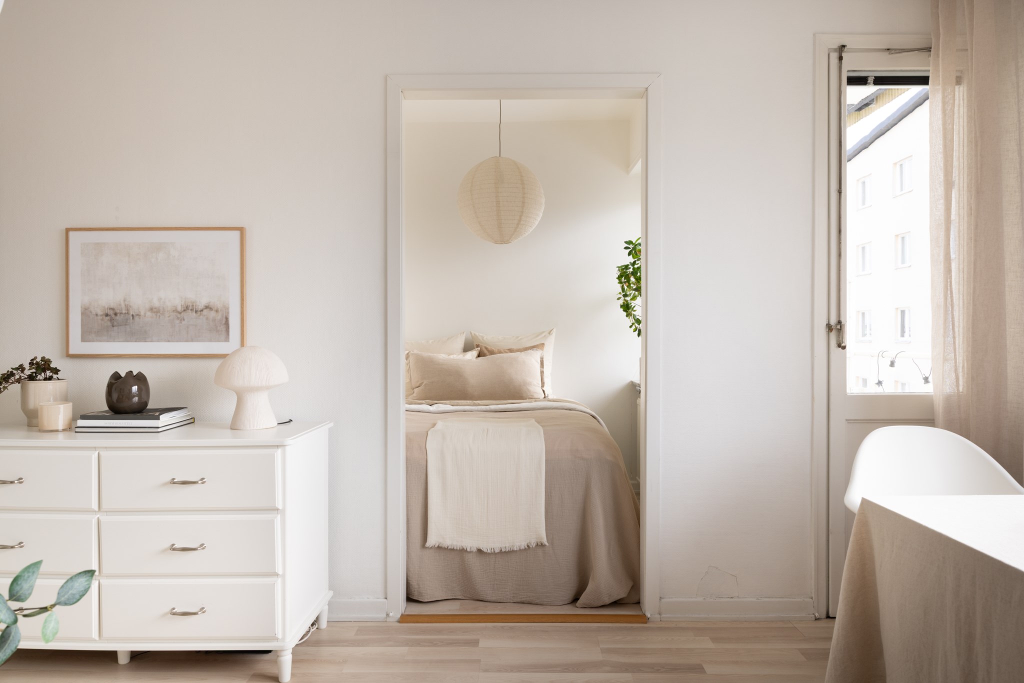 Mysigt sovrum med ljust målade väggar och samma vackra ljusa golv som i resten av lägenheten. Rummet rymmer en säng och har fönster mot balkongen som ger fint ljusinsläpp.