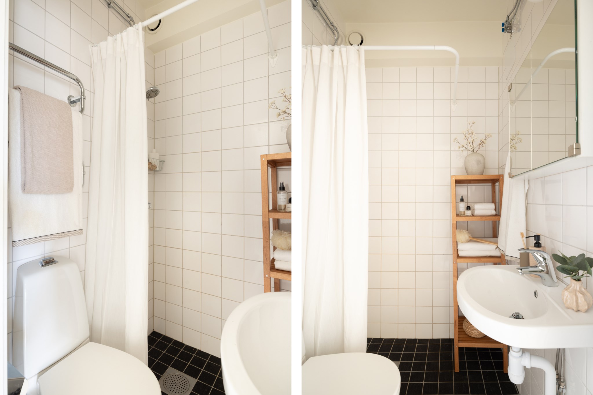 Helkaklat badrum med delvis ljust kaklade väggar och mörkt klinkergolv. Badrummet är utrustat med WC, handfat, spegelskåp och duschhörna.