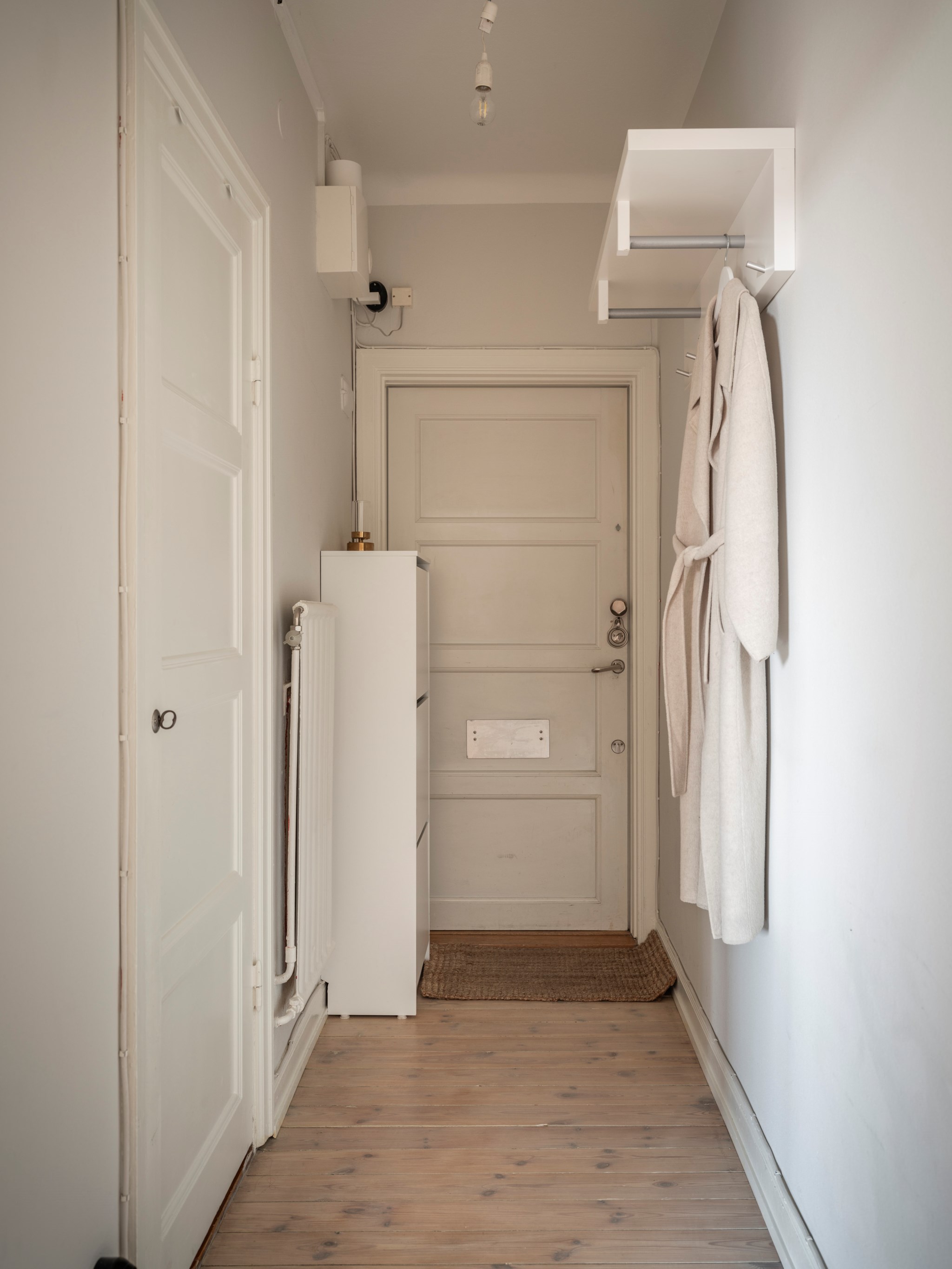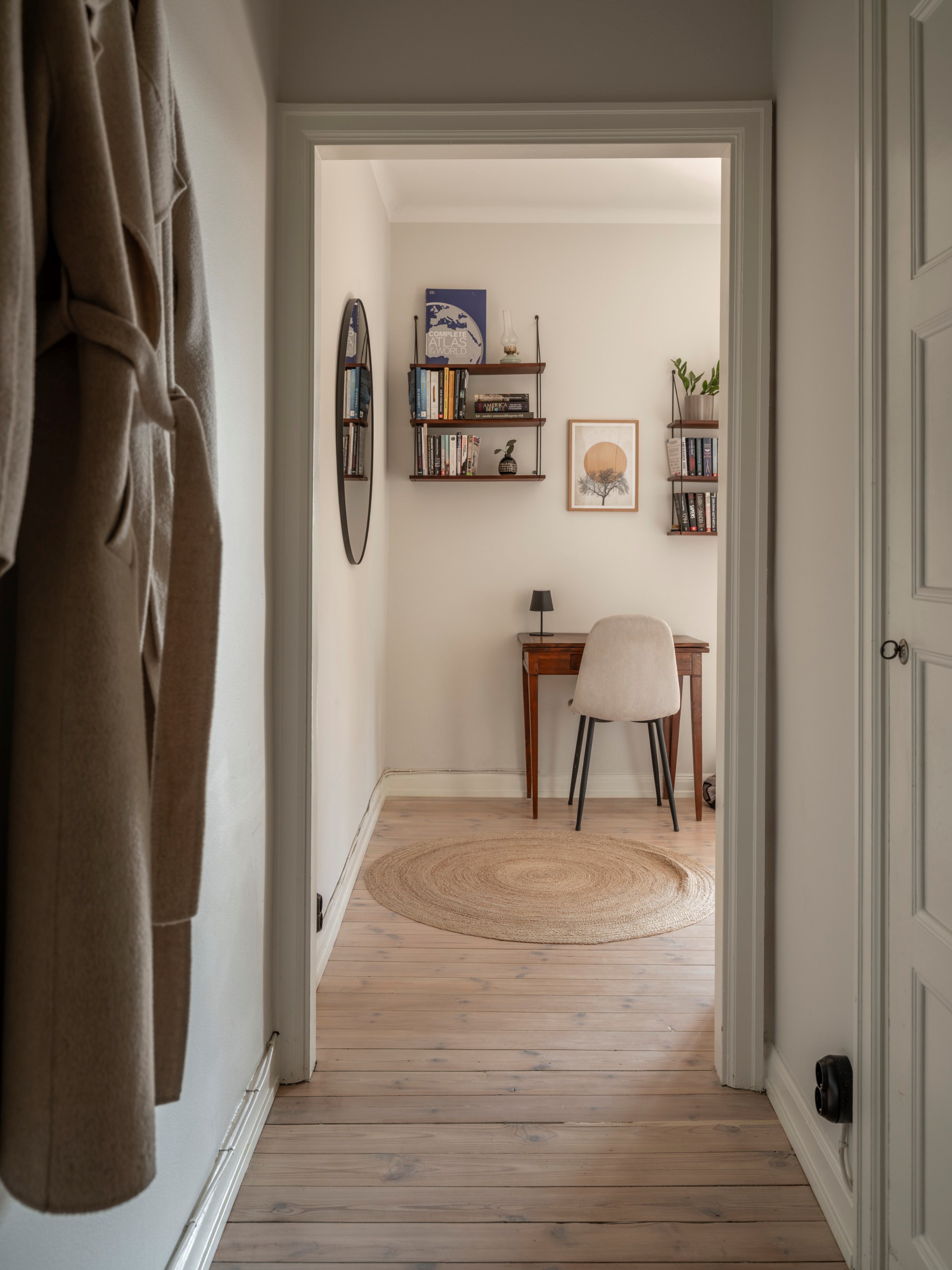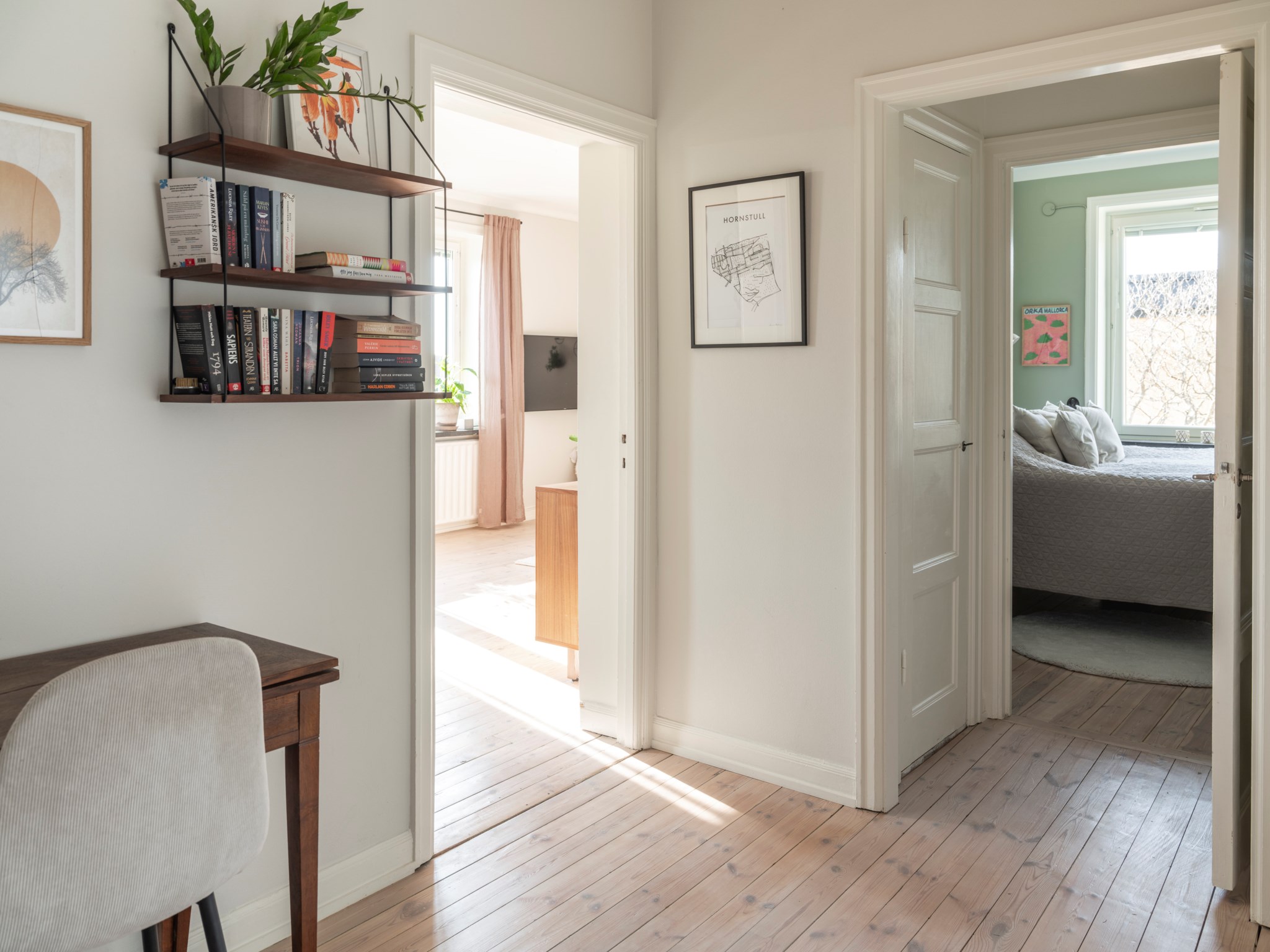 Rymlig möblerbar hall med plats för arbetsplats eller mindre sittgrupp. Ljust slipat originalgolv samt målade väggar.