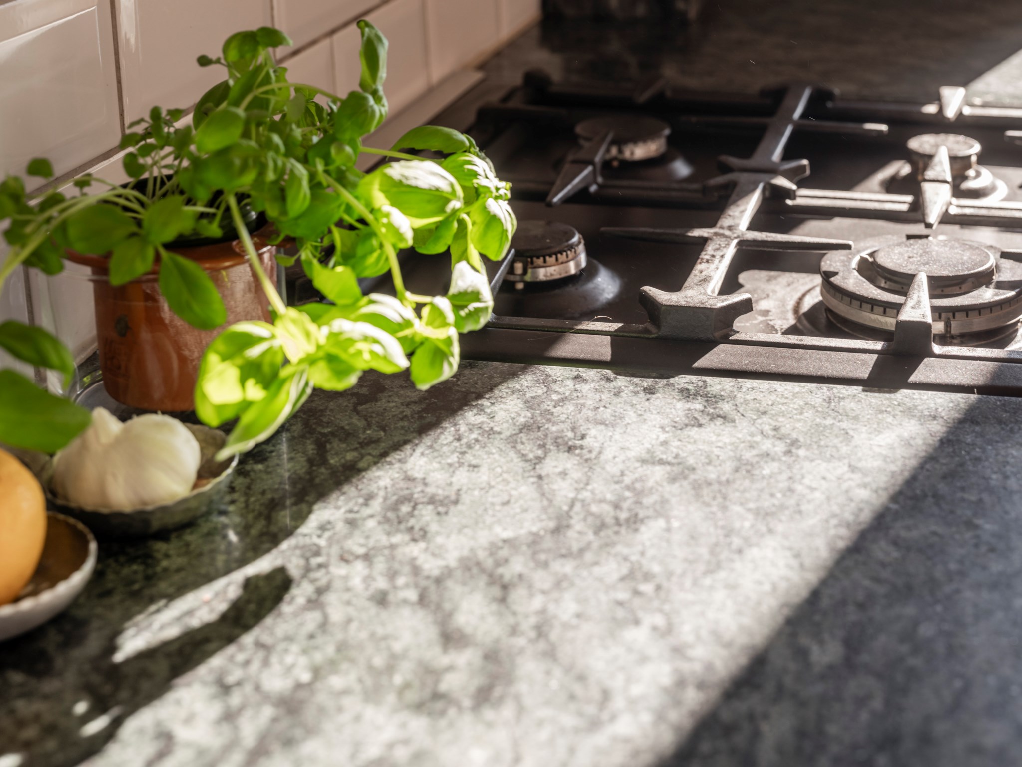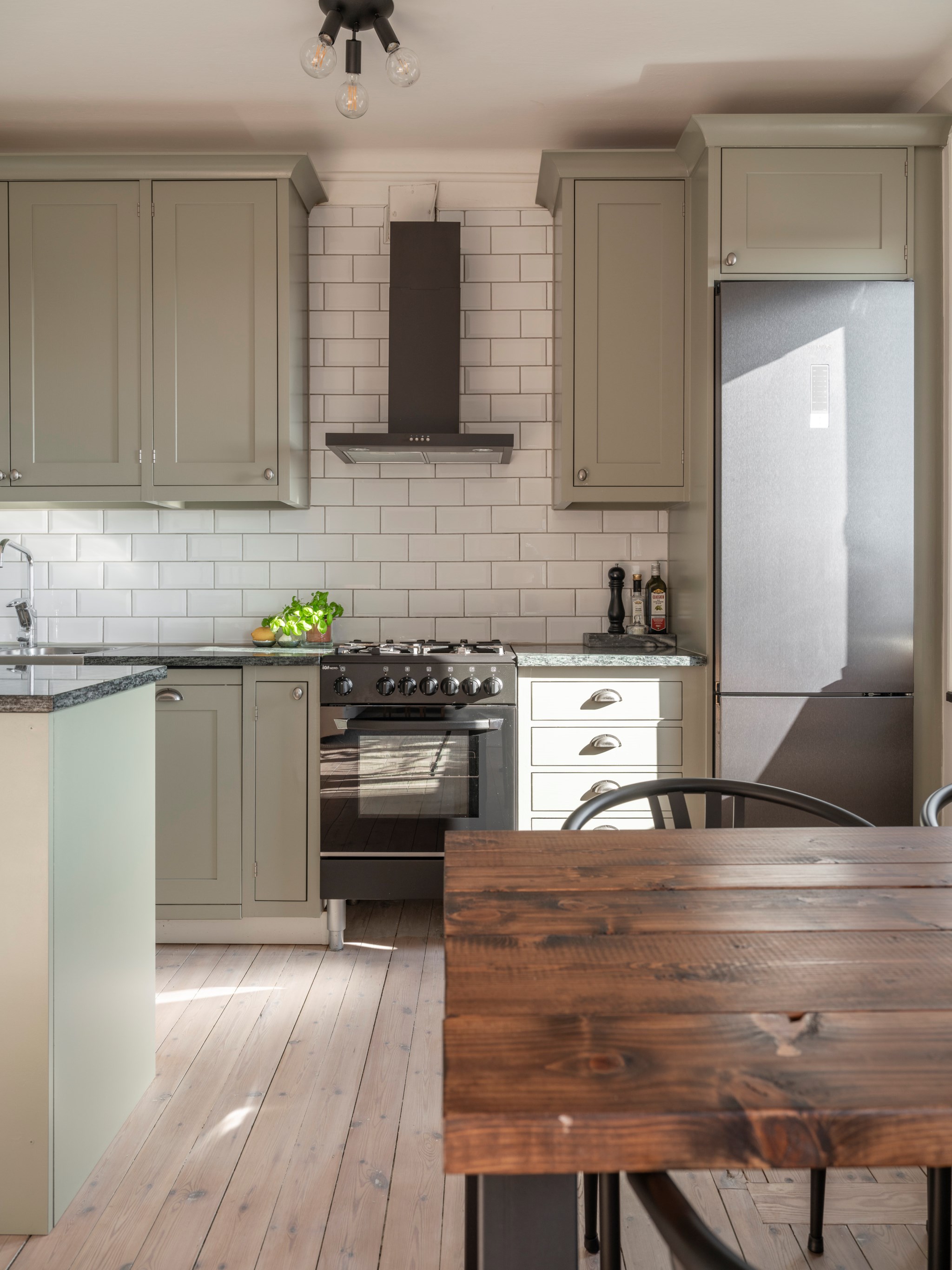 Härligt platsbyggt kök från Kvänum med gasspis, fläkt, diskmaskin samt kyl och frys. Smakfulla granitbänkskivor och en praktisk köksö med god förvaring. Social planlösning mot vardagsrum.