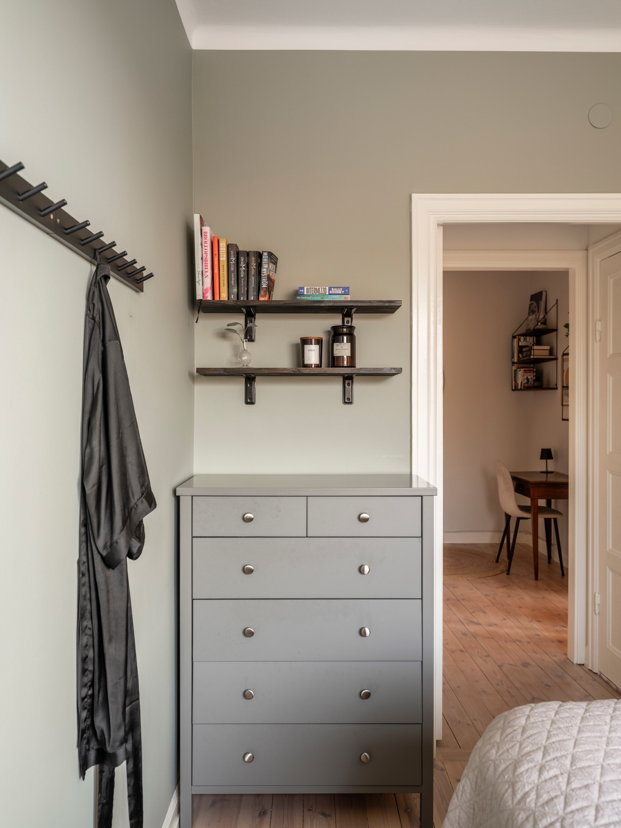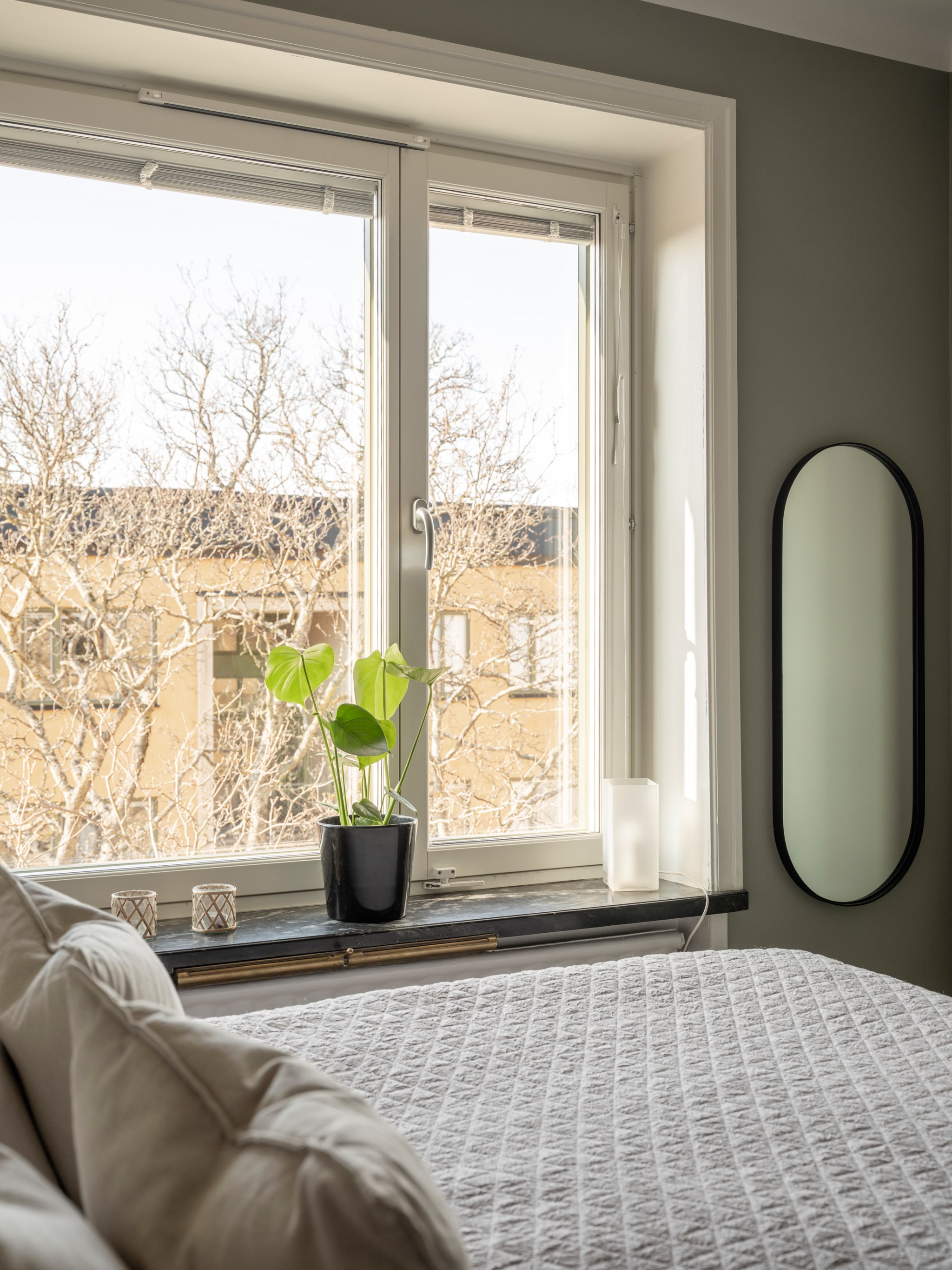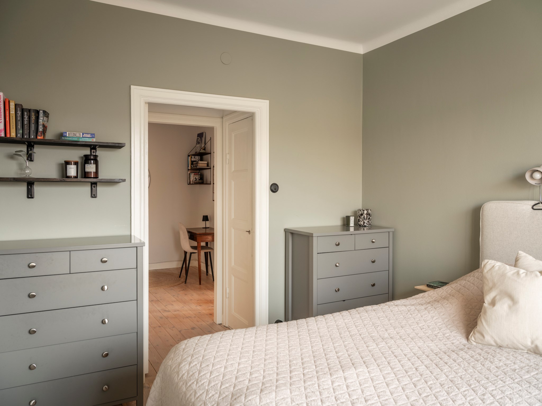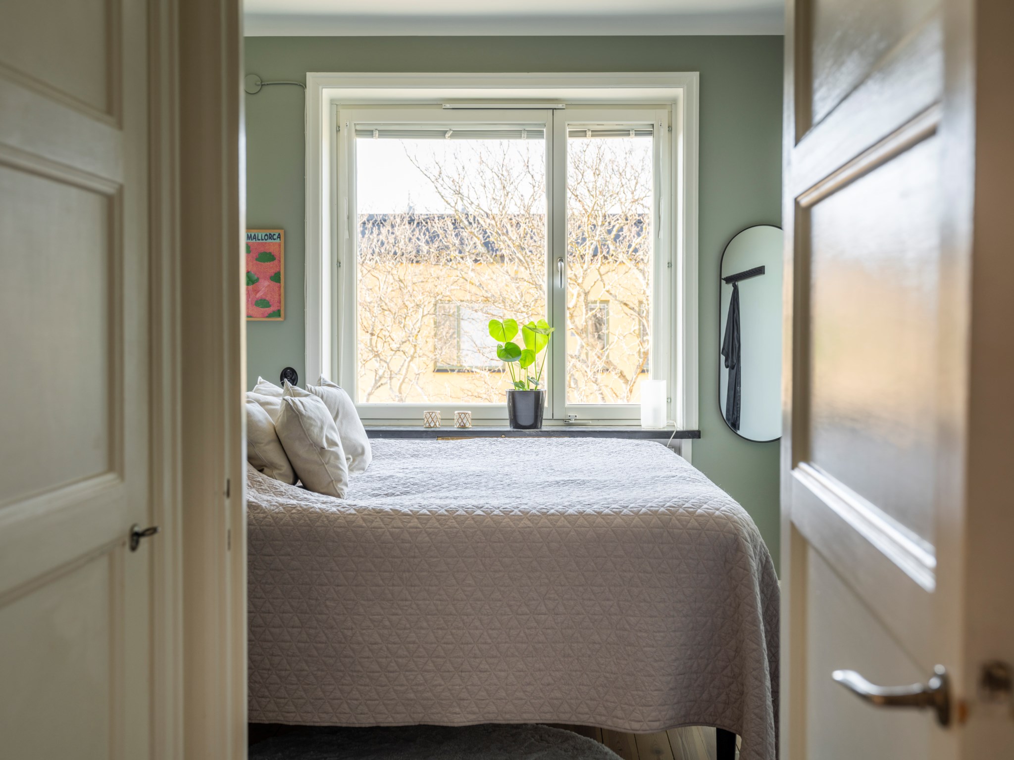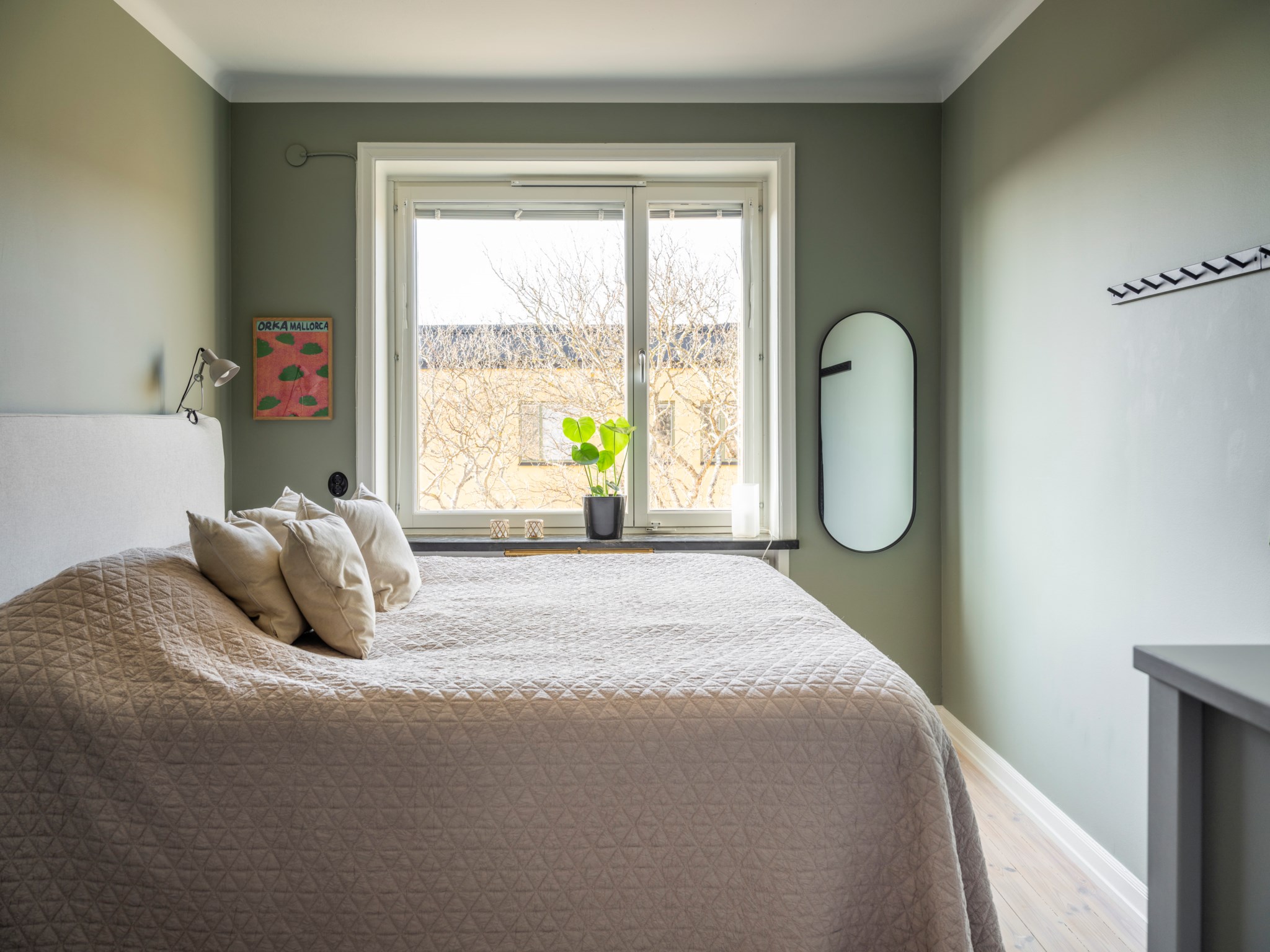 Stort mysigt sovrum med plats för dubbelsäng. Fint ljusinsläpp via stort fönster. Målade väggar och ljust originalgolv. Gott om förvaring i dubbla platsbyggda garderober i passagen in till sovrummet.