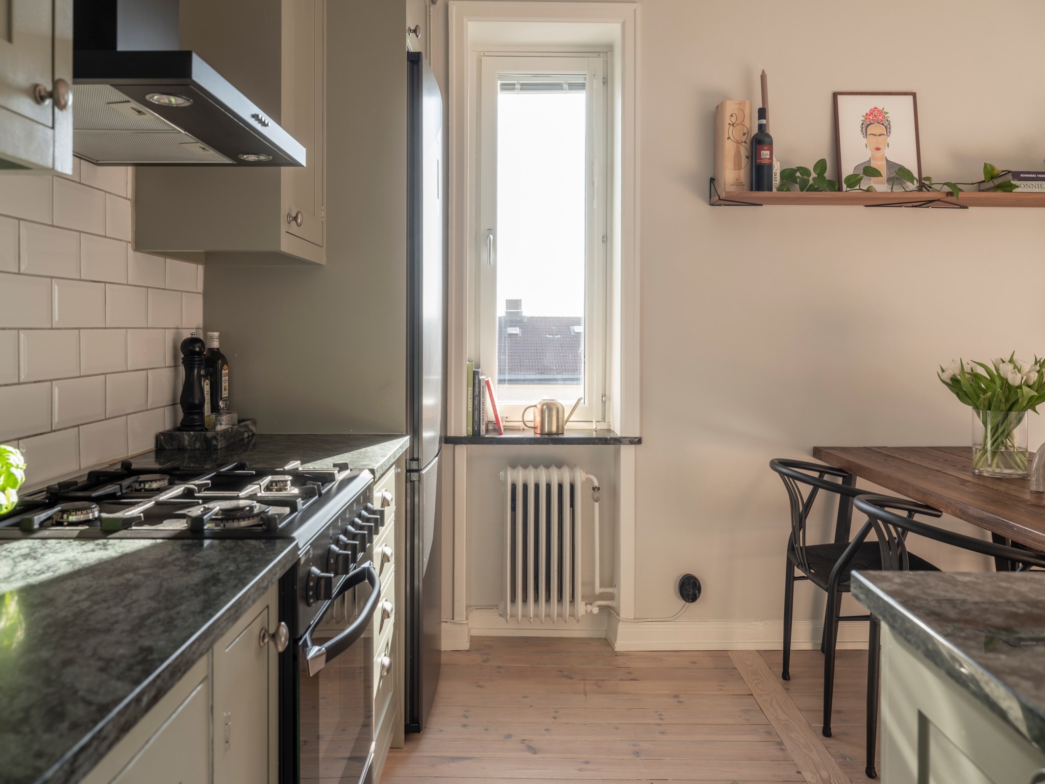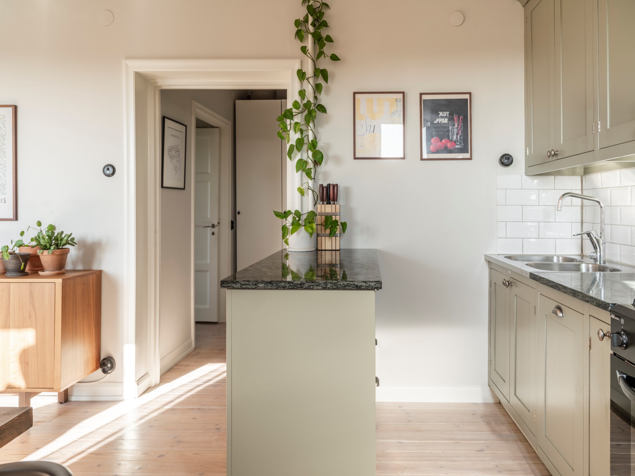 Det påkostade köket från Kvänum är stilrent och platsbyggt med god förvaring bakom målade gröna fronter samt full maskinell utrustning. Här finns en öppen planlösning mot vardagsrummet och en praktisk köksö som erbjuder extra arbetsyta och förvaring. Sovrummet ligger i ett rofyllt läge och erbjuder bra förvaring. Badrummet nås via hallen och är smakfullt renoverat med detaljer i mässing. Den rymliga, möblerbara inre hallen ger extra flexibilitet och lämpar sig utmärkt som arbetshörna.