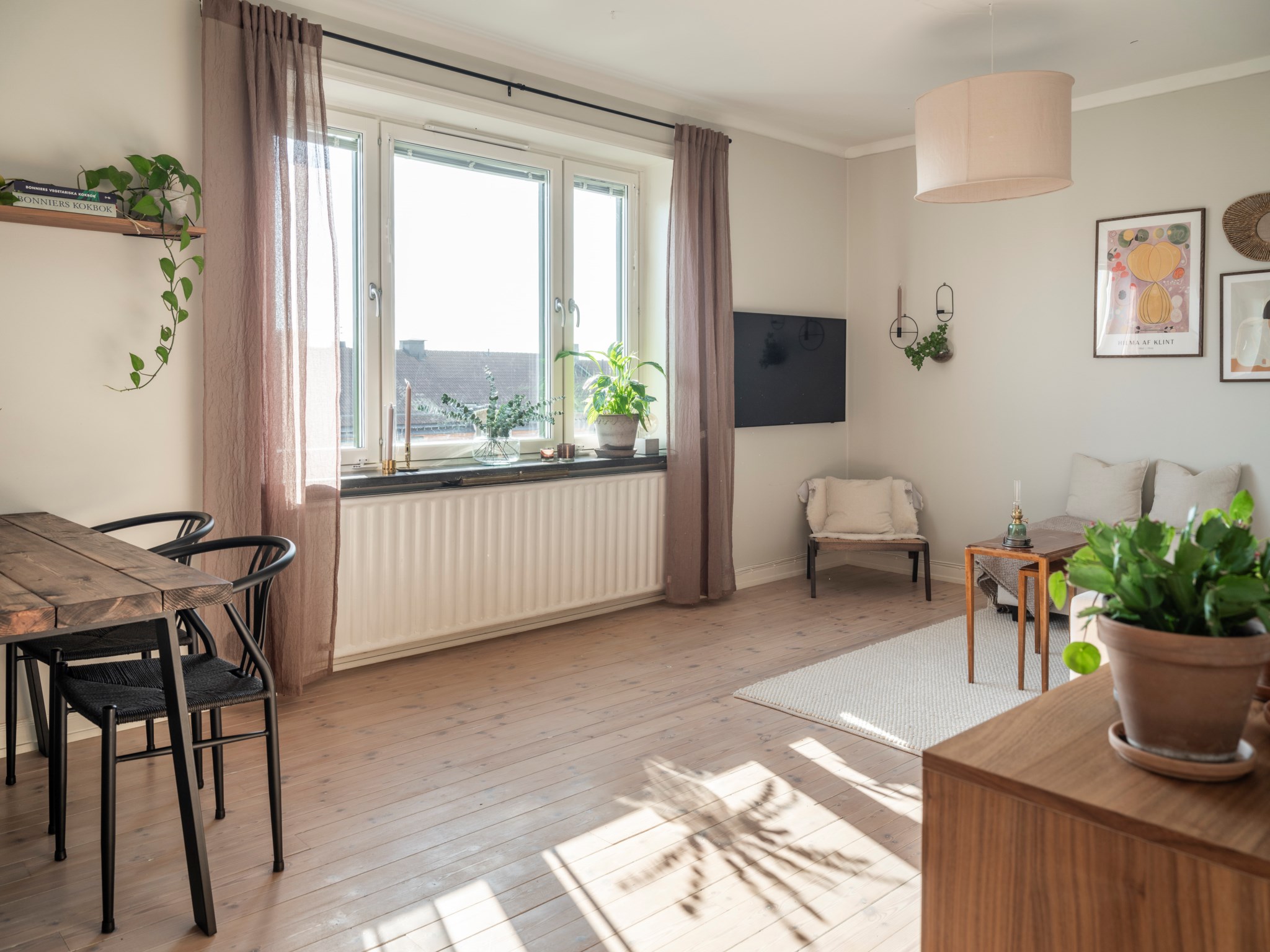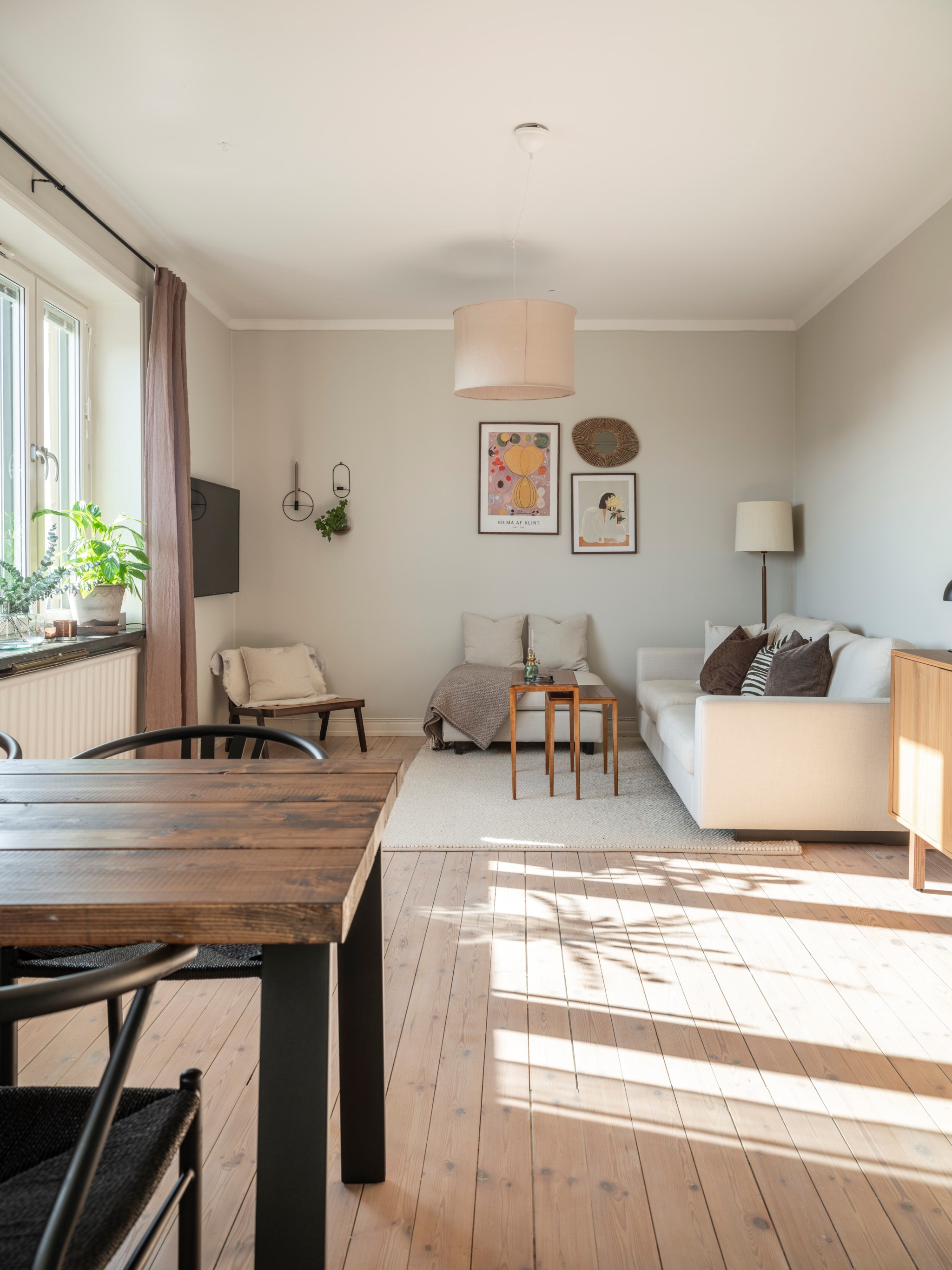Härligt vardagsrum med plats för både matbord och soffgrupp. Målade väggar och vackert plankgolv.