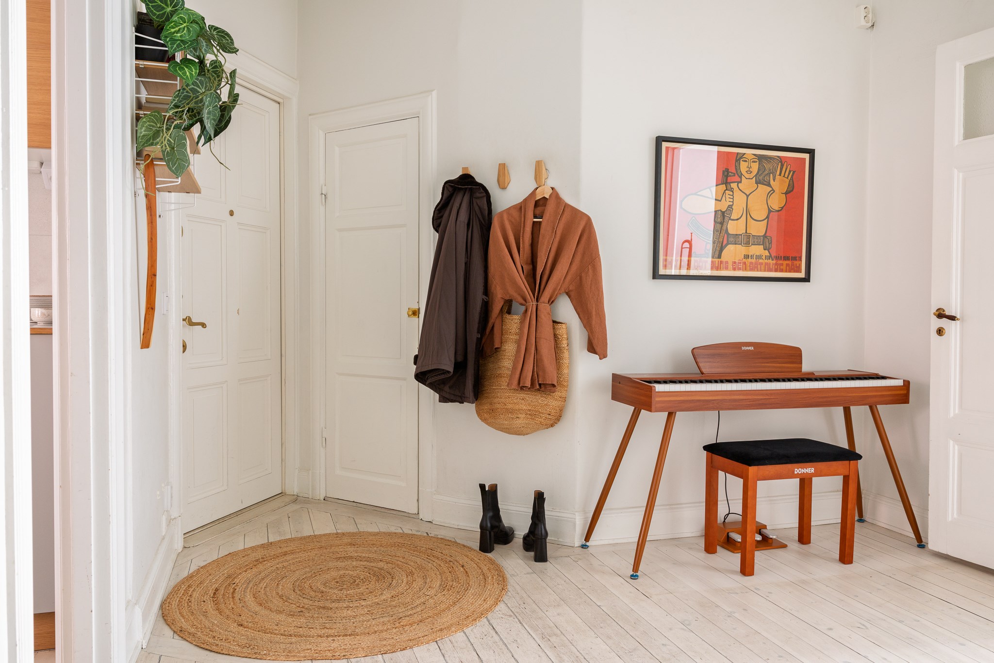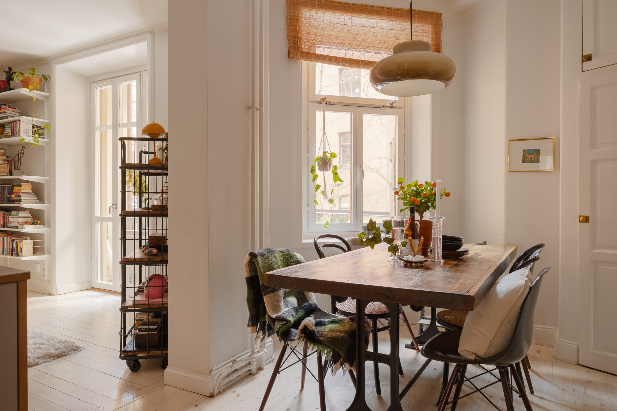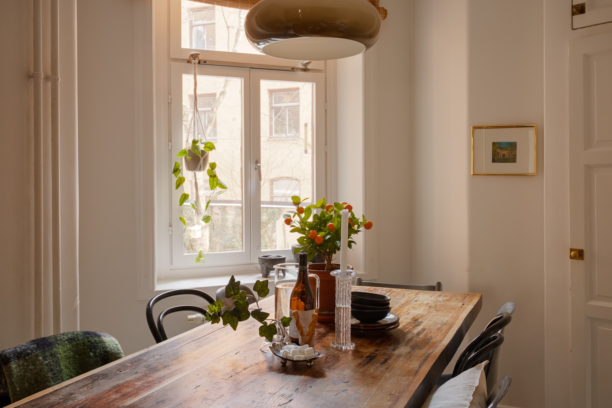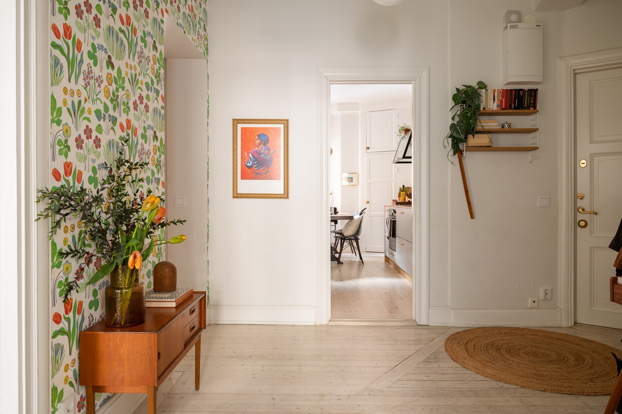 Bostaden präglas av en genomgående planlösning där rummen ligger i vacker fil, vilket skapar ett fantastiskt ljusflöde och en påtaglig känsla av rymd, något som den generösa takhöjden även bidrar till. Utöver detta har bostaden ett nyrenoverat och fullt utrustat kök med goda arbetsytor. Här möts klassisk sekelskifteskaraktär och funktionella ytor i ett hem som upplevs både luftigt och inbjudande. Den ljusa hallen är placerad centralt i bostaden och binder samman rummen på ett naturligt och socialt sätt – perfekt för både vardag och umgänge.