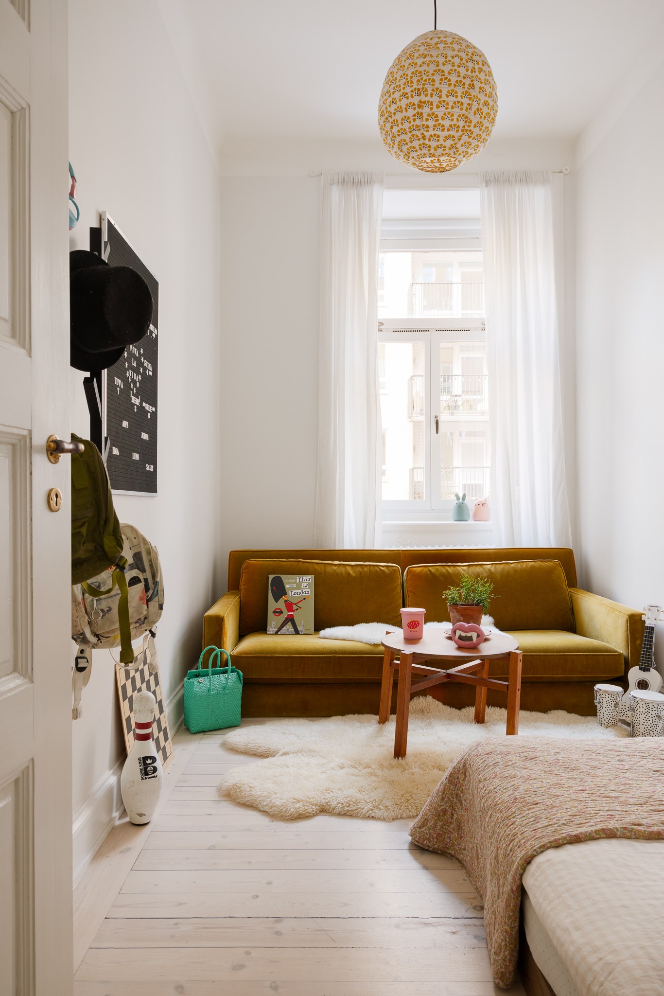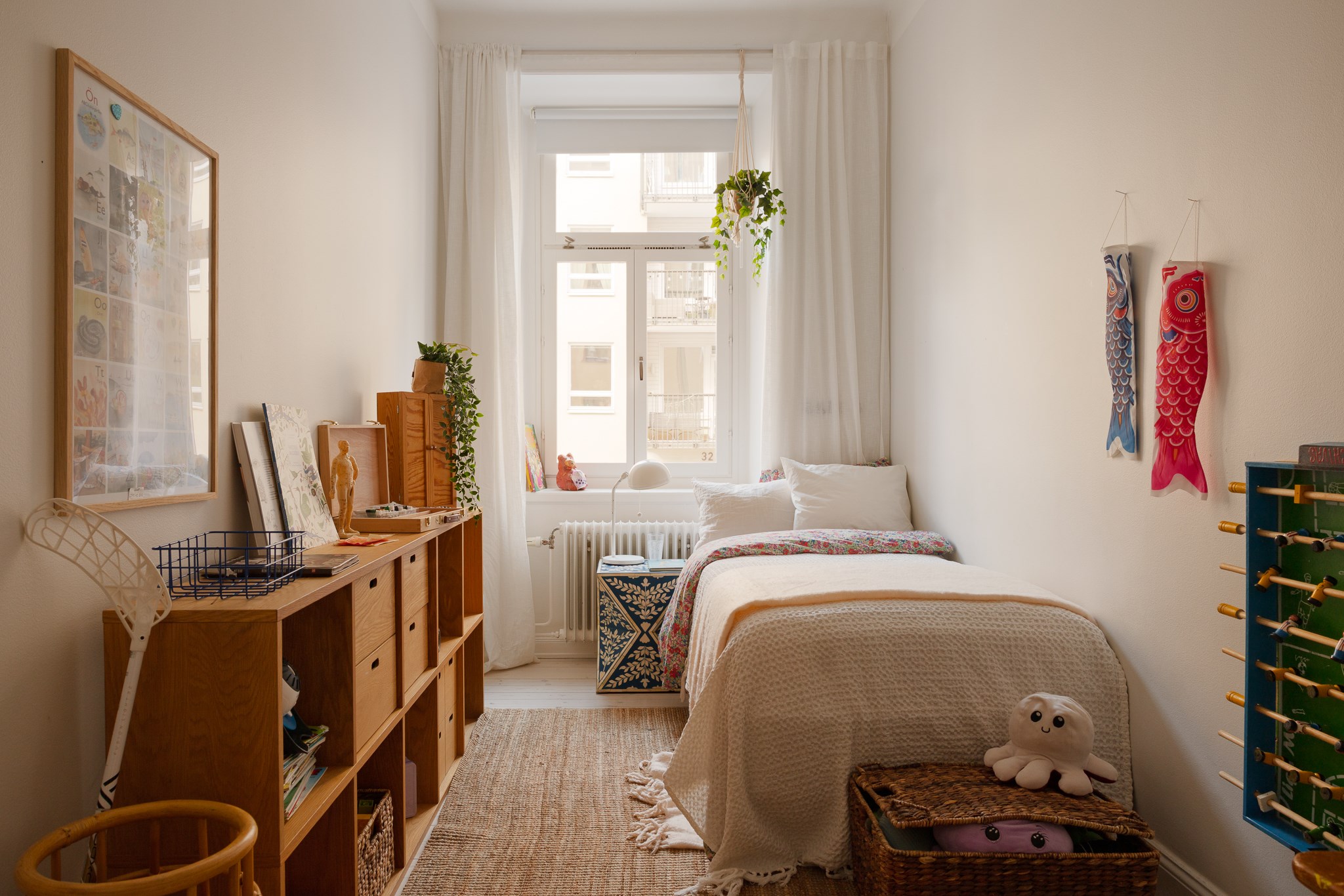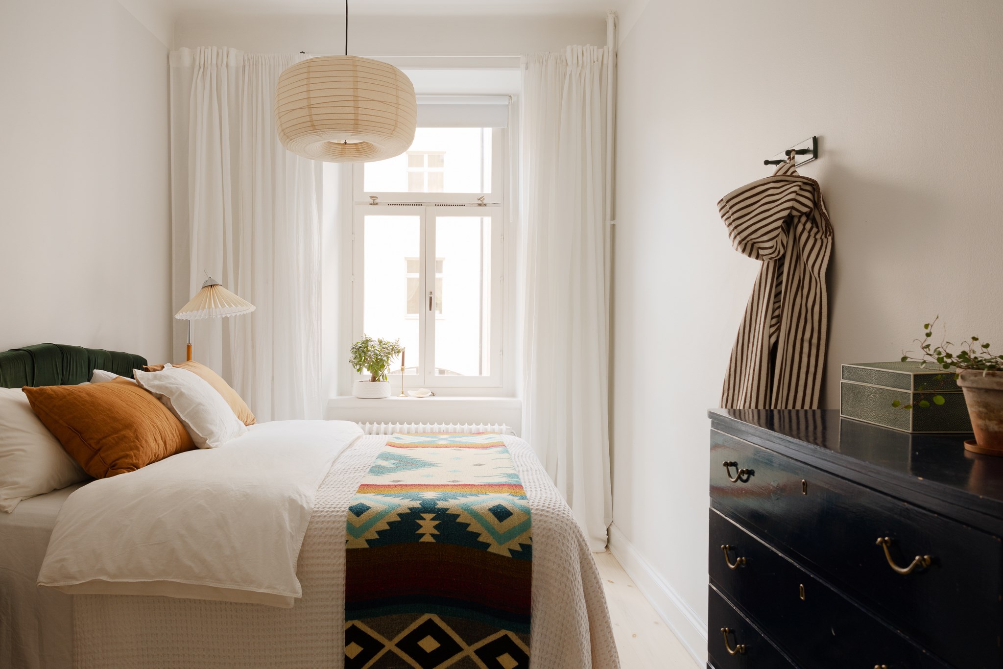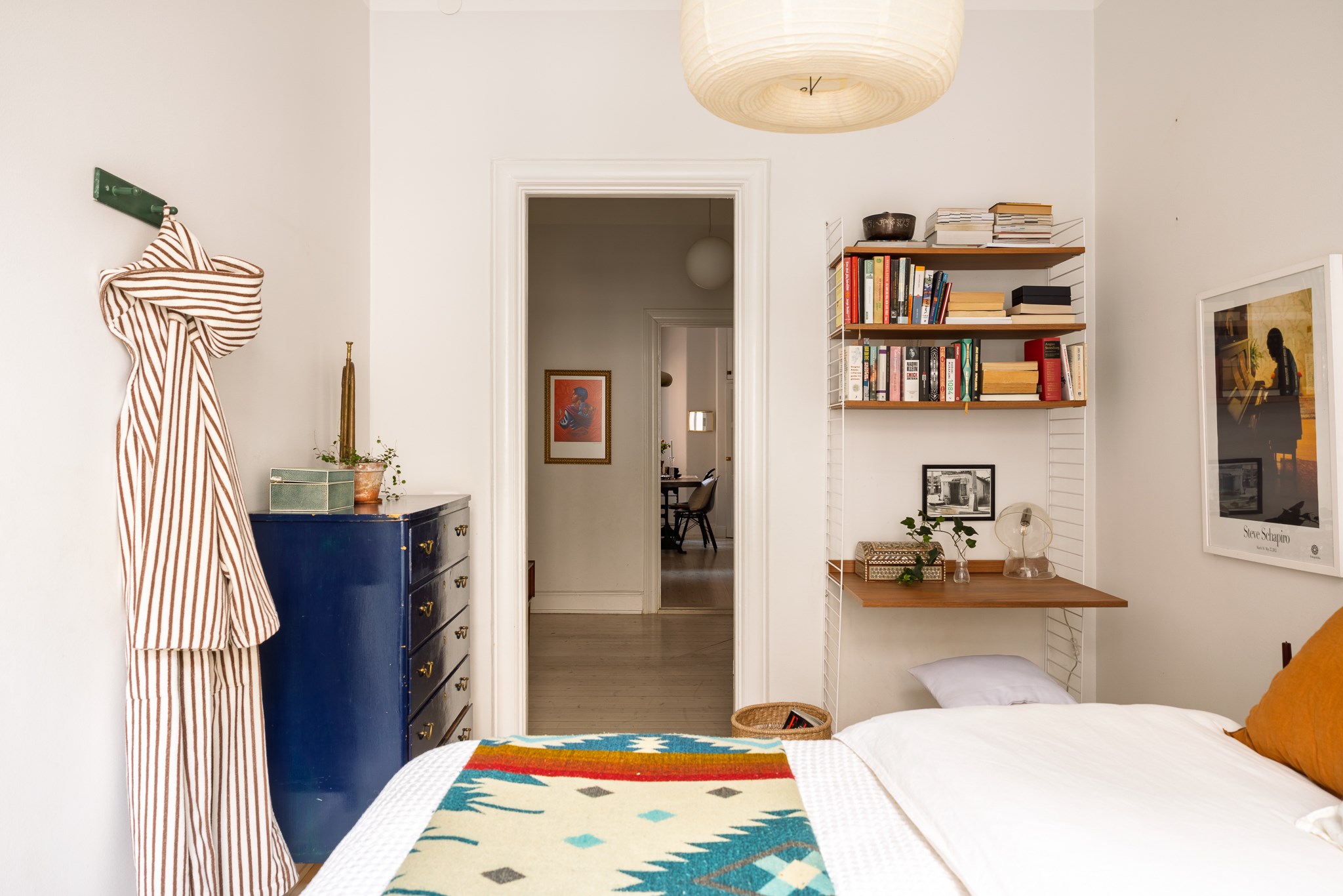 Plats för något större säng samt utökad förvaring och lättare möblemang.