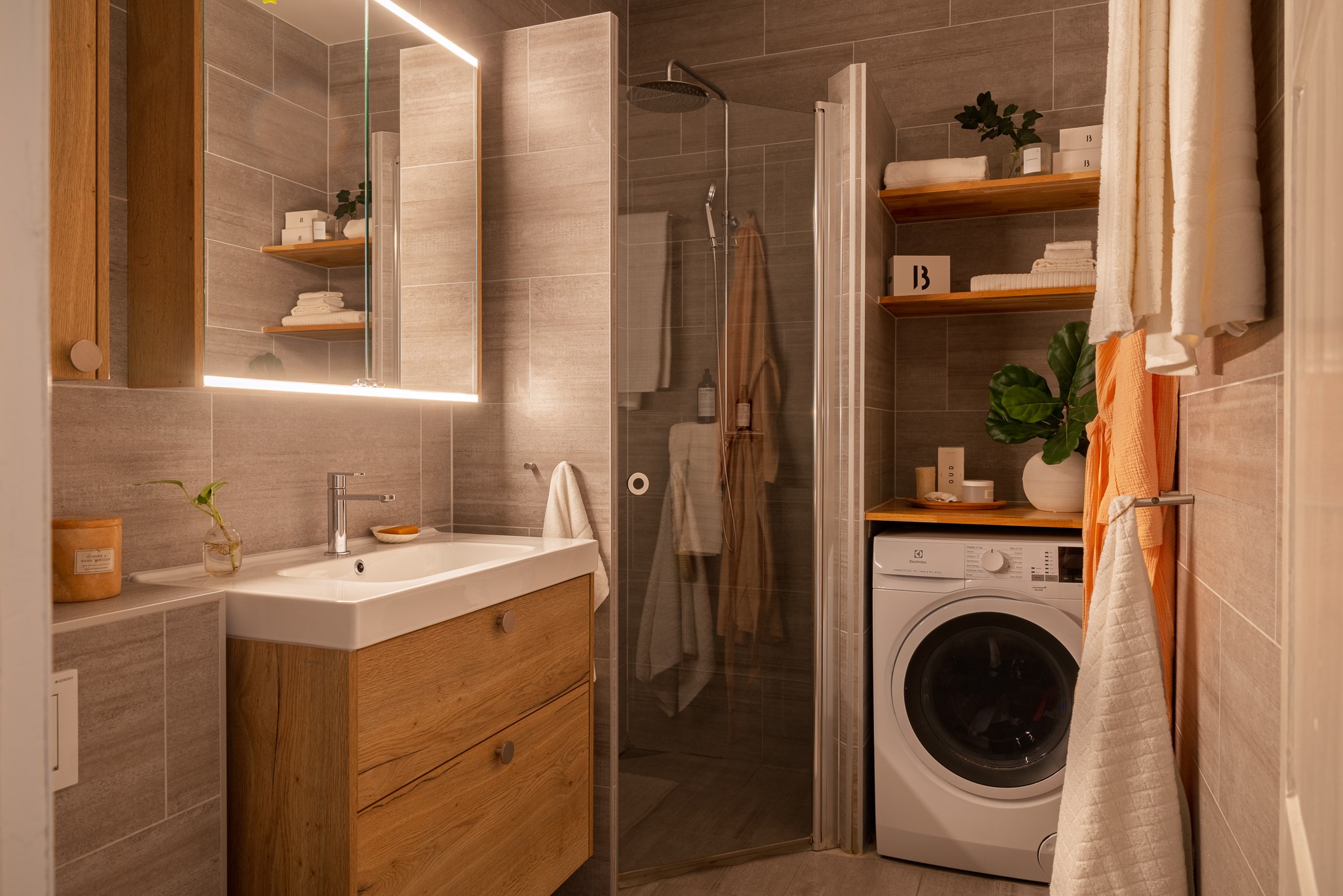 Nyrenoverat badrum I modern stil och funktionalitet. Tvättmaskin, dusch med skiljevägg samt handfat och kommod. Spegelskåp och yta för ytterligare förvaring.