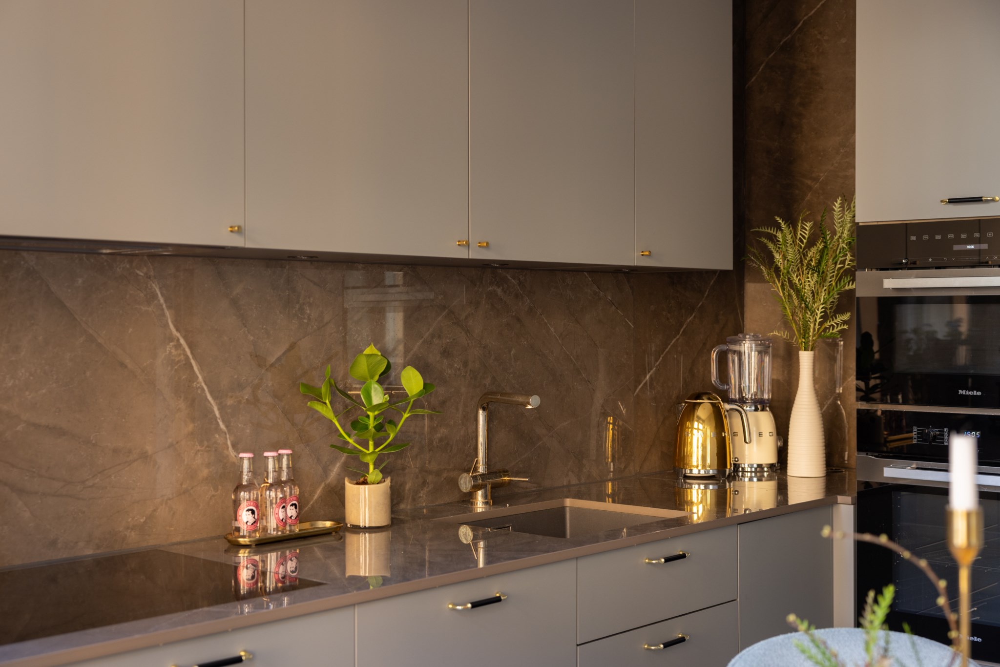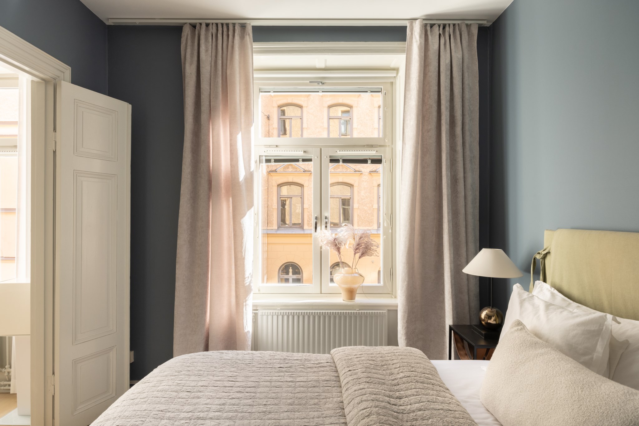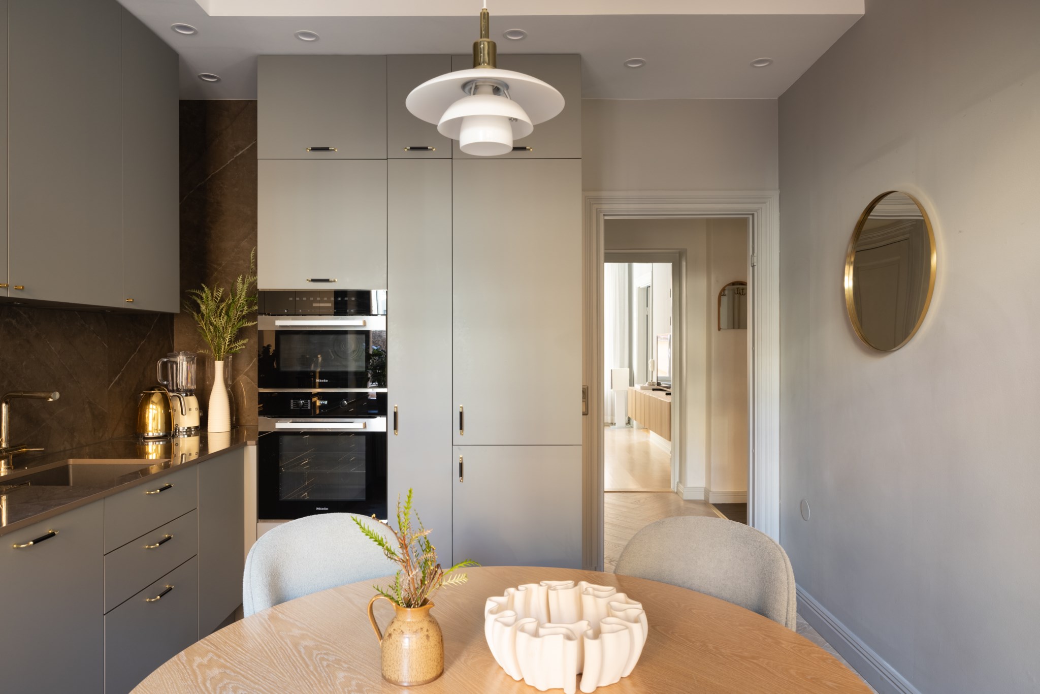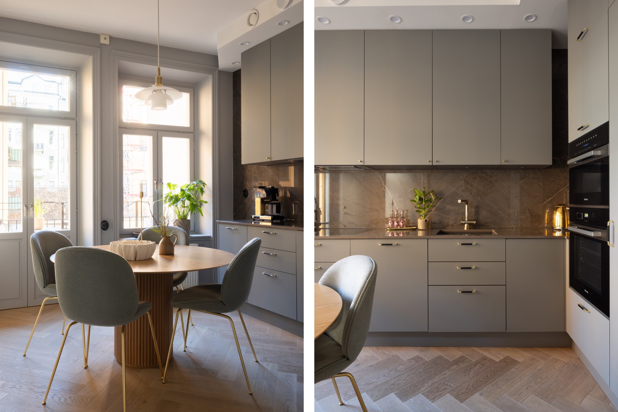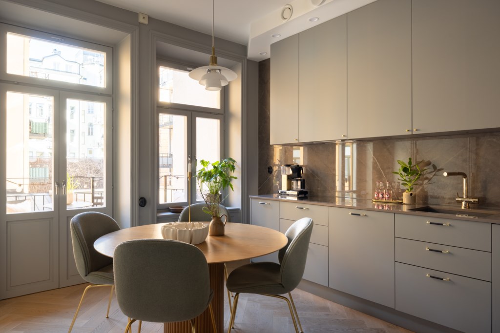 Köket är stilrent renoverat med noggrant utvalda och italienskproducerade materialval med hög kvalité från Arredo3 som harmonierar fint med bostadens sekelskifteskaraktär. Här finns generösa arbetsytor, goda förvaringsmöjligheter och plats för ett matbord där både vardagsmiddagar och trevliga middagsbjudningar får gott om utrymme. Från köket nås även balkongen som vetter mot föreningens lugna och grönskande innergård – en perfekt plats för en stunds avkoppling under varmare dagar.