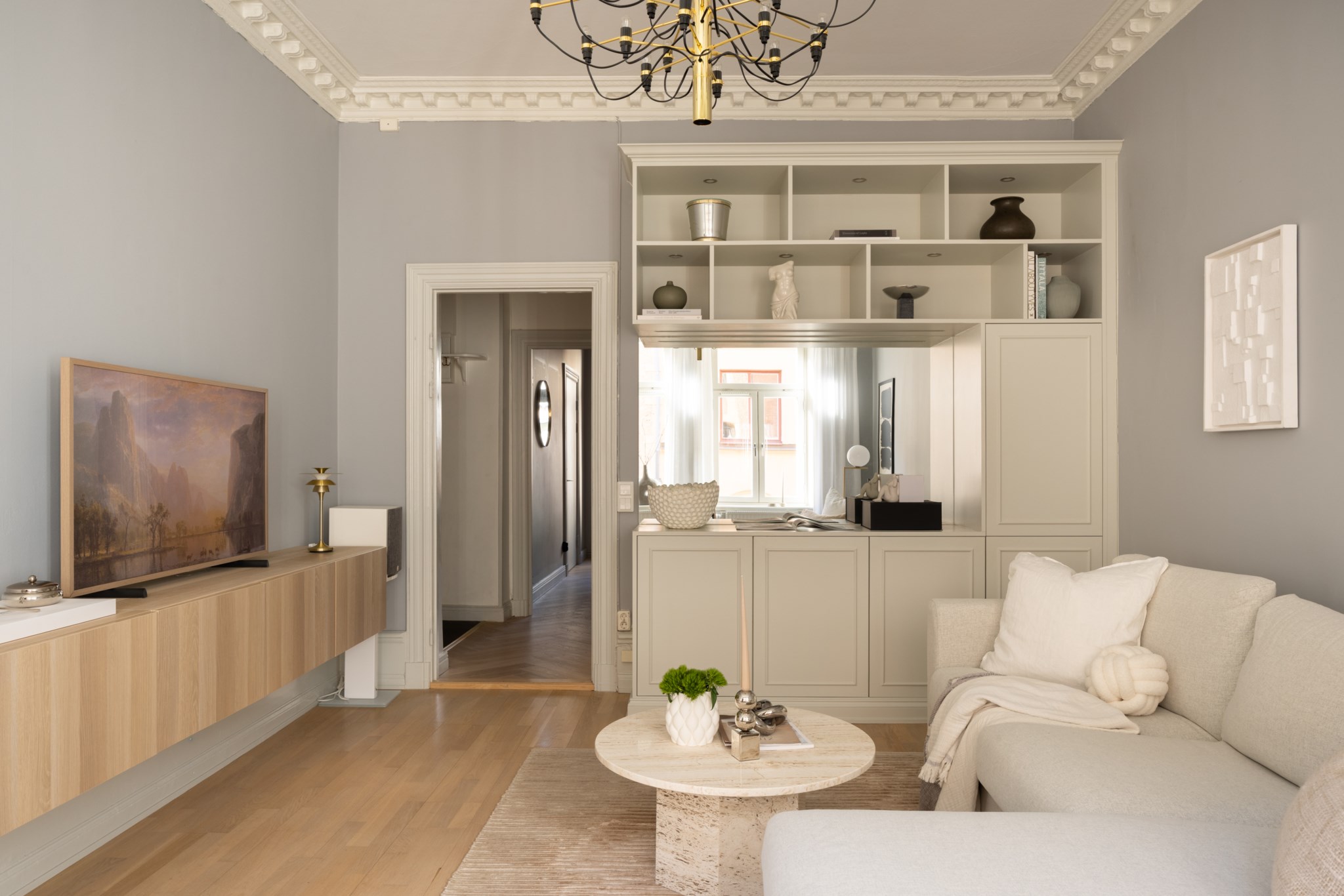 Det rymliga sällskapsrummet är bostadens naturliga samlingspunkt och erbjuder gott om plats för en större soffgrupp, bokhyllor och övrigt möblemang för den som vill skapa ett trivsamt vardagsrum för både avkoppling och sociala tillställningar. Den platsbyggda bokhyllan ger både karaktär och praktisk förvaring, och bidrar till rummets klassiska känsla.