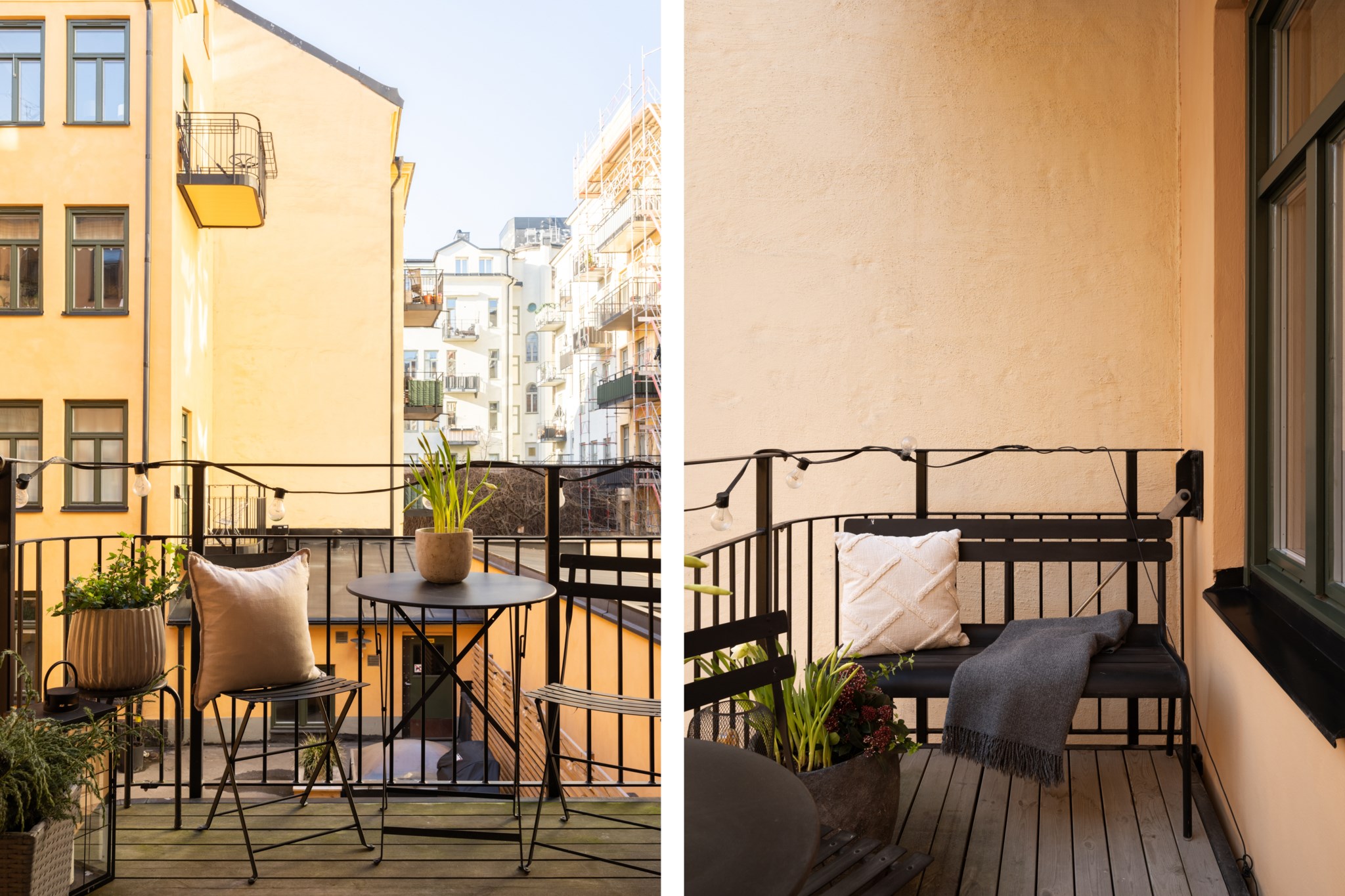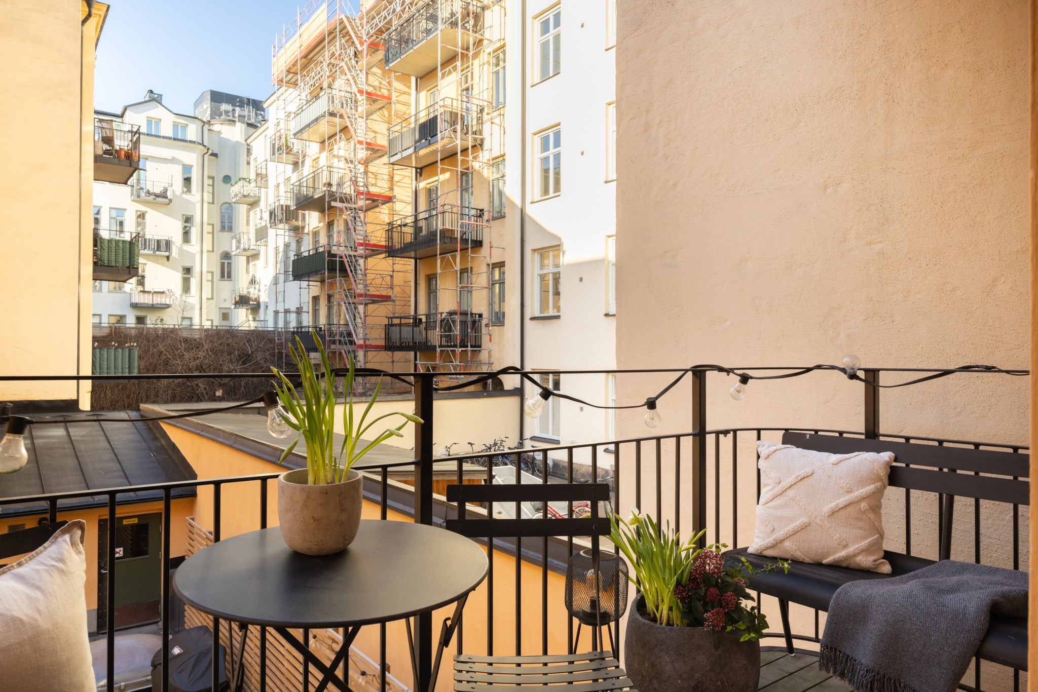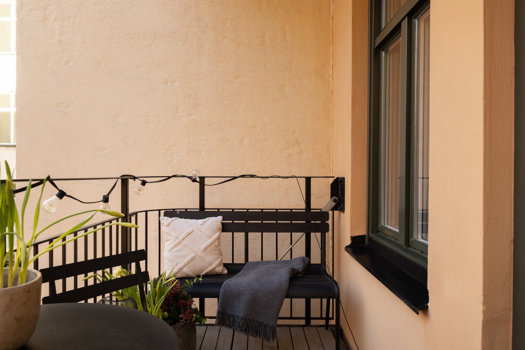 Till lägenheten hör en rymlig balkong. Här finns gott om plats för möblering och planteringar.