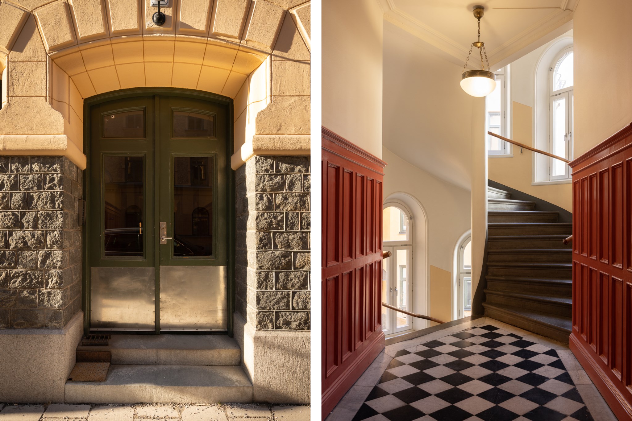 Välkomnande hall med plats för avhängning och gott om förvaring via dubbla garderober. I hallen möts du direkt av lägenhetens charm med ytskikt bestående av stengolv i grått som möter den ljusa fiskbensparketten. Säkerhetsdörr.