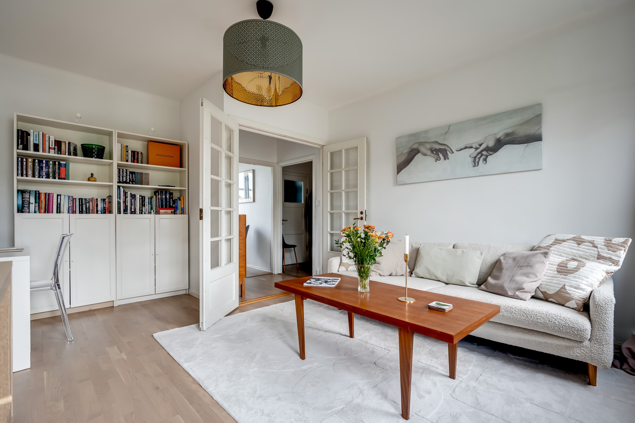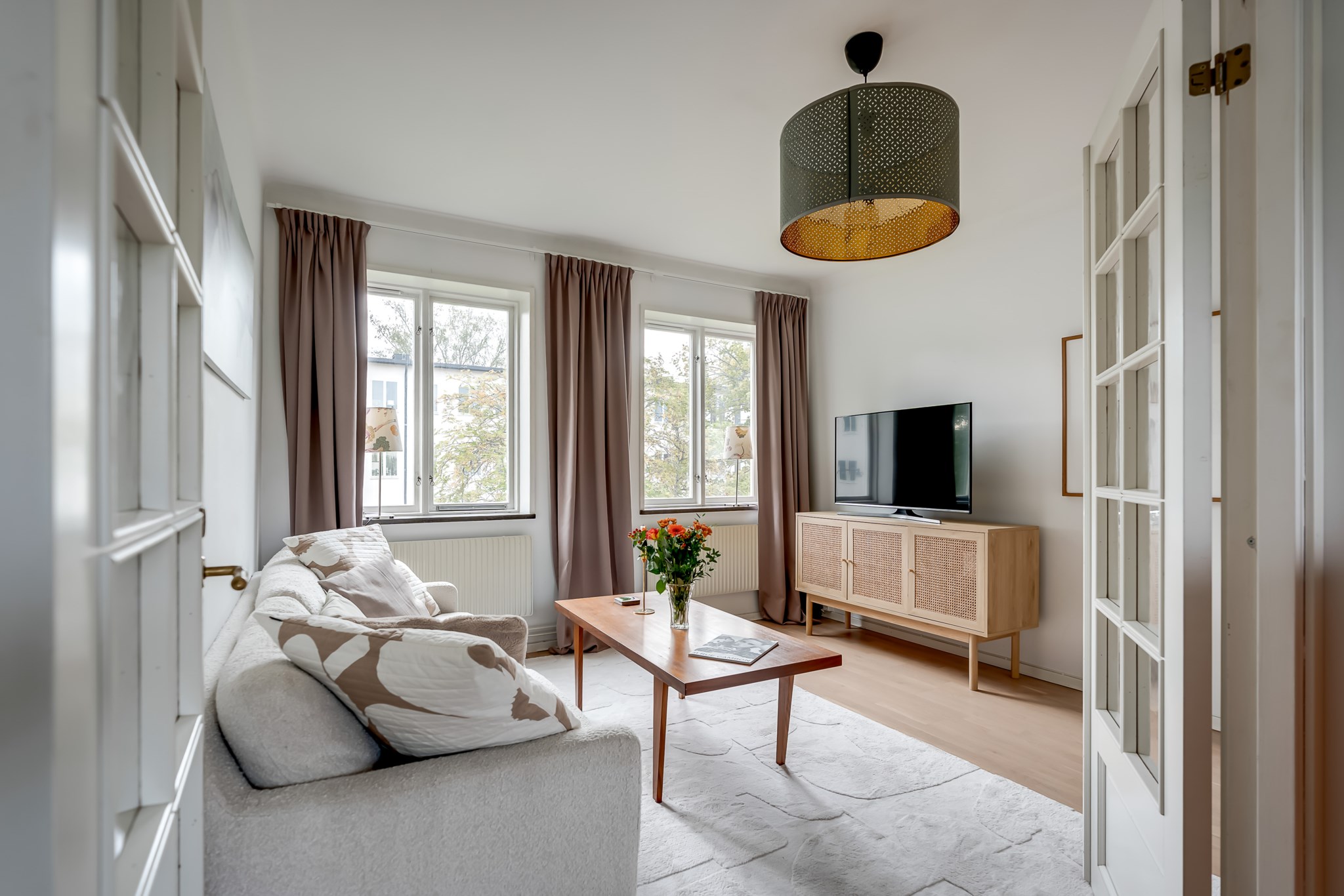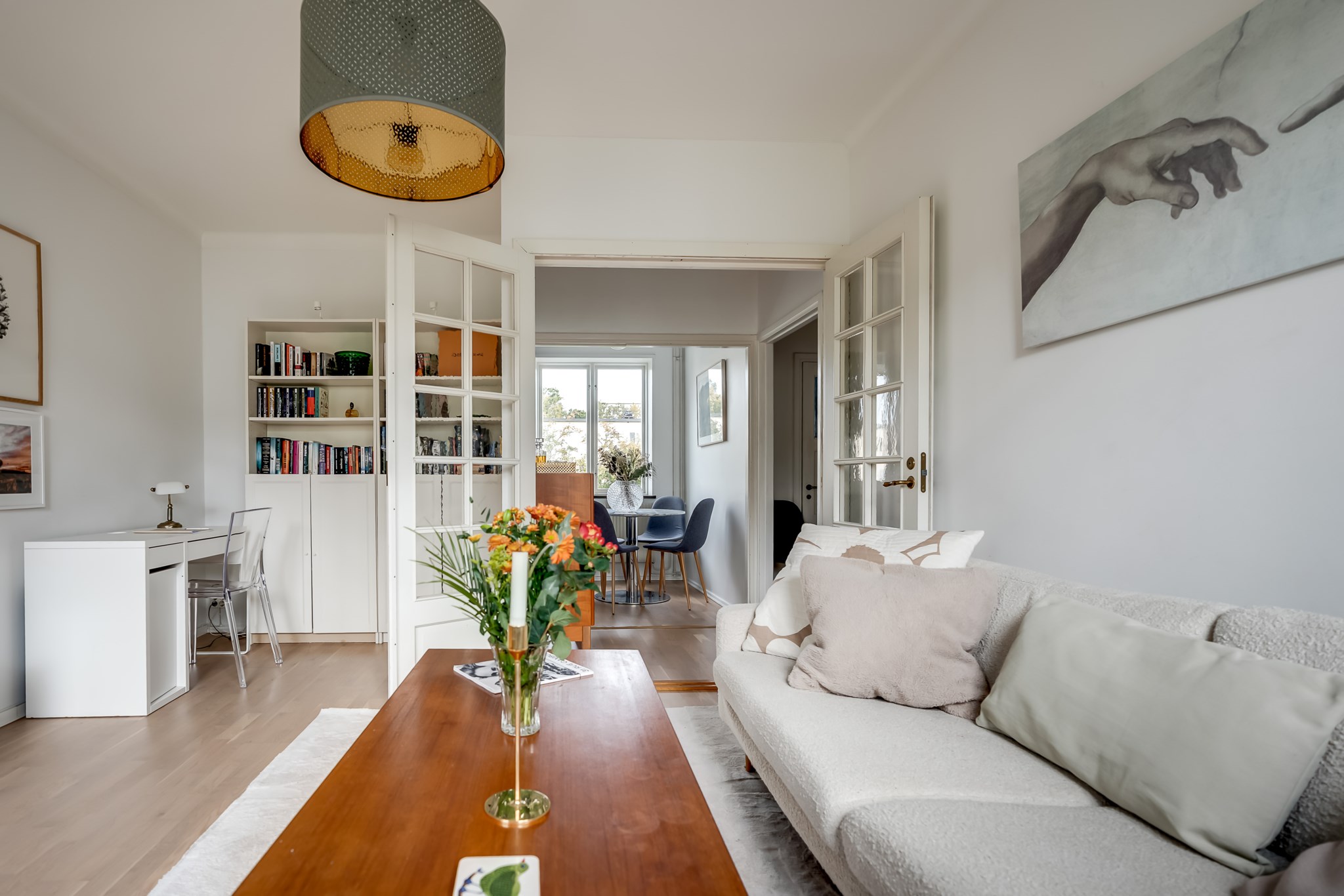 Ljust vardagsrum med två fönsterpartier som släpper in rikligt med ljus samt eleganta pardörrar med spröjs som öppnar upp mot hall och kök med intilliggande matplats. Här finns plats för soffa och övrig möblering efter smak och behov. Ljusmålade ytskikt och ljust golv.