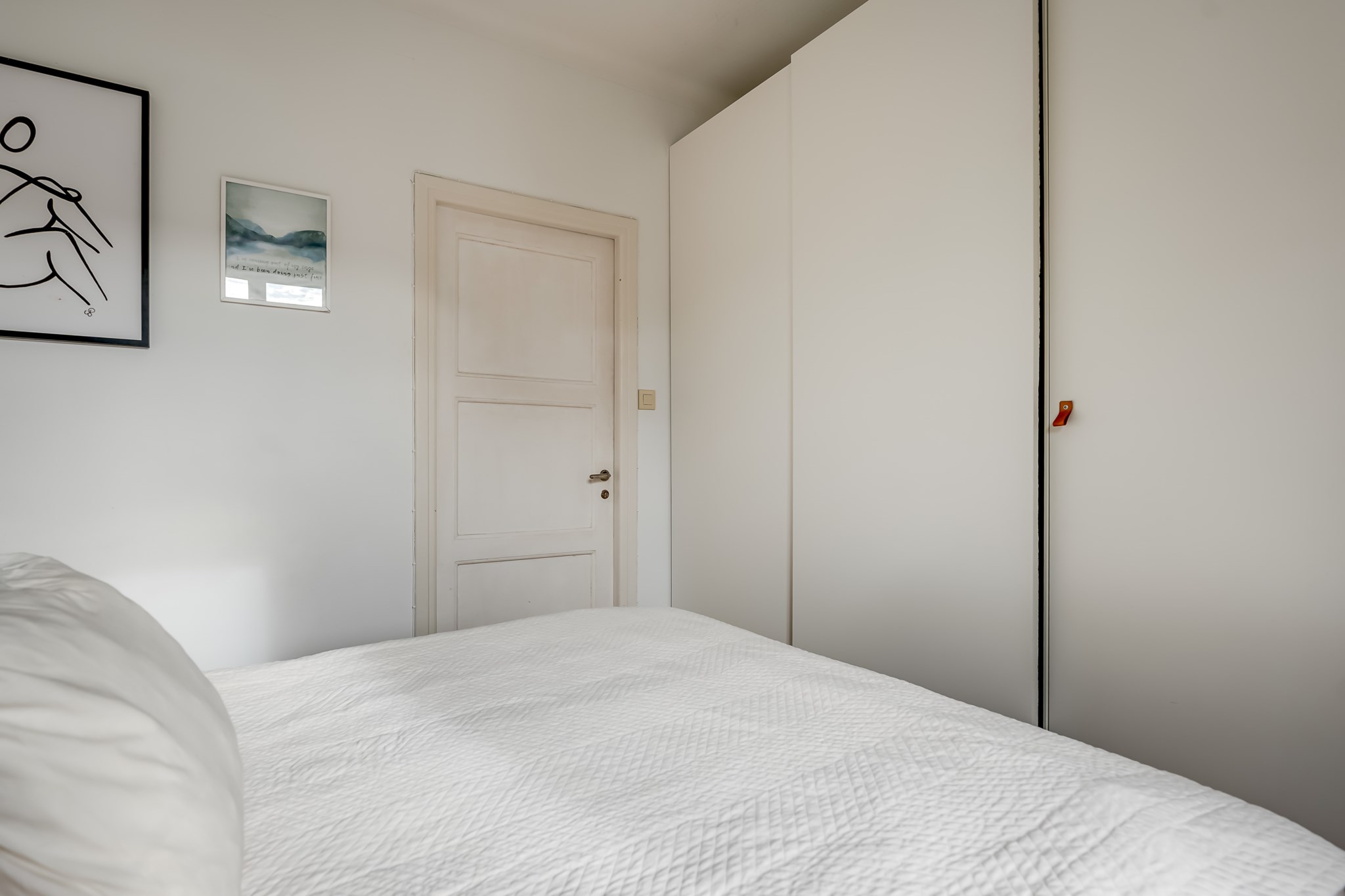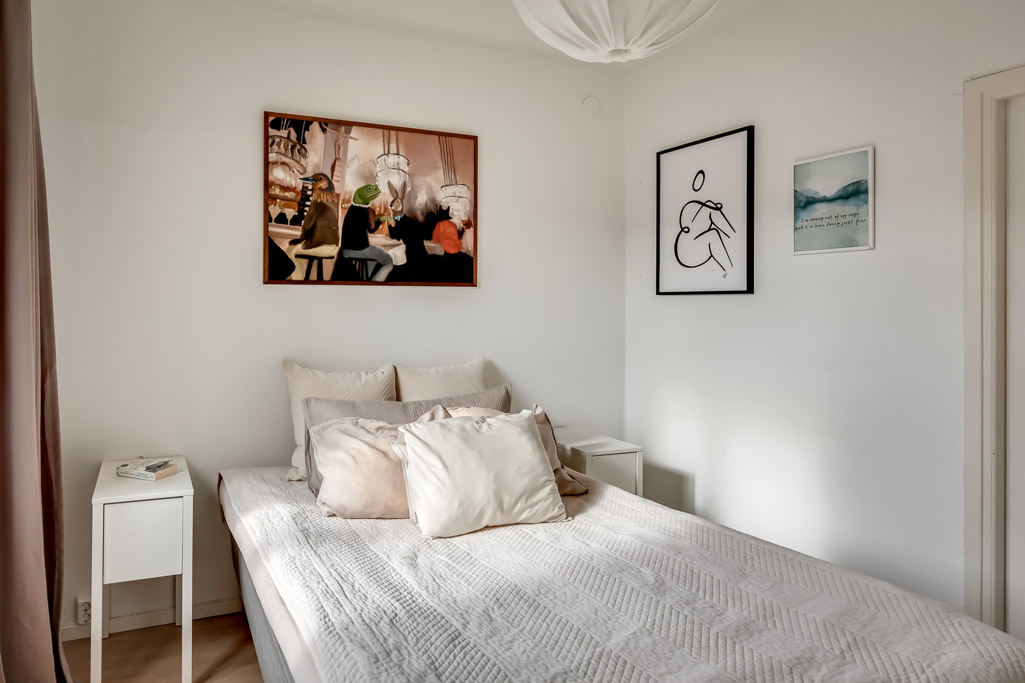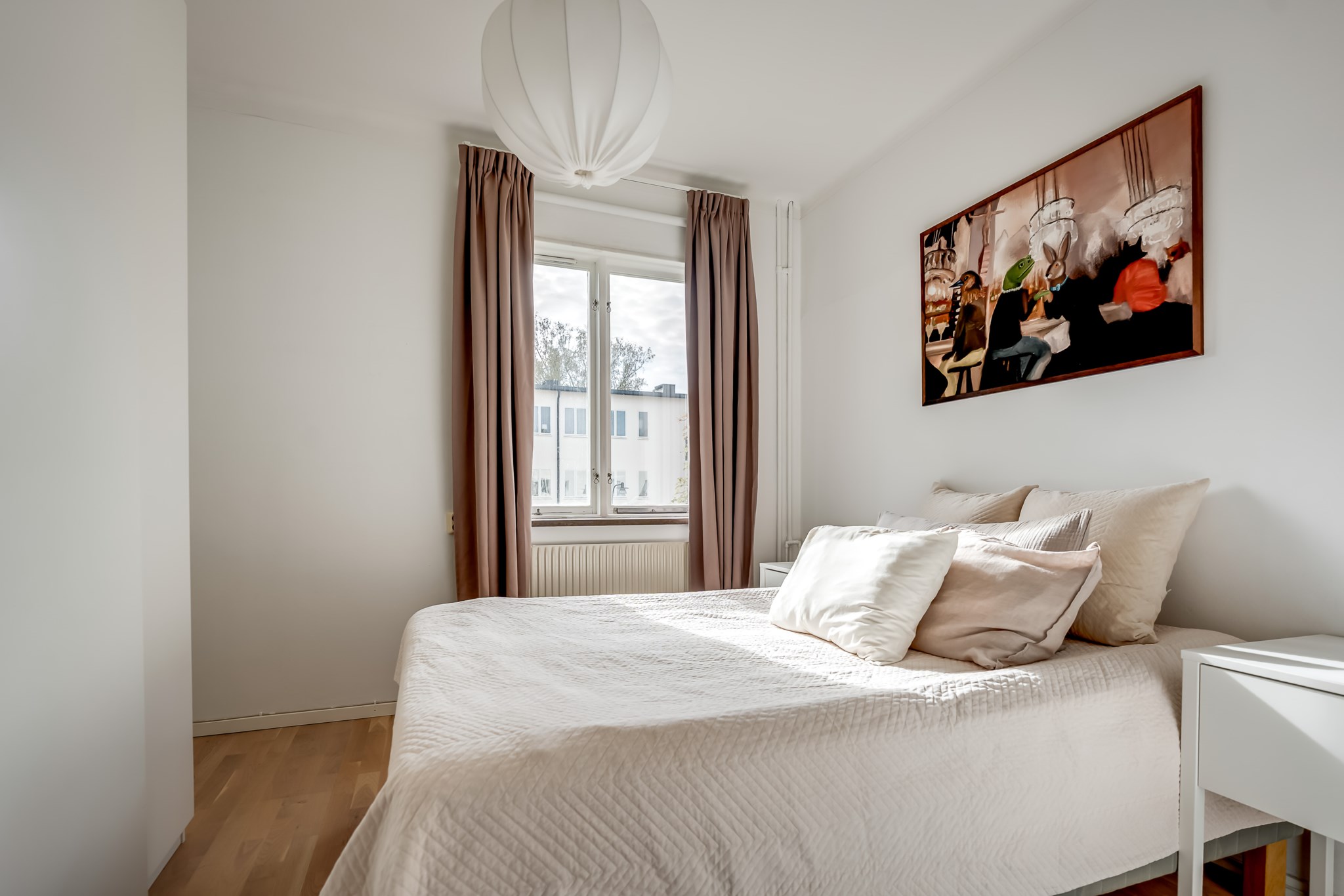 Mysigt sovrum med plats för säng och tillhörande sängbord. Fint ljusinsläpp från fönster och gott om förvaringsmöjligheter i flertalet garderober med skjutdörrar. Ljusmålade ytskikt och ljust golv.
