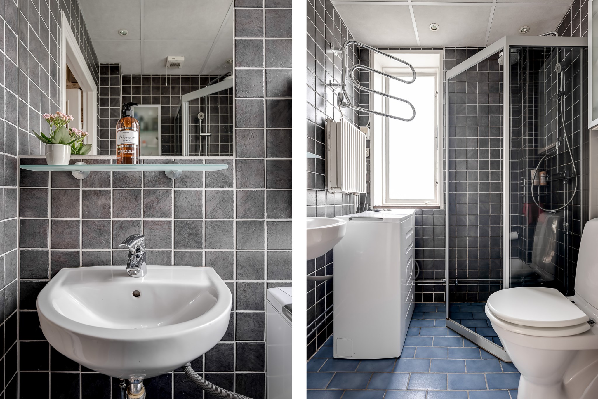 Badrum med kaklade väggar och golv samt ett fönster som tillför naturligt ljus och möjliggör vädring. Badrummet är inrett med WC, handfat, spegel, handdukstork, tvättmaskin samt dusch.