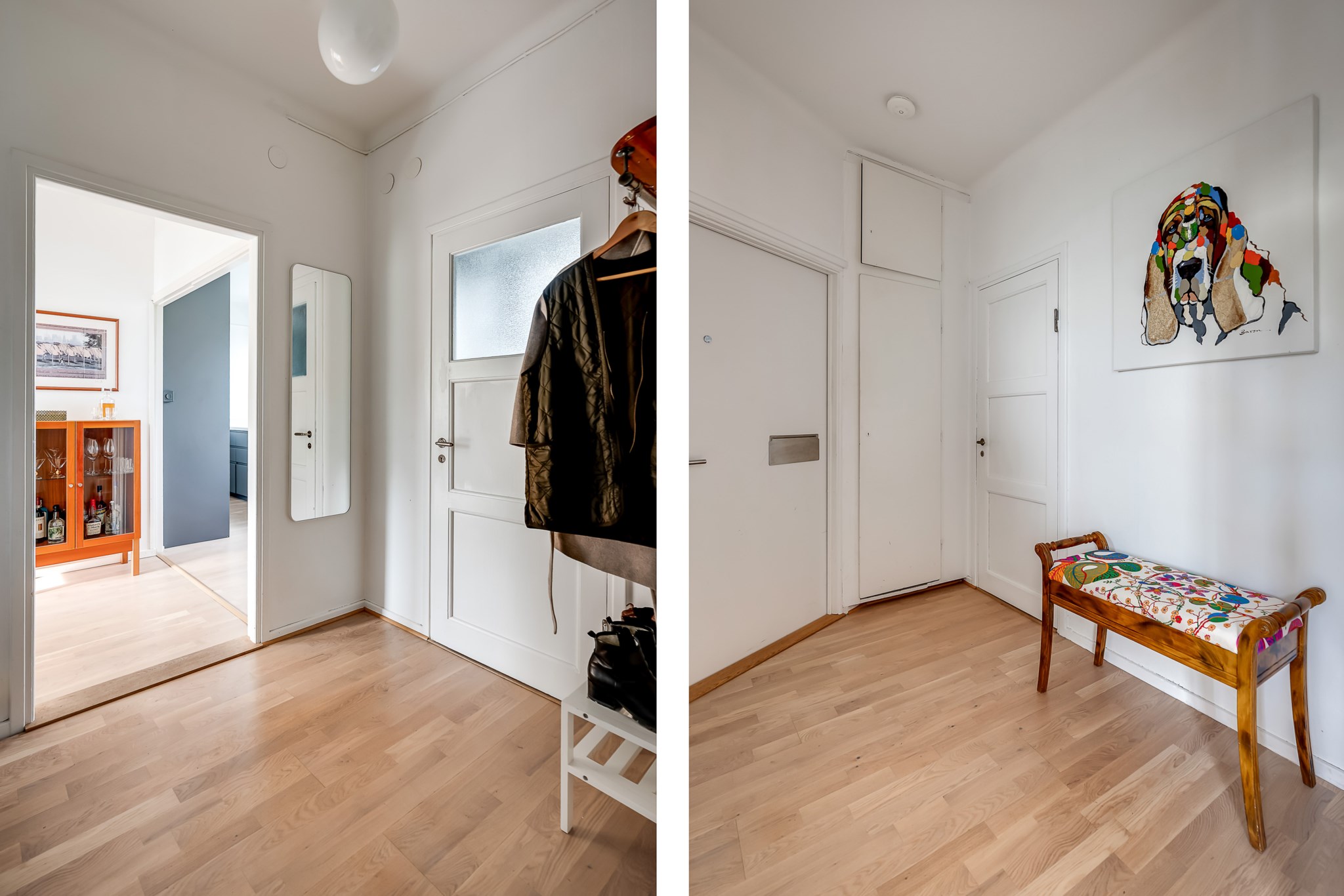 Välkomnande hall med ljusmålade ytskikt och ljust golv. Gott om förvaring i inbyggda garderober samt plats för hatthylla och skoställ.