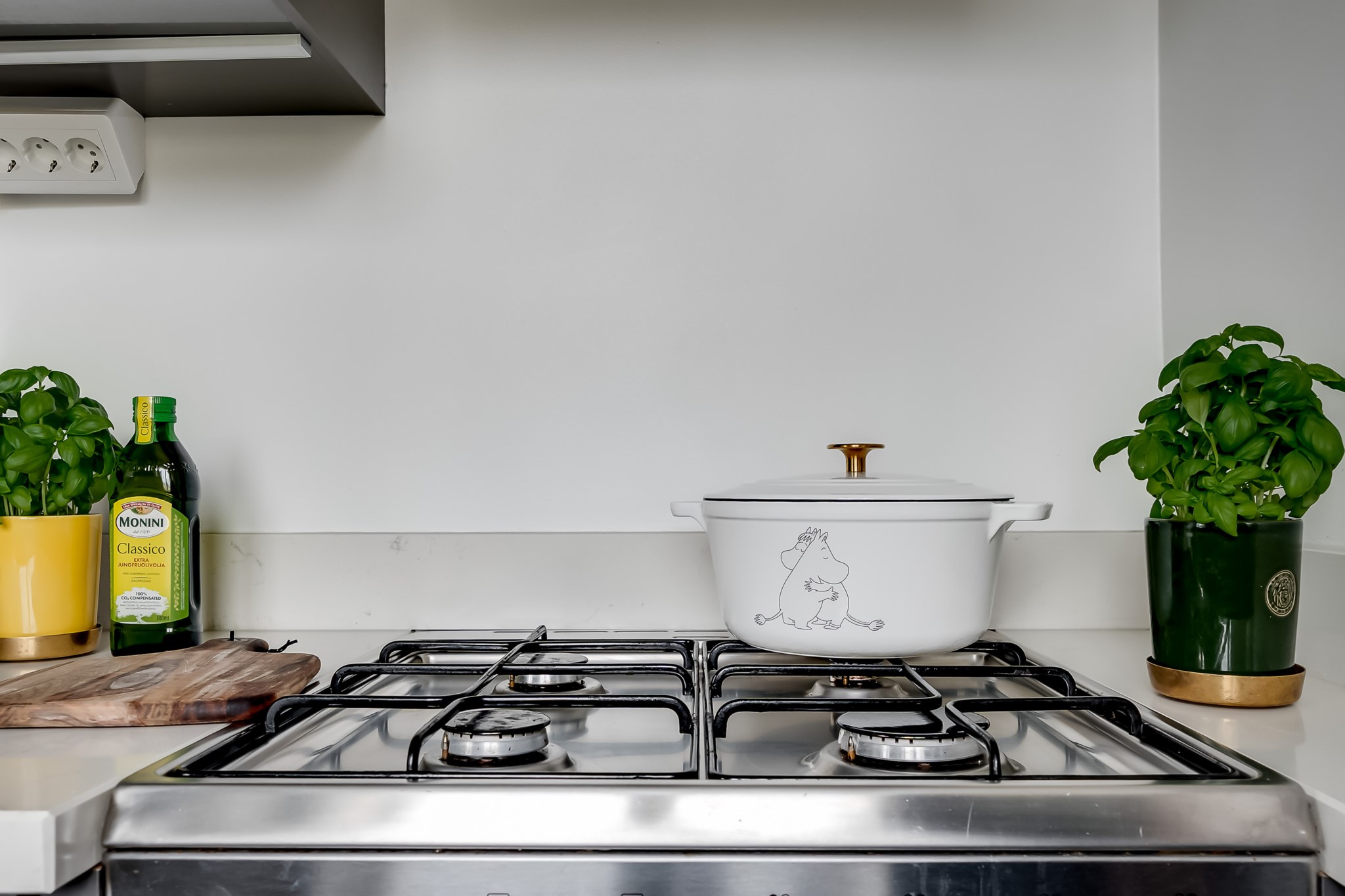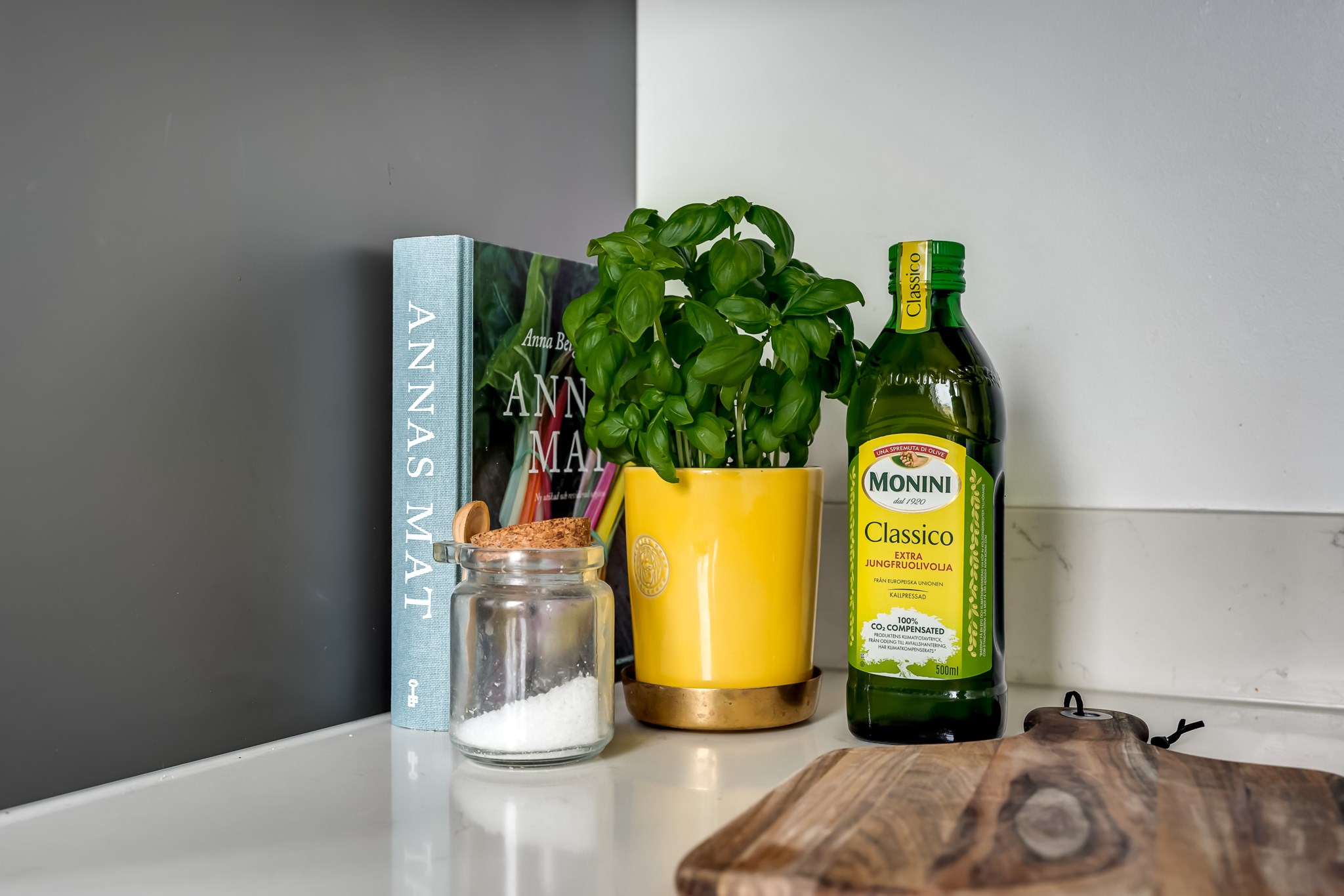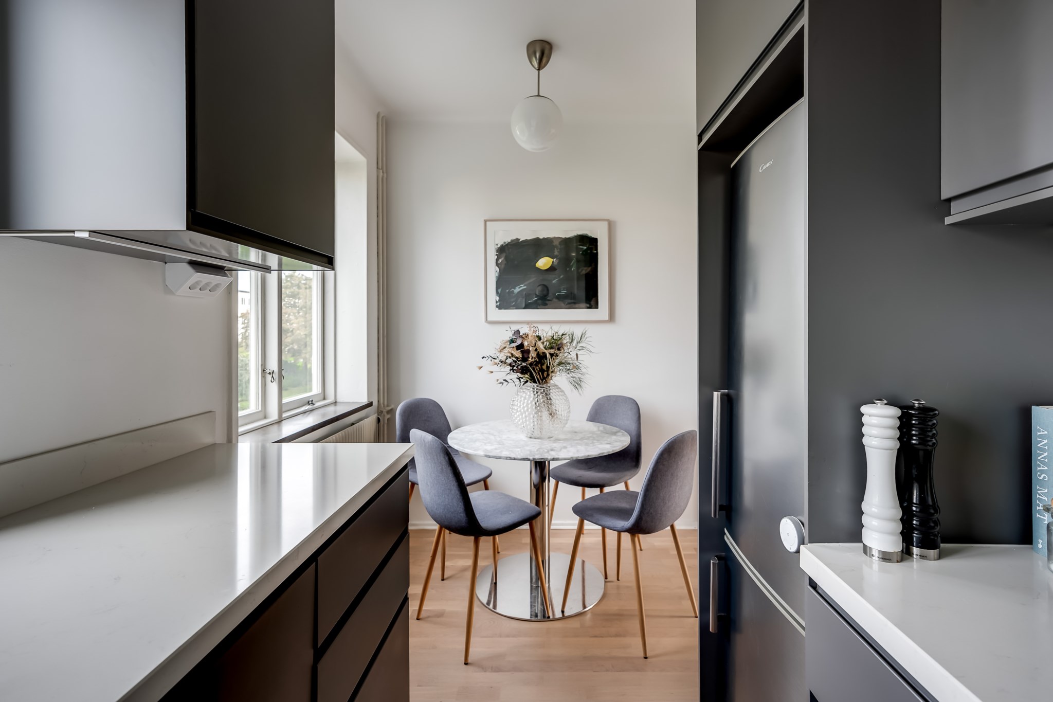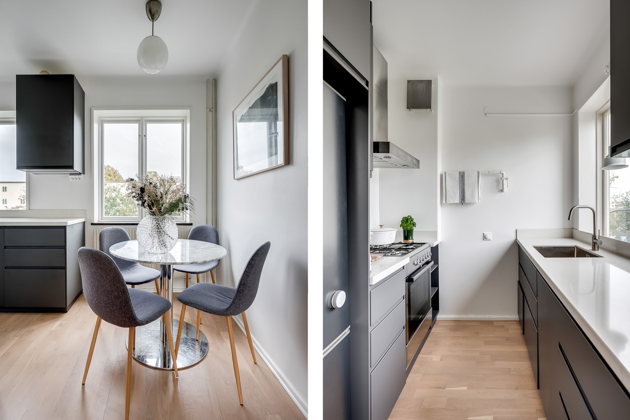 Modernt kök med matplats placerad intill ett av fönsterpartierna som släpper in rikligt med ljus. Köket är inrett med mörka, släta luckor, ljus bänkskiva som elegant löper upp en bit på väggpanelen samt maskinell utrustning i form av kyl/frys, gasspis, ugn, fläkt och diskmaskin. Ljusmålade ytskikt och ljust golv.