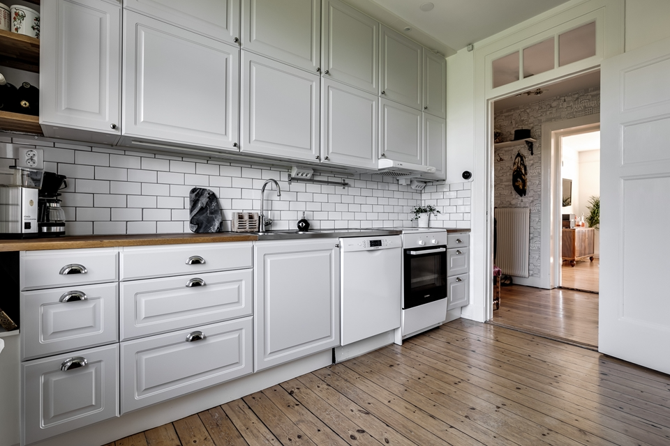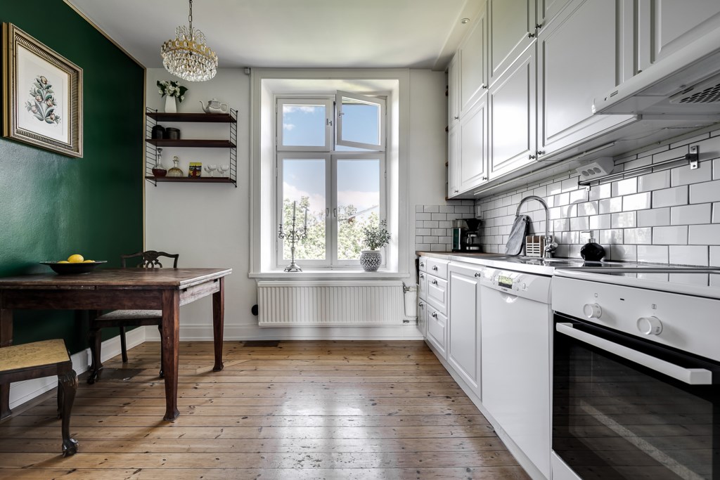 Modernt kök med furugolv och målade väggar. Vitt kakel och ljusa skåpluckor med mycket god förvaring. Fullt utrustat med kyl/frys, diskmaskin, fläkt, spis och ugn. Matplats vid fönster med härlig utsikt.