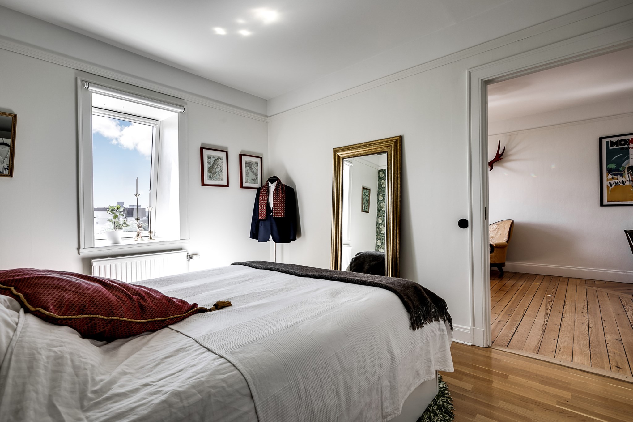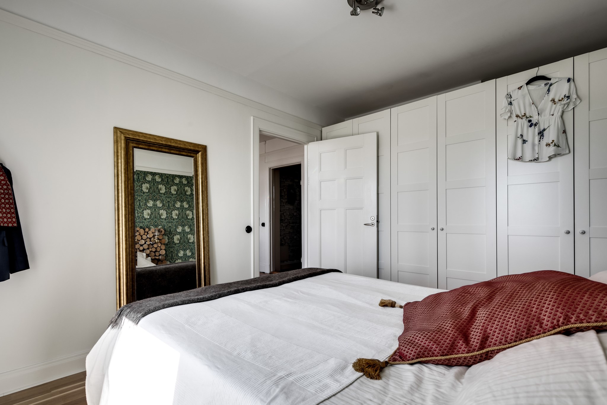 Rymligt sovrum med parkettgolv samt ljusa väggar med partier i tapet. Plats för dubbelsäng samt sängbord. Optimal förvaring i platsbyggda garderober. Fönster med fint ljusinsläpp.
