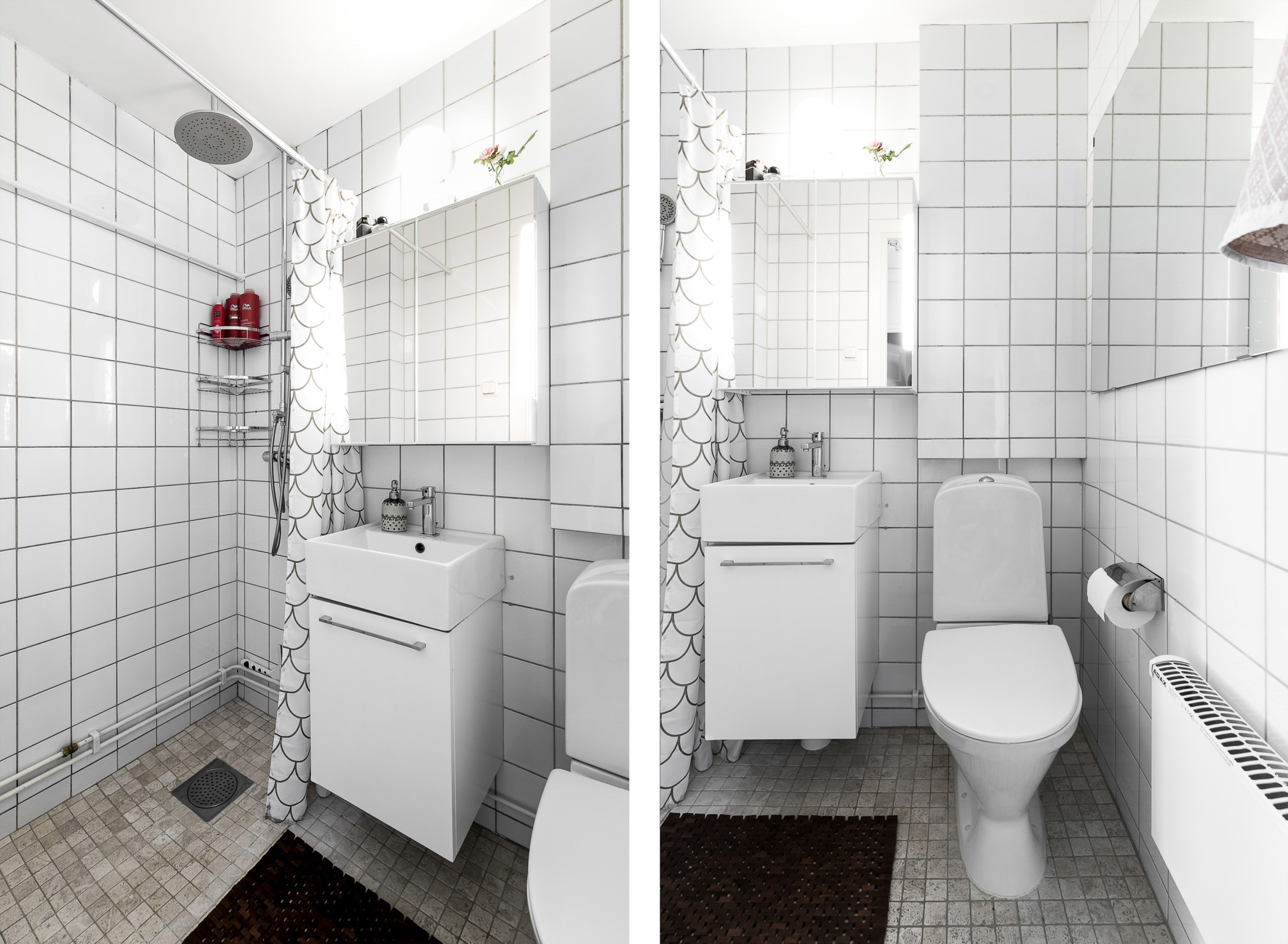 Ljust badrum med kaklade väggar och klinker på golv. Utrustat med dusch, wc, handfat på kommod samt spegelskåp med belysning. Element fungerar ej.