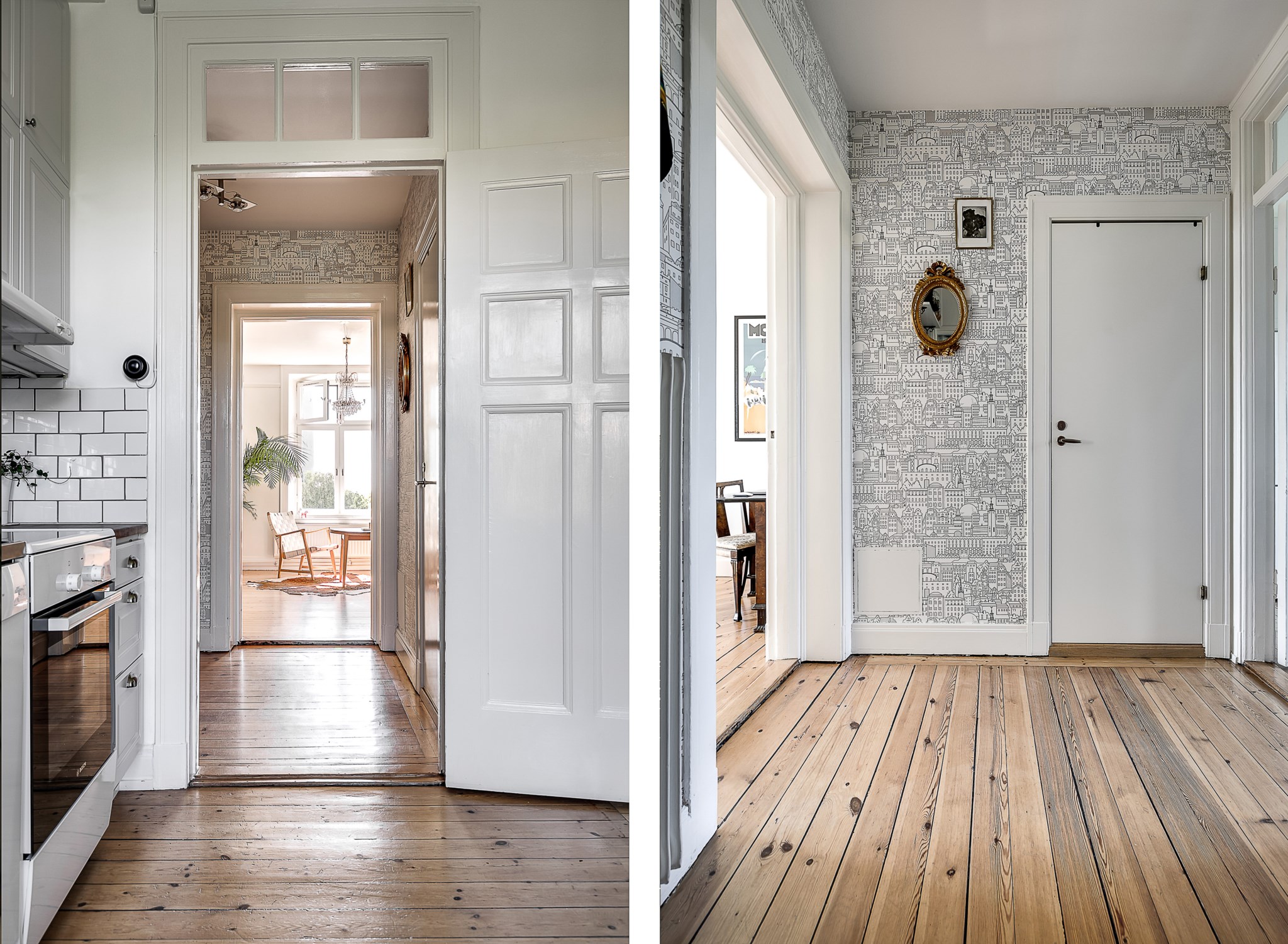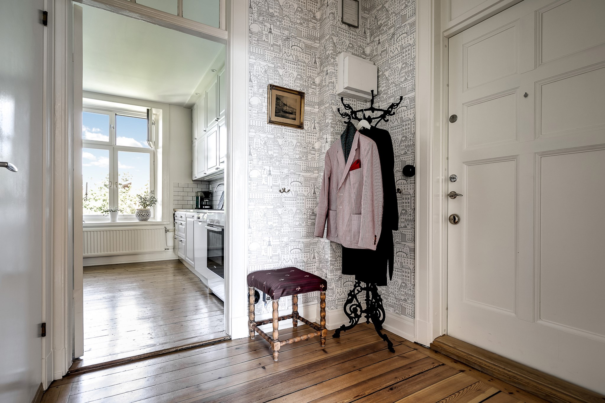 Välkomnande hall med furugolv och tapetserade väggar. Plats för avhängning av ytterkläder. Säkerhetsdörr.