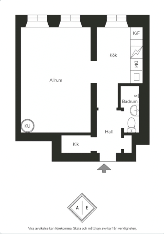 Luftigt allrum med generöst ljusinsläpp via två fönster i fil. Smakfulla ytskikt bestående av ljusa väggar, ljust plankgolv och detaljer i form av höga golvsocklar och en vacker, välbevarad kakelugn (kakelugnen är plomberad). I allrummet inryms soffa, soffbord, TV-möbel, säng, sängbord och annat möblemang efter smak och behov.