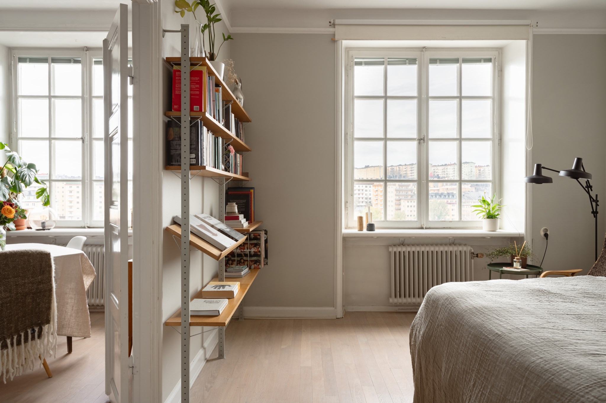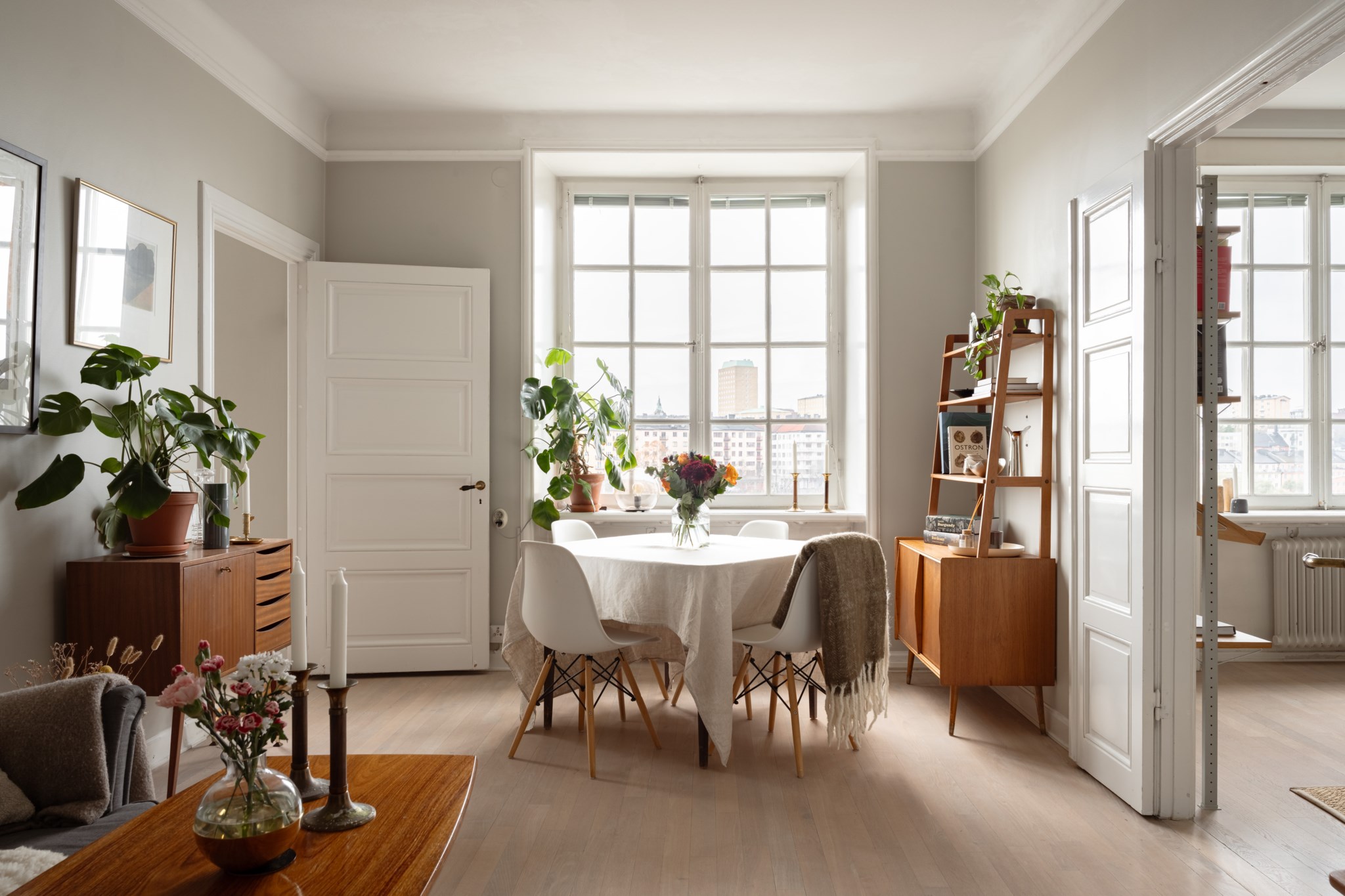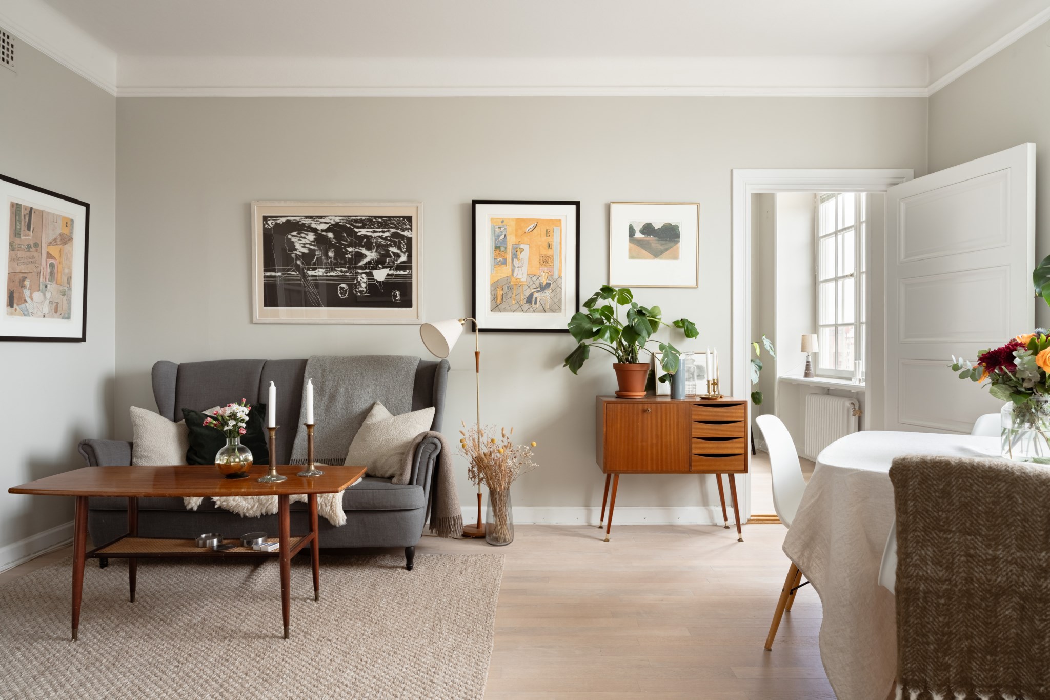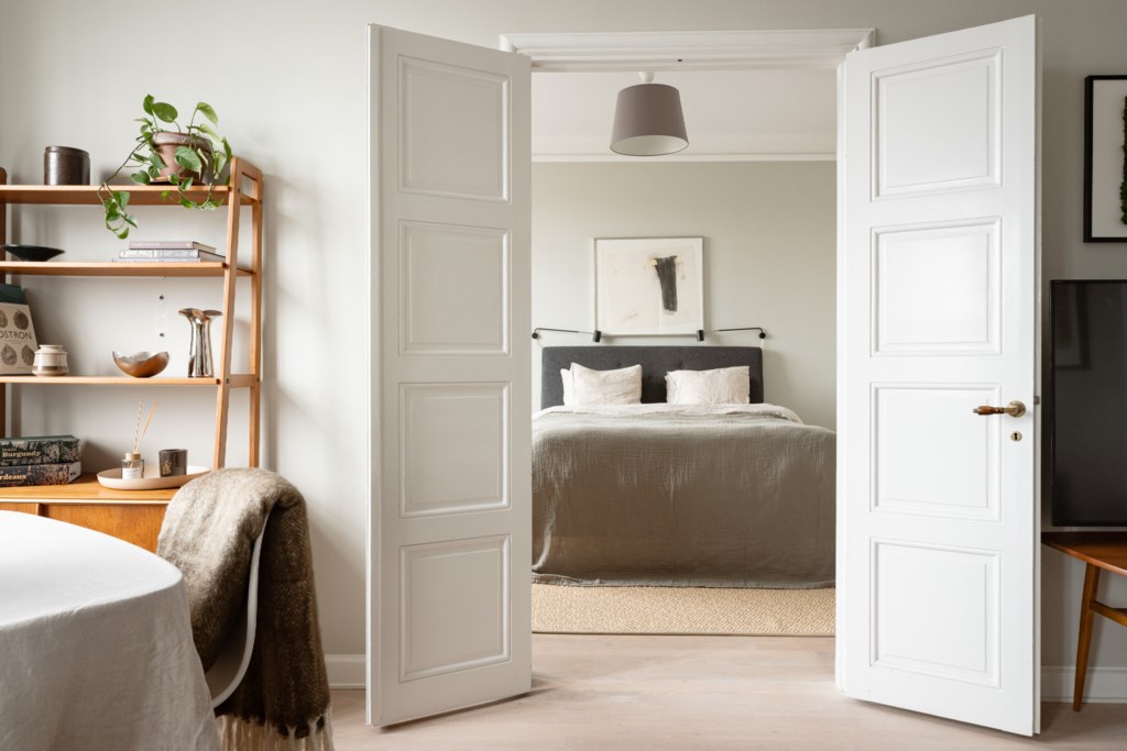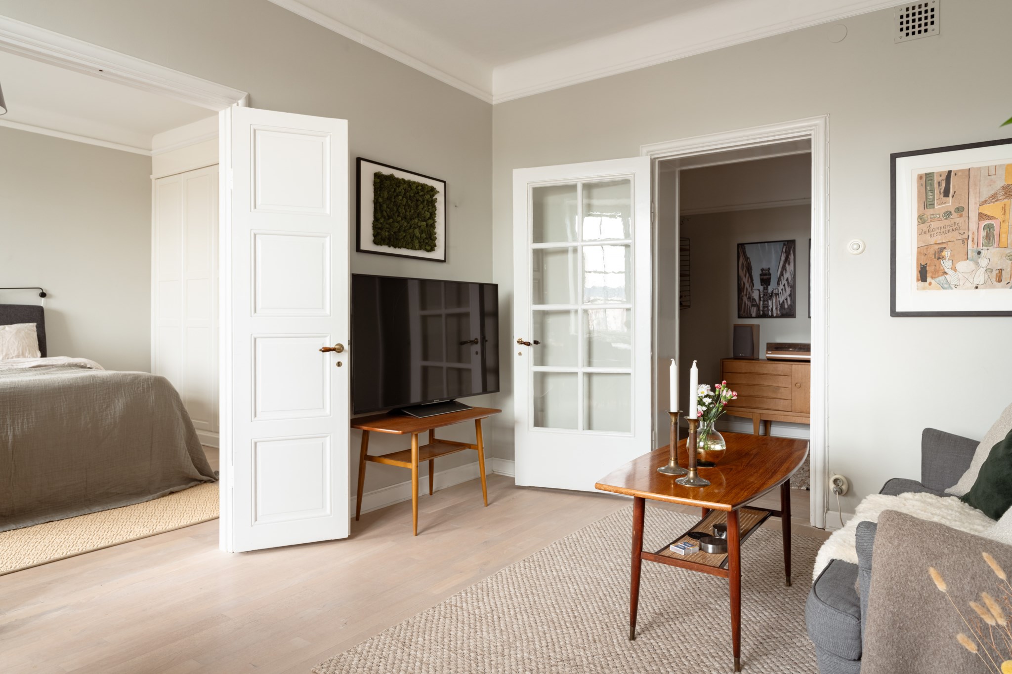Välplanerat vardagsrum med utvalda ytskikt bestående av väggar i grå nyans och ljust golv. I vardagsrummet inryms matgrupp, soffa, soffbord, TV-möbel och annat möblemang efter smak och behov. Ett härligt ljusinsläpp tar sig in via stort fönster med spröjs. Här finns även mäktiga dubbeldörrar som tar dig vidare till lägenhetens sovrum.
