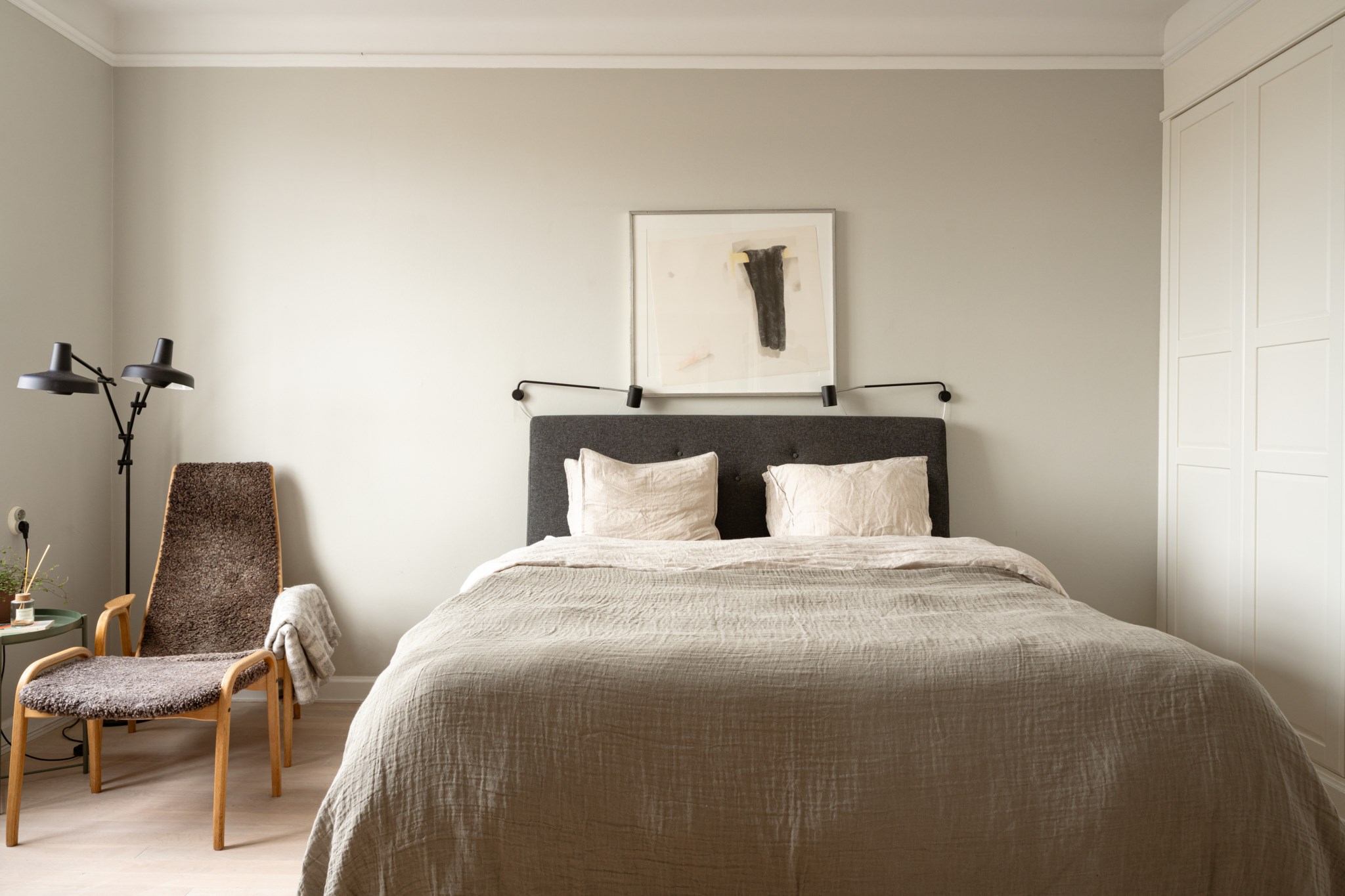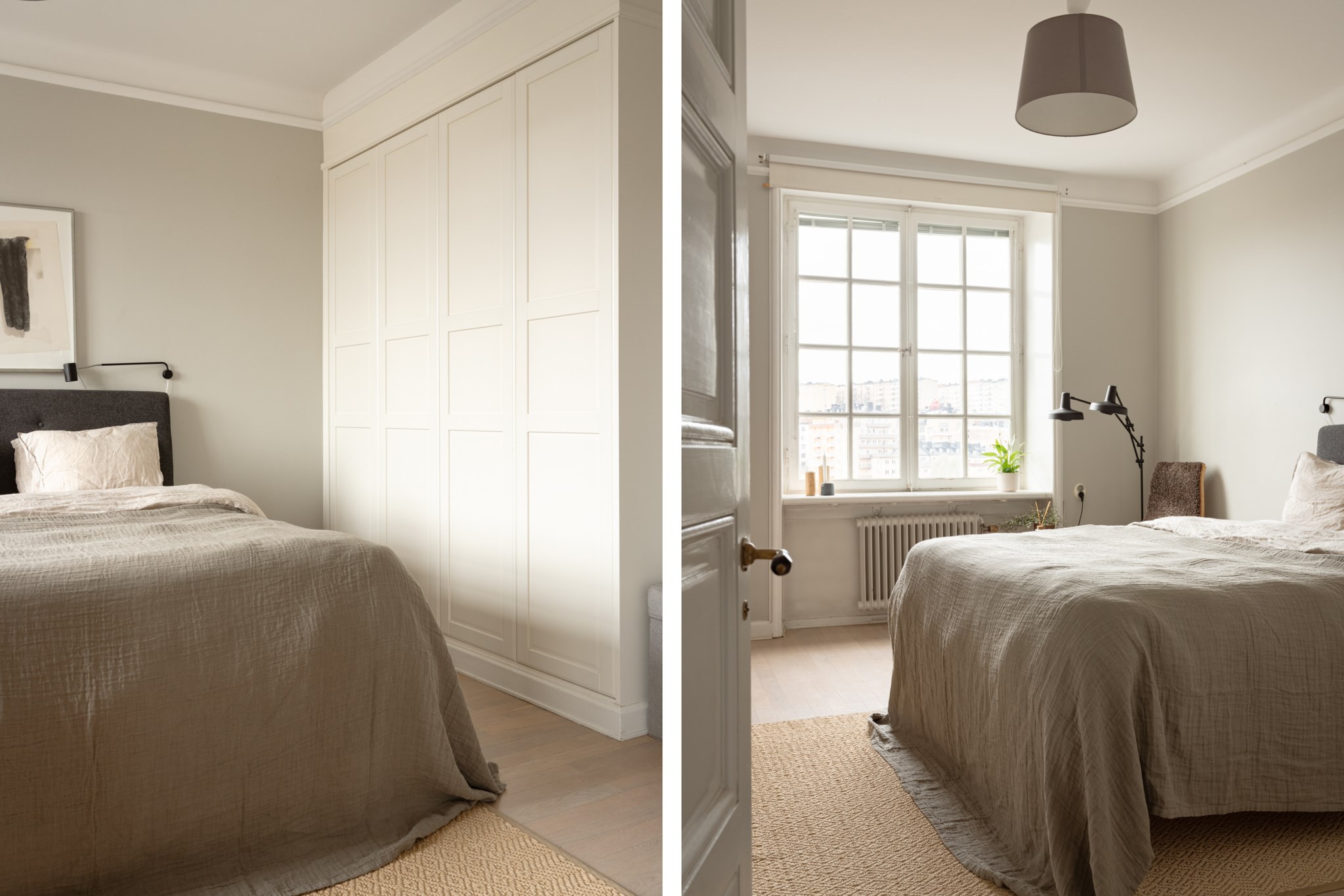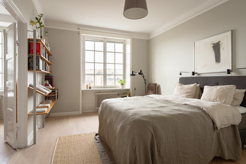 Stort sovrum med ett härligt ljusflöde från stort fönster med spröjs. I sovrummet inryms fullstor säng, sängbord, skrivbord och annat möblemang efter önskemål. Ytskikten består av väggar i grå nyans och ljust golv. Sovrummet erbjuder generöst med förvaringsmöjligheter via garderobsvägg.
