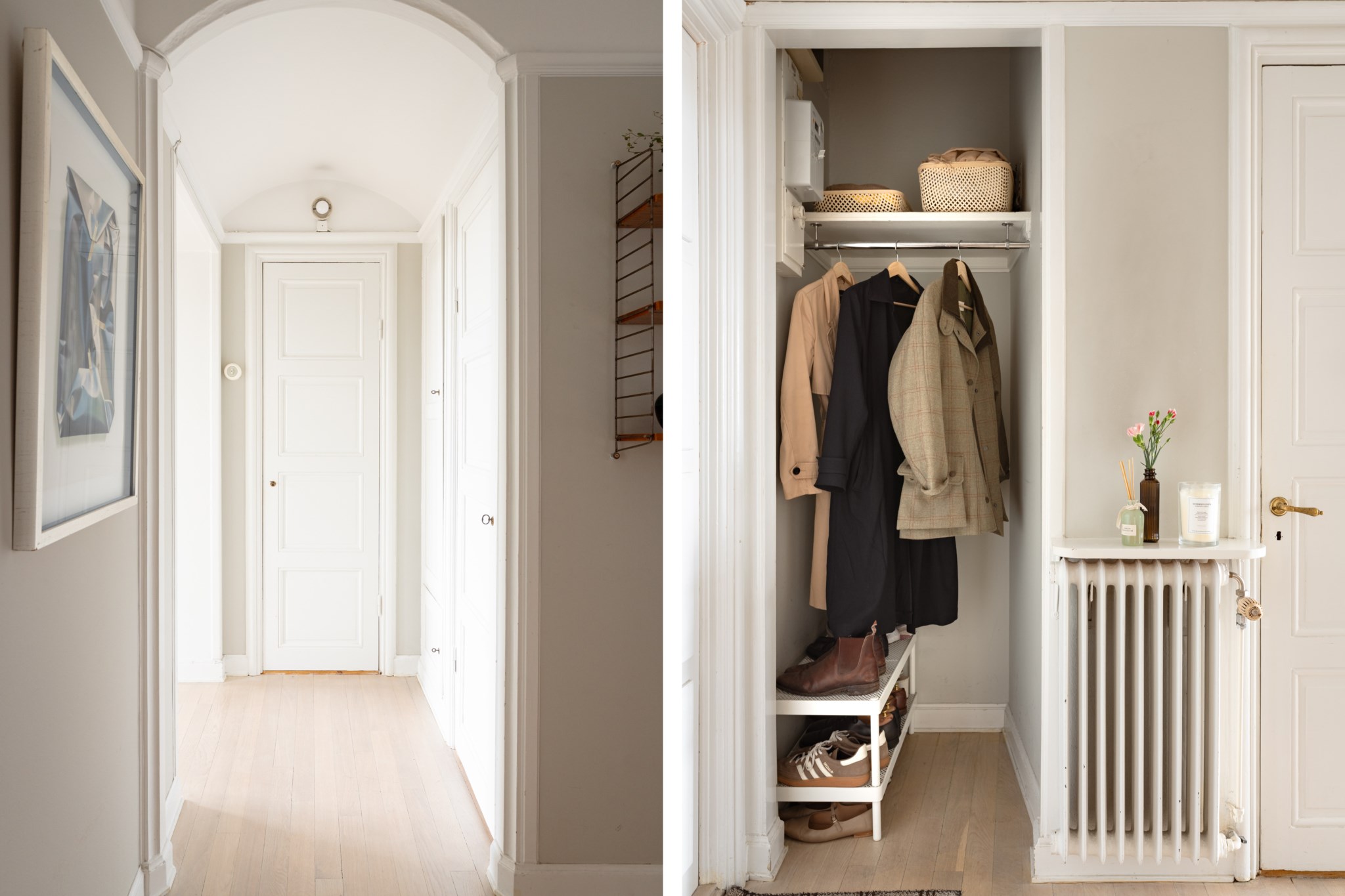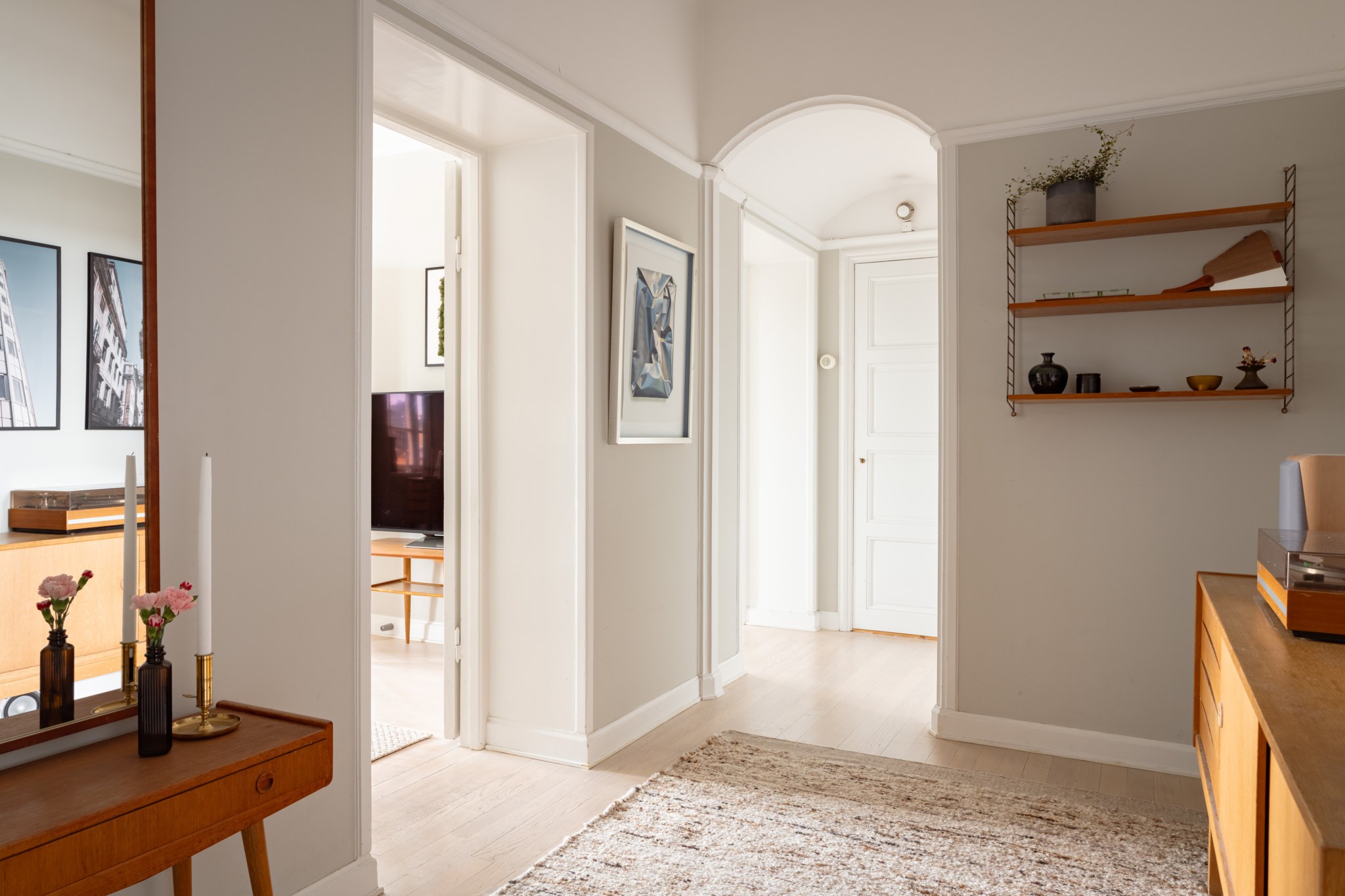 Luftig och välkomnande hall med gott om plats för avhängning, skoställ och möblemang efter smak och behov. Smakfulla ytskikt bestående av väggar i grå nyans och ljust golv.