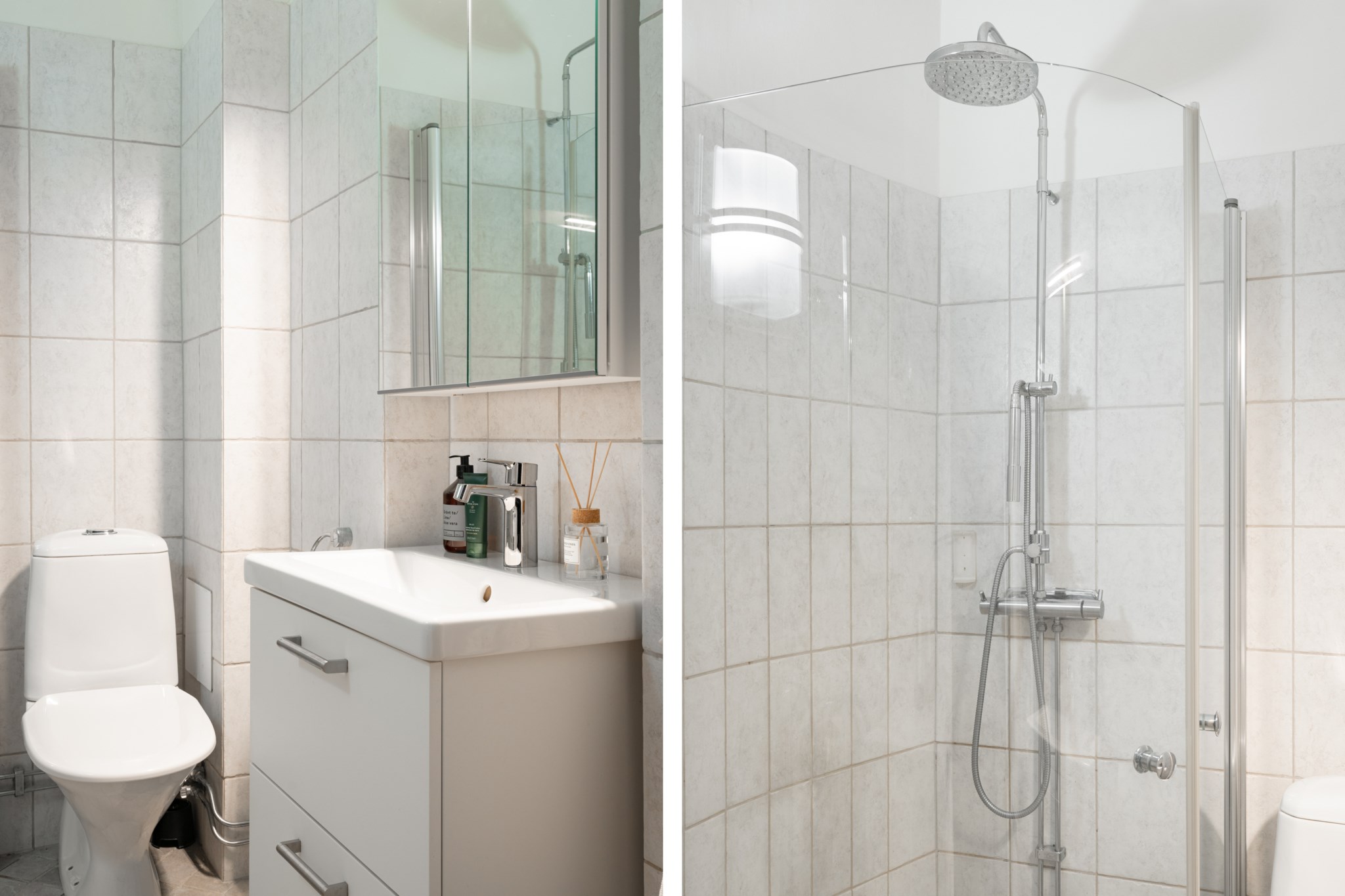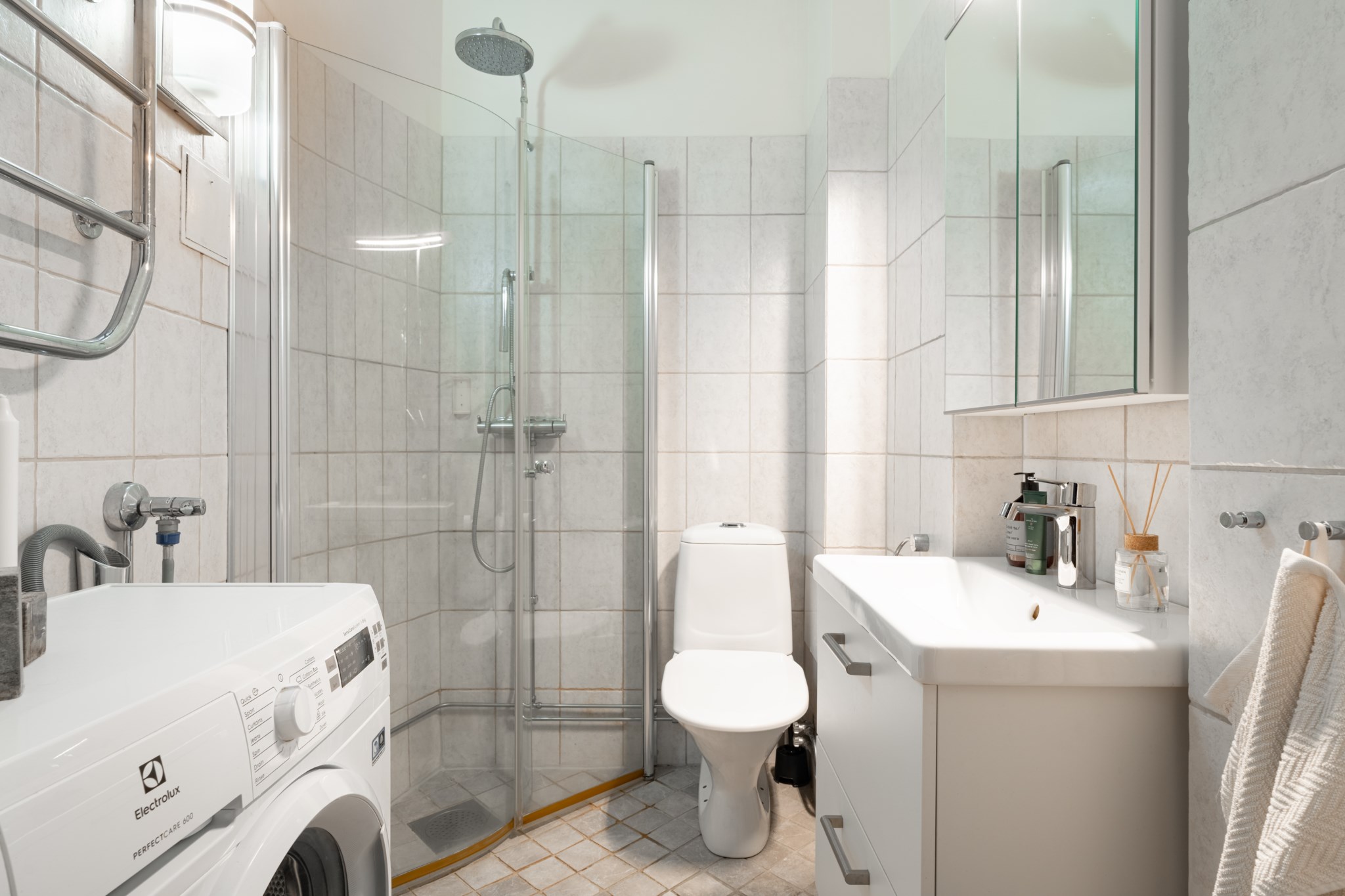 Rymligt badrum med ytskikt bestående av ljust kakel och ljust klinker. Badrummet är utrustat med WC, handfat i kommod, spegelskåp, tvättmaskin samt dusch med glasväggar.