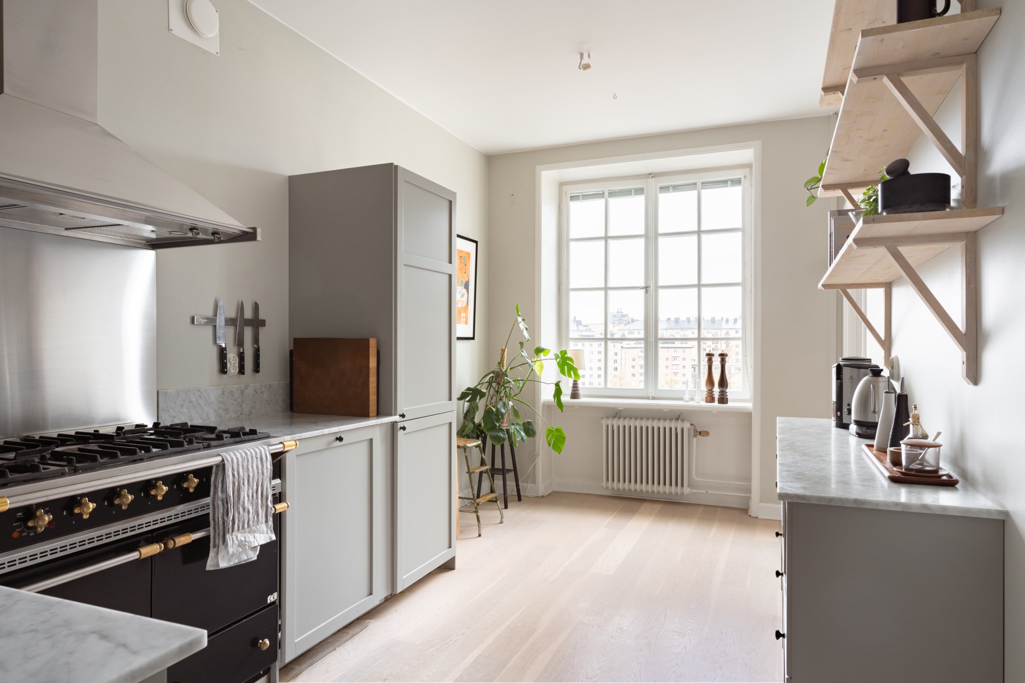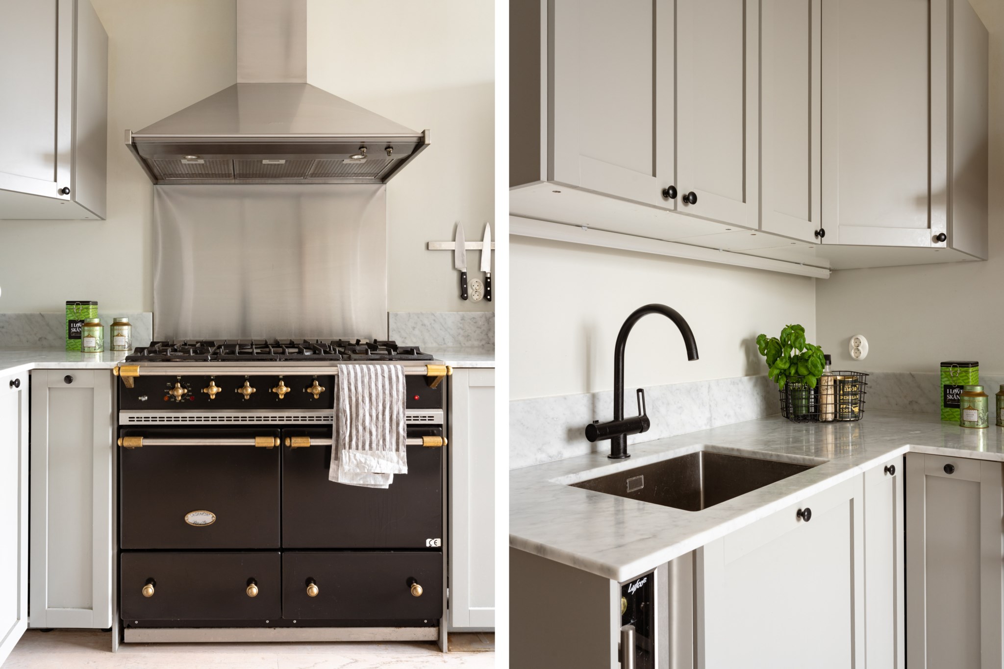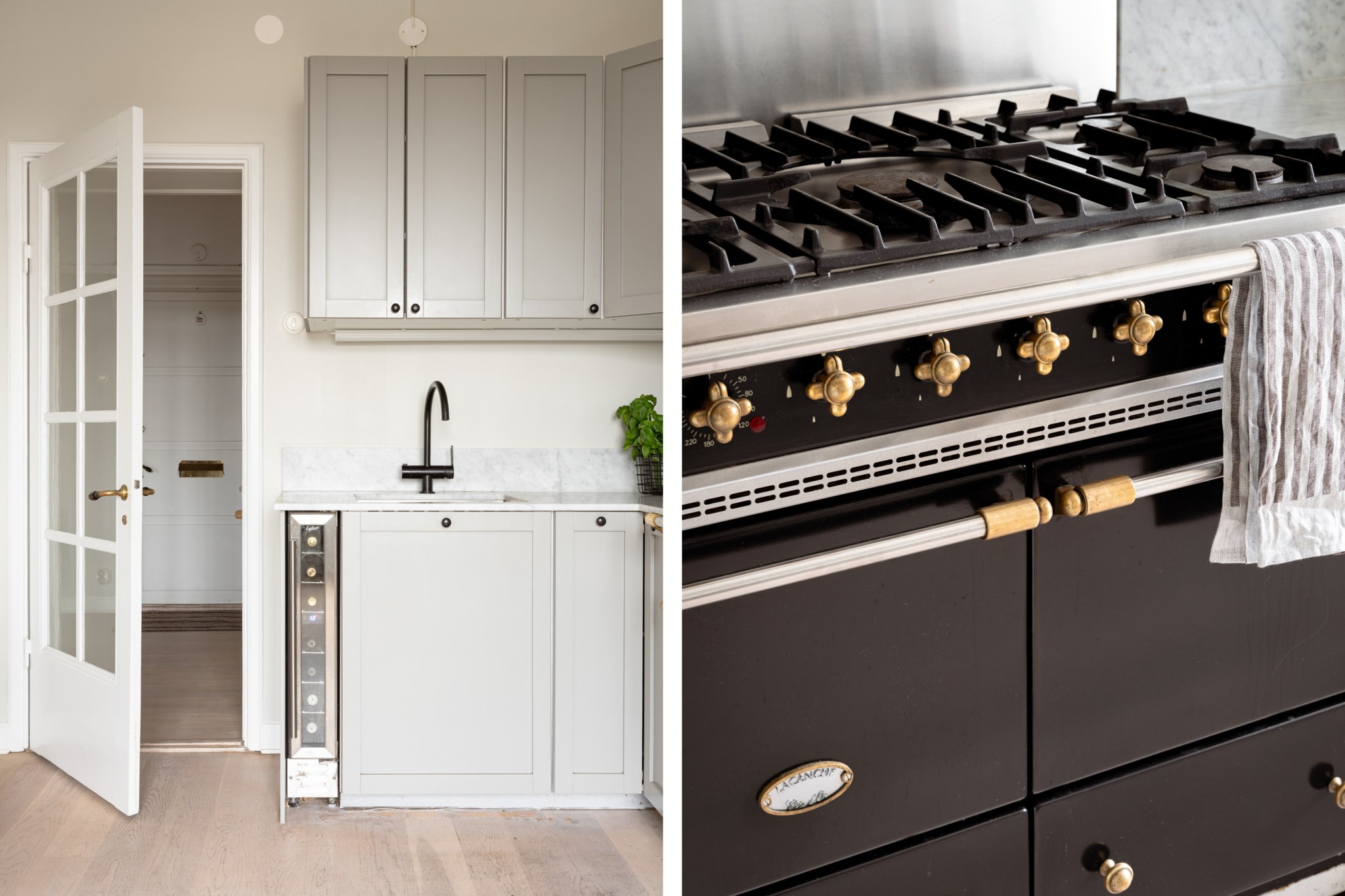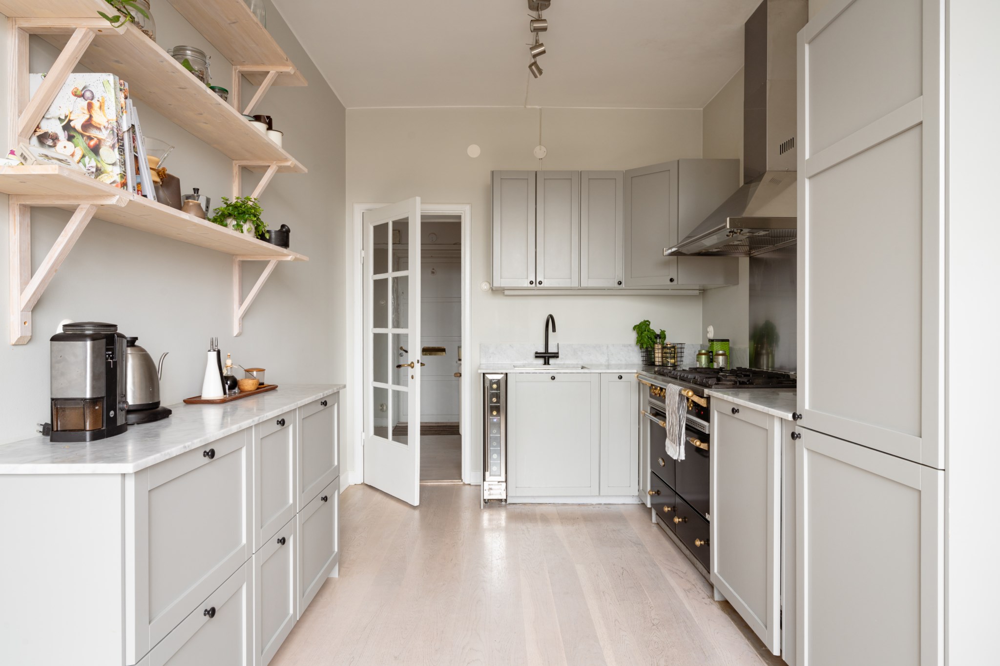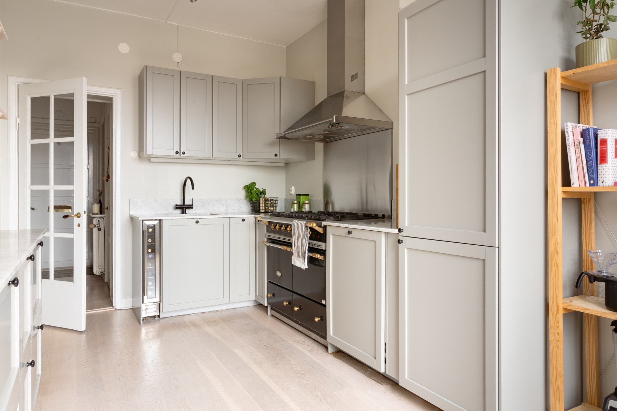Smakfullt kök med tidlösa materialval i form av gråa köksluckor och ljus bänkskiva i marmor. Köket är utrustat med diskho, lyxig gasspis från Lacanche, köksfläkt, ugn, diskmaskin, vinkyl samt kyl och frys. Utvalda ytskikt bestående av väggar i grå nyans och ljust golv. Generöst ljusinsläpp via stort fönster med spröjs.