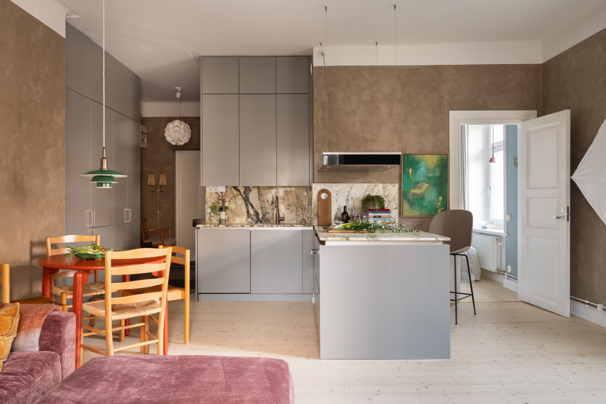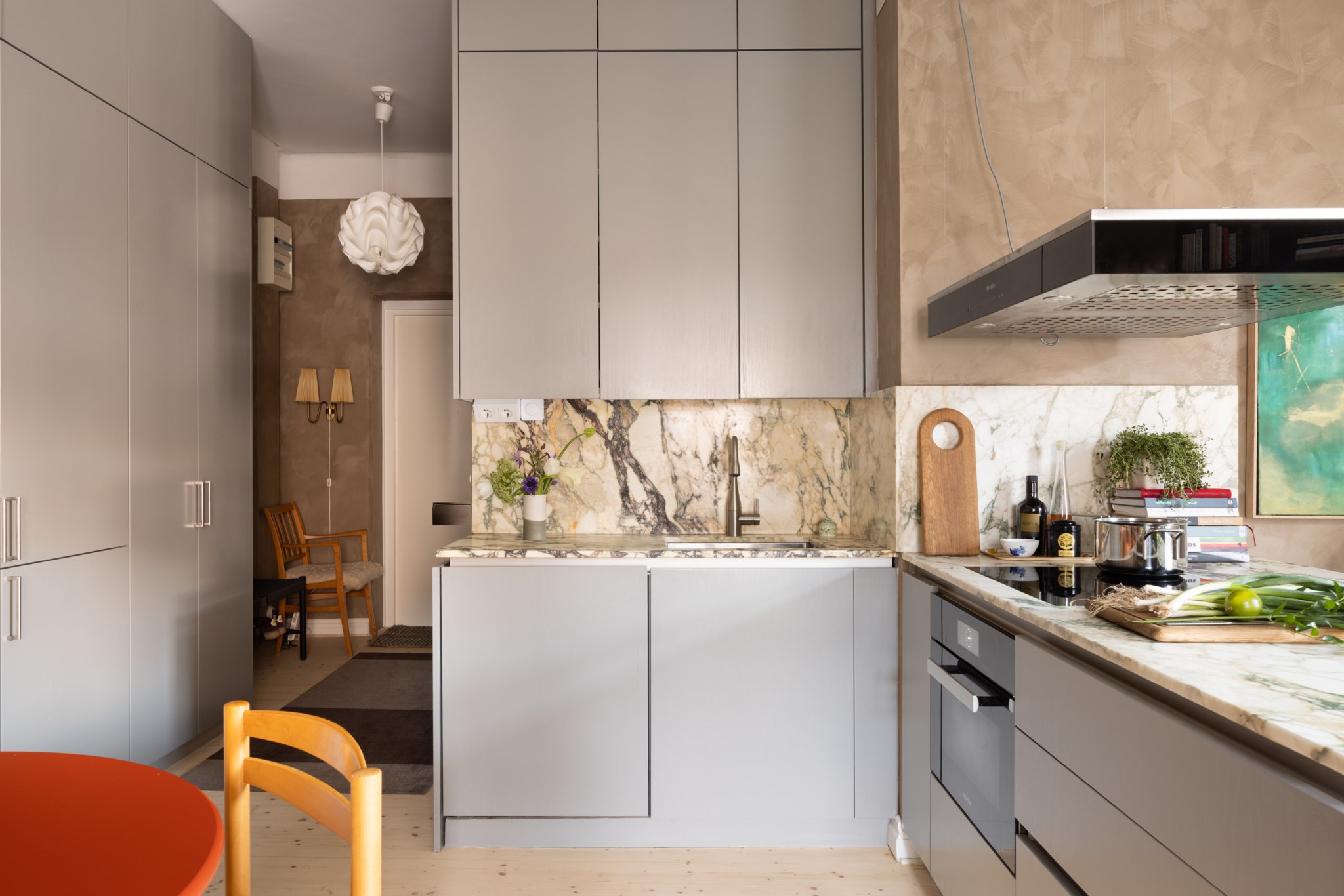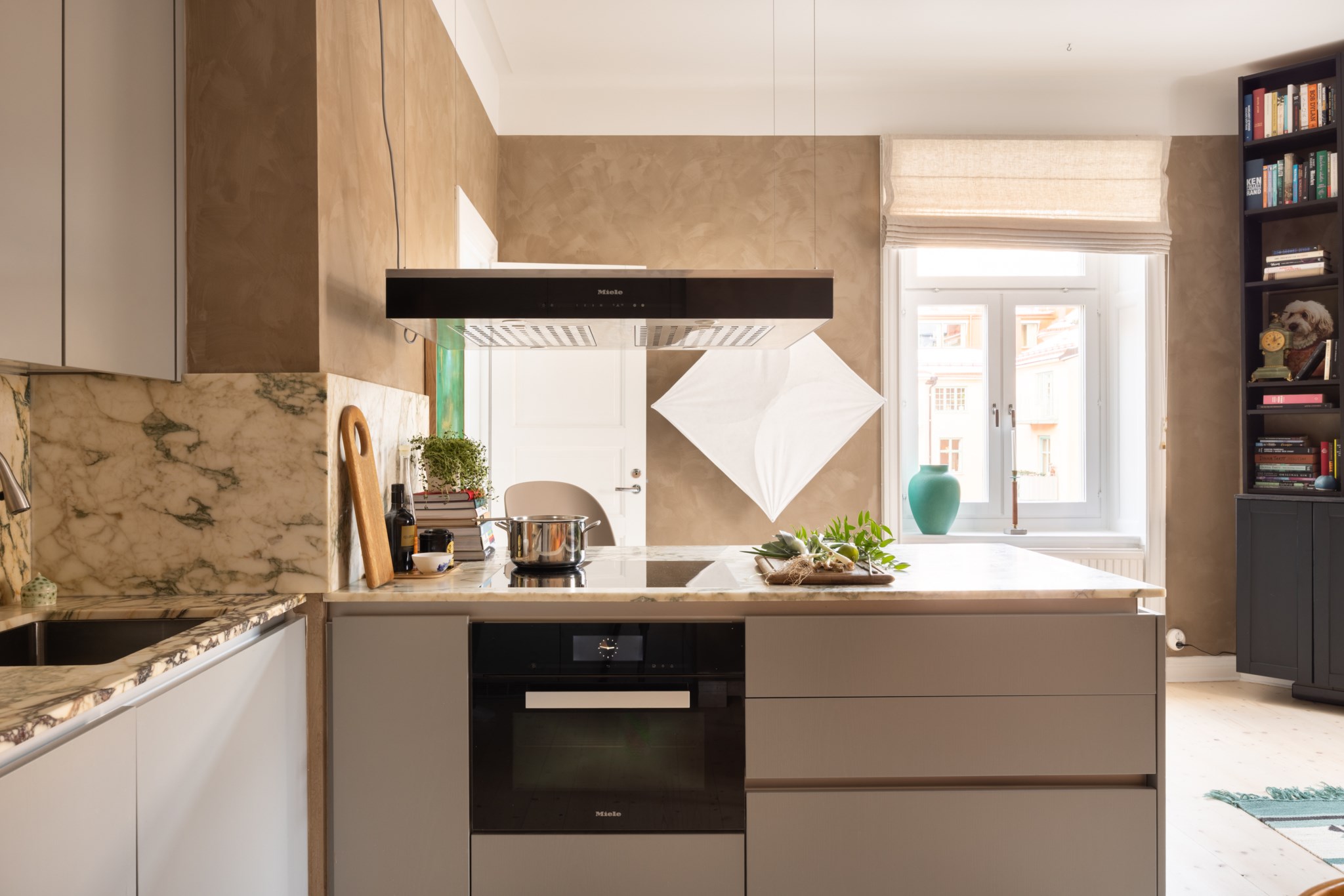 Modernt kök med smakfulla materialval bestående av gråa köksluckor från Kvänum och bänkskiva i marmor av märket Breccia Capraia med stänkskydd ovan. En magisk köksö med gott om arbetsyta och förvaring. Den maskinella utrustningen med vitvaror från Miele består av induktionshäll, ugn med ångfunktion, köksfläkt, diskmaskin samt kyl och frys med ismaskin. I köket finns plats för en matgrupp och ett härligt ljusinsläpp tar sig in via stora fönster. Tidlösa ytskikt bestående av ljusa väggar i kalkfärg och ljust trägolv.