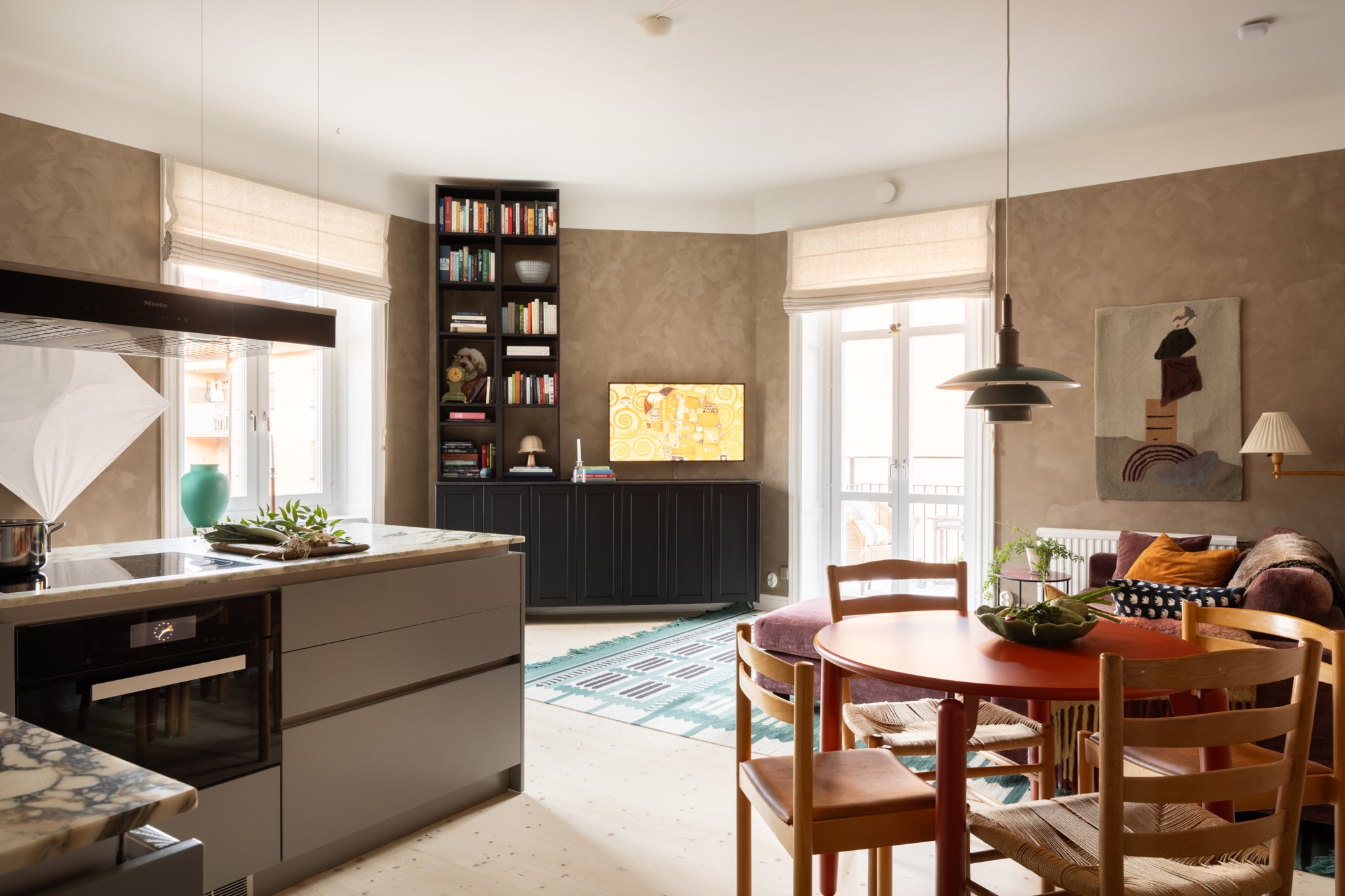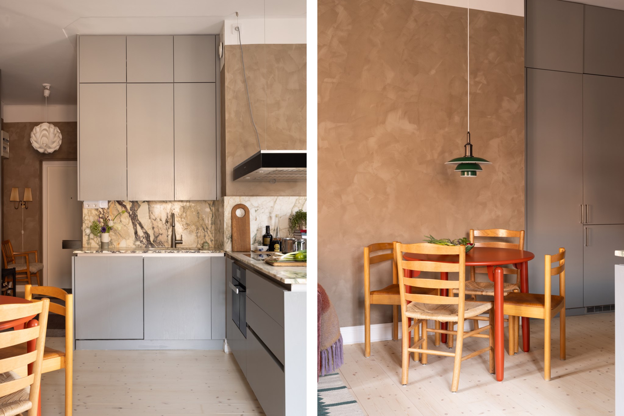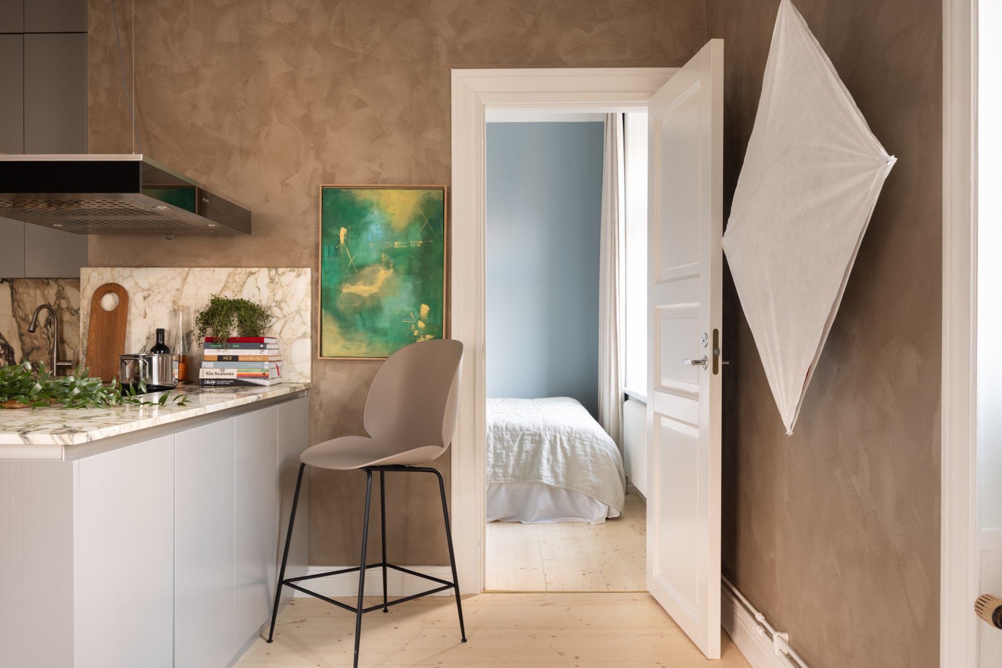 Modernt kök med smakfulla materialval bestående av gråa köksluckor från Kvänum och bänkskiva i marmor av märket Breccia Capraia med stänkskydd ovan. En magisk köksö med gott om arbetsyta och förvaring. Den maskinella utrustningen med vitvaror från Miele består av induktionshäll, ugn med ångfunktion, köksfläkt, diskmaskin samt kyl och frys med ismaskin. I köket finns plats för en matgrupp och ett härligt ljusinsläpp tar sig in via stora fönster. Tidlösa ytskikt bestående av ljusa väggar i kalkfärg och ljust trägolv.