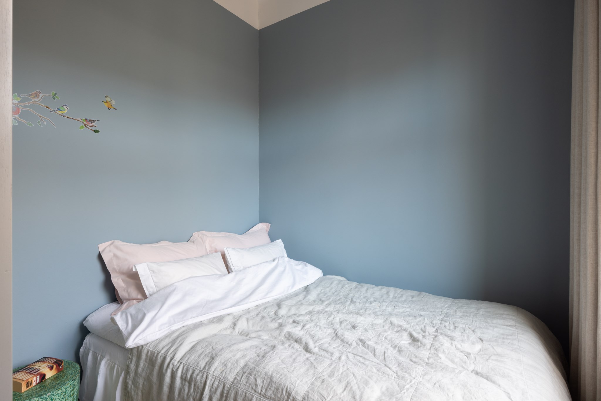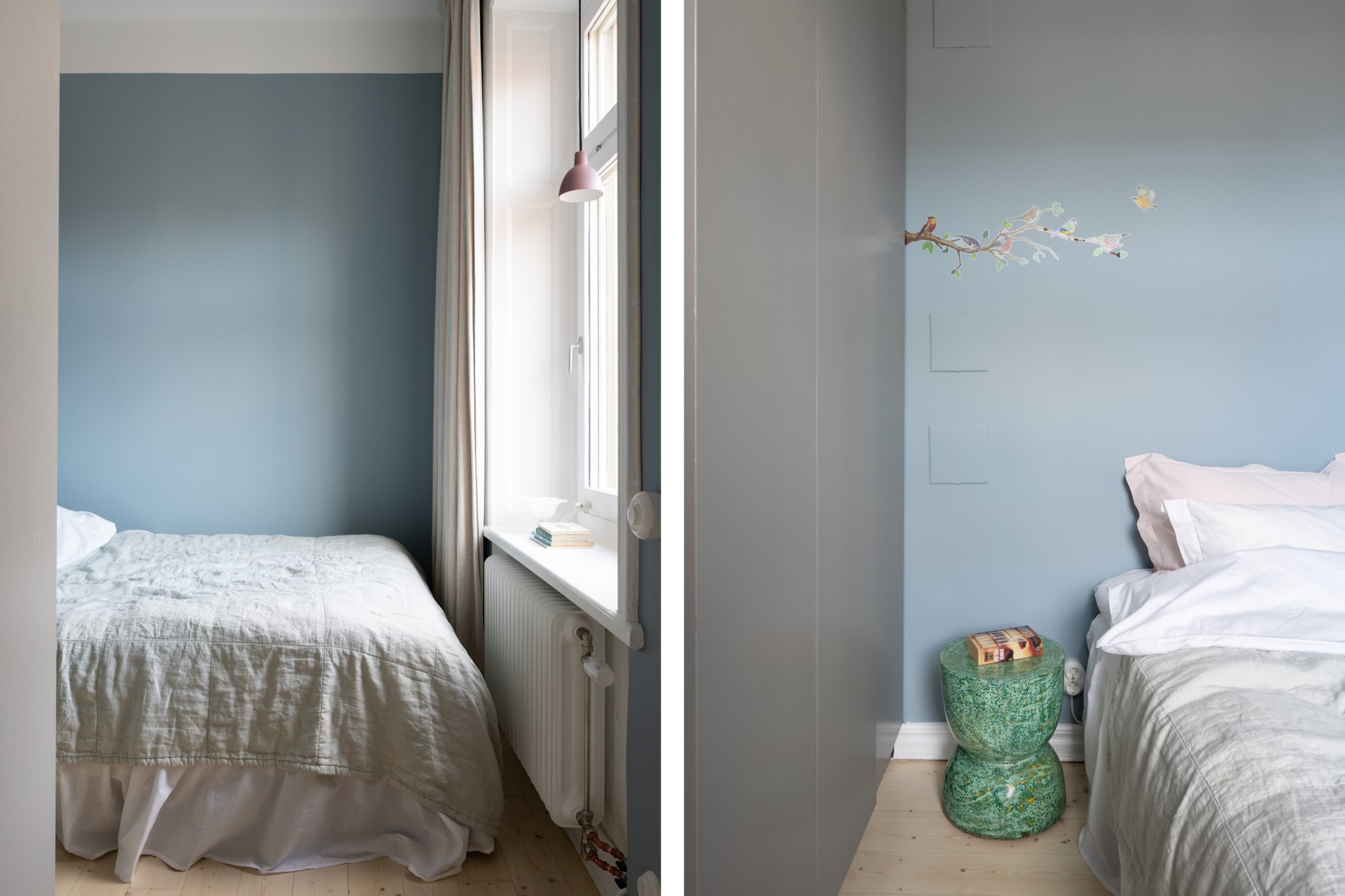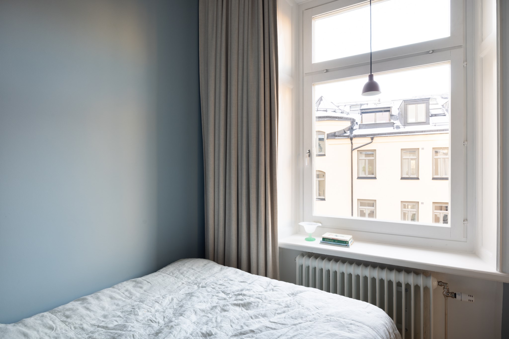 Mysigt sovrum med plats för säng och annat möblemang efter smak och behov. Ett härligt ljusinsläpp tar sig in via ett stort fönster. Tidlösa ytskikt bestående av ljusa väggar i en blå nyans och ljust trägolv. Platsbyggd garderob från Kvänum.