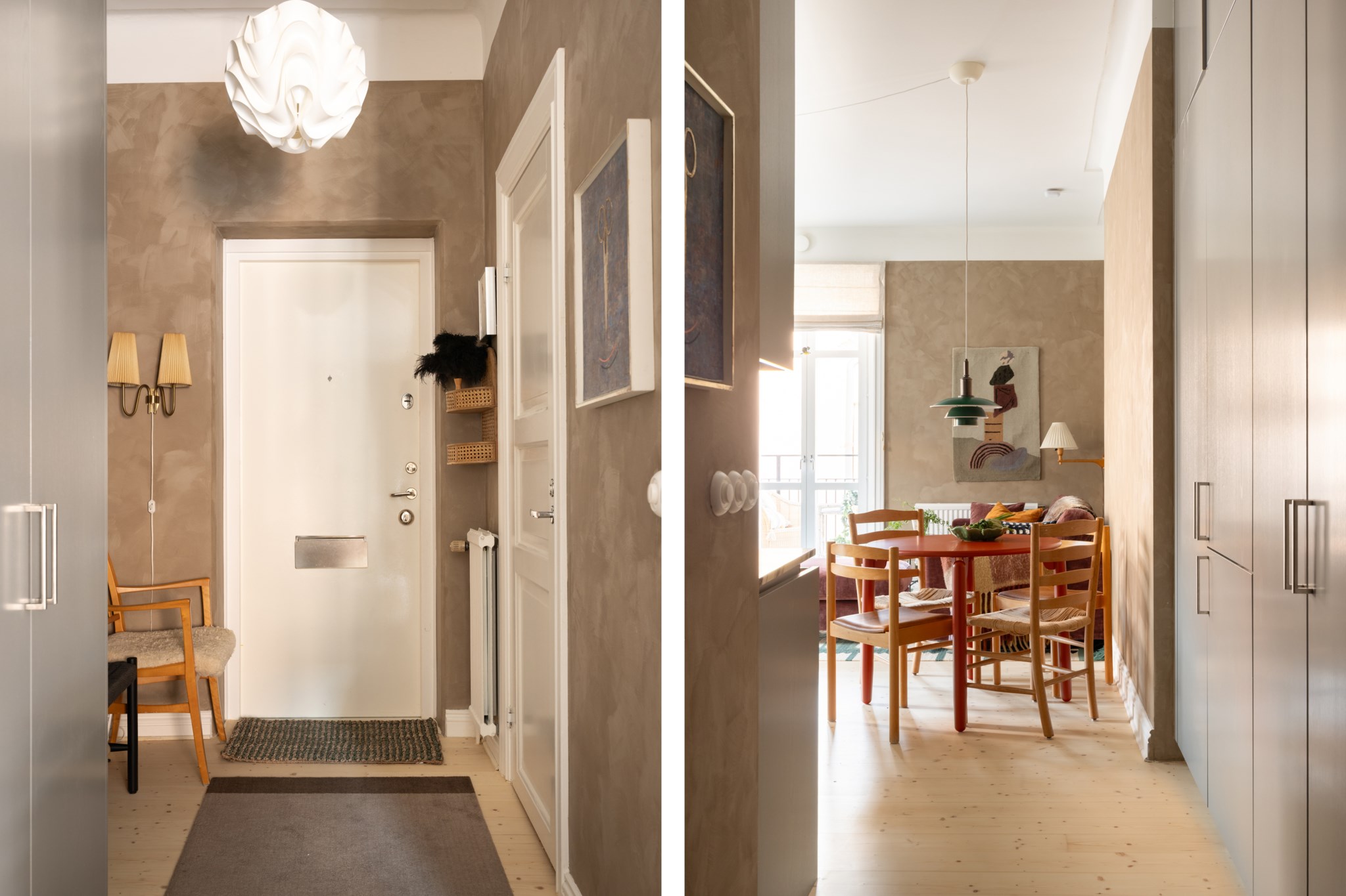 Välkomnande hall med plats för avhängning, skoställ samt mindre avlastningsmöblemang efter smak och behov. Gott om plats för förvaring via intilliggande platsbyggda garderober från Kvänum. Tidlösa ytskikt bestående av ljusa väggar i kalkfärg och ljust trägolv.