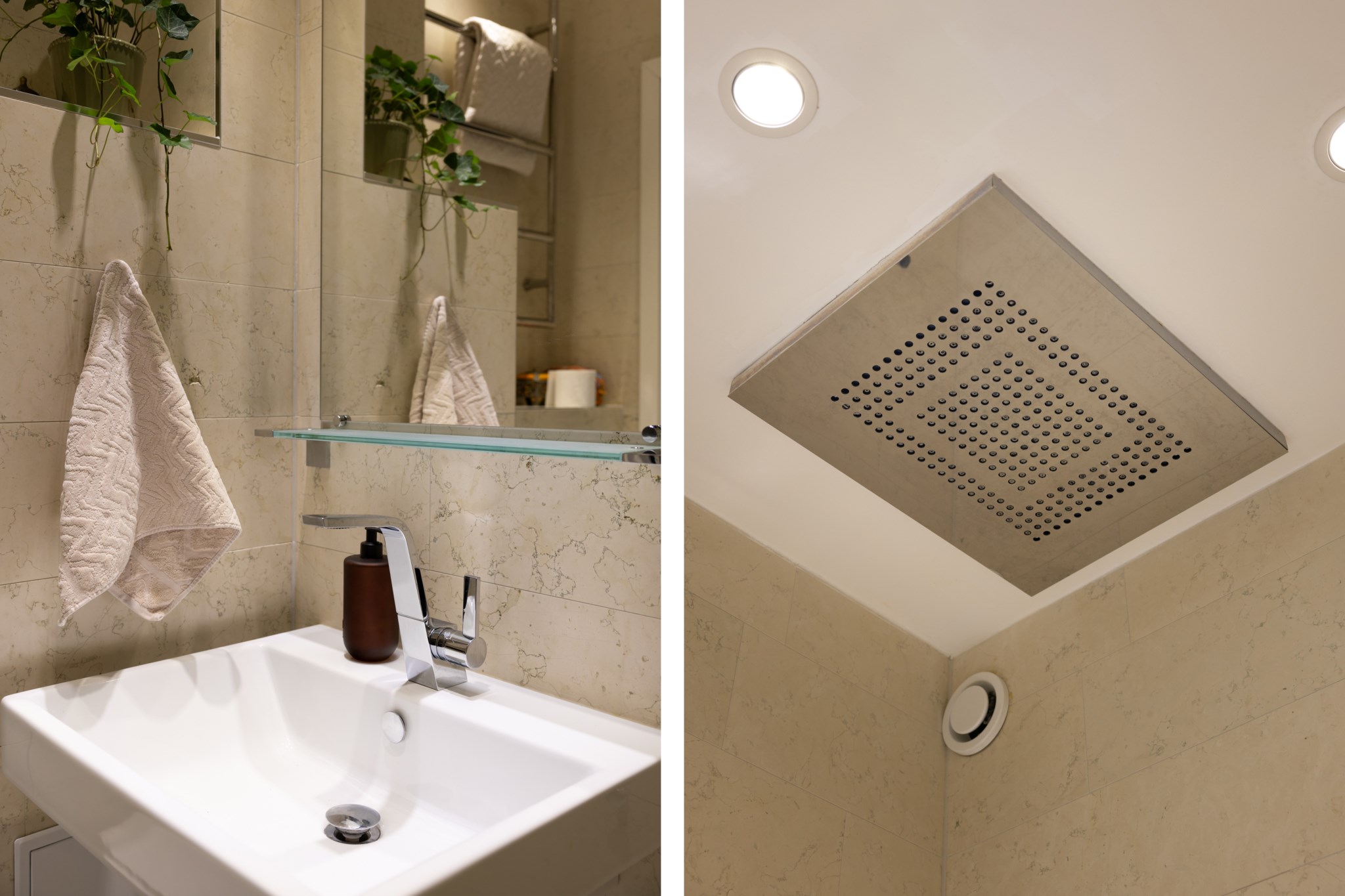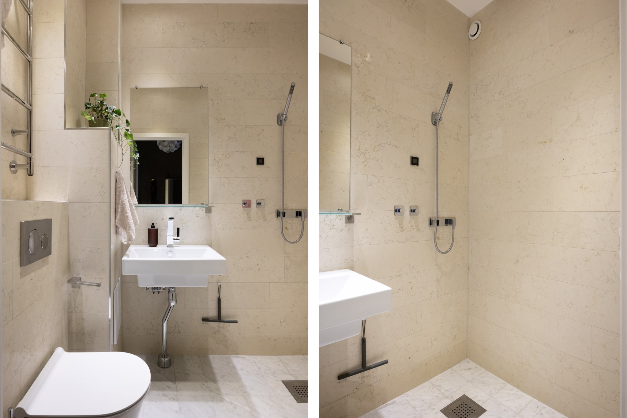 Rymligt badrum med väggar i Bianco Italia-marmor och klinker i Carraramarmor. Badrummet är utrustat med WC, handdukstork, handfat med blandare från Dornbracht, spegel samt en takdusch med duschhuvud och handdusch från Dornbracht. Golvvärme.