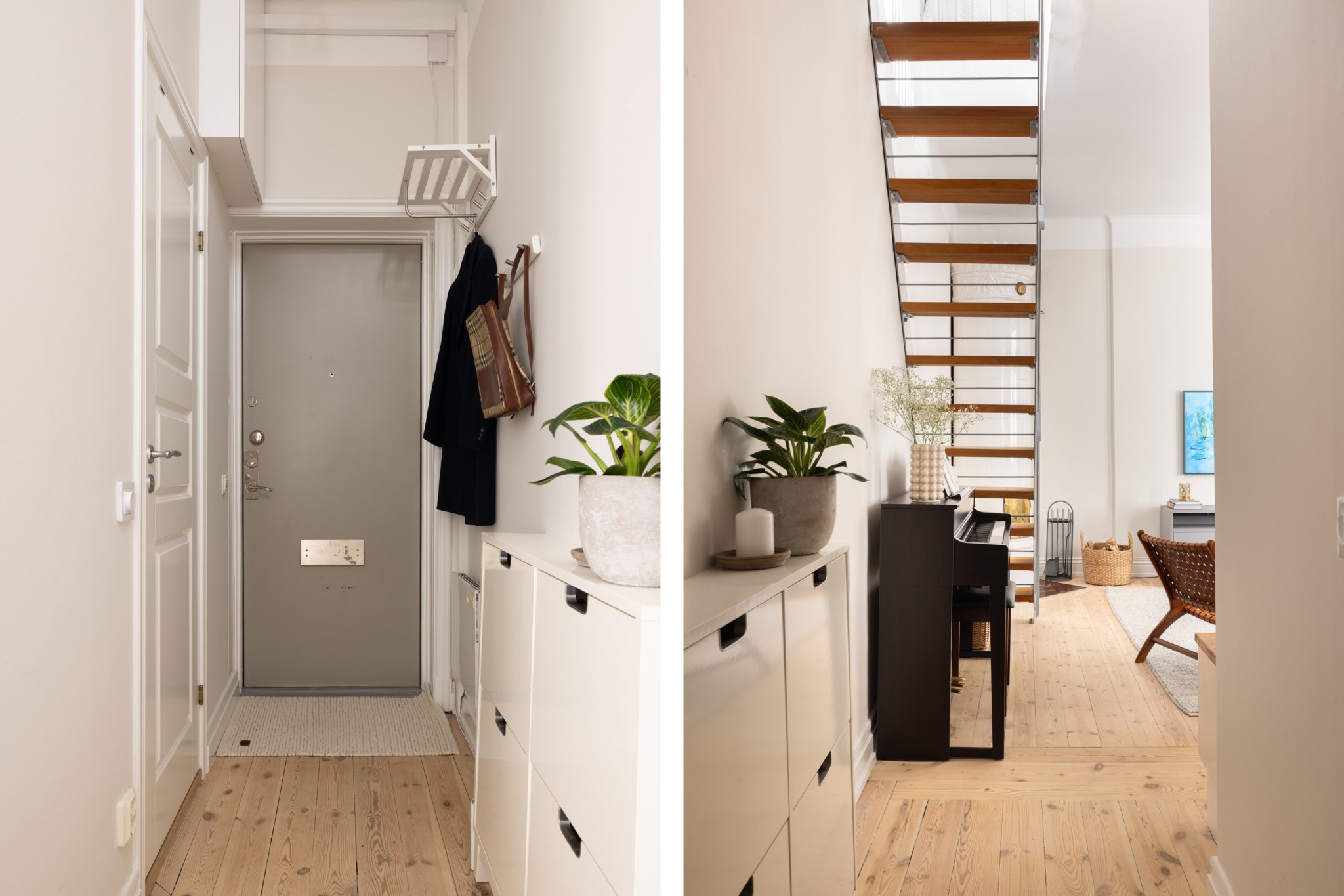 Välkomnande hall med plats för avhängning Ljust trägolv och ljusa väggar.