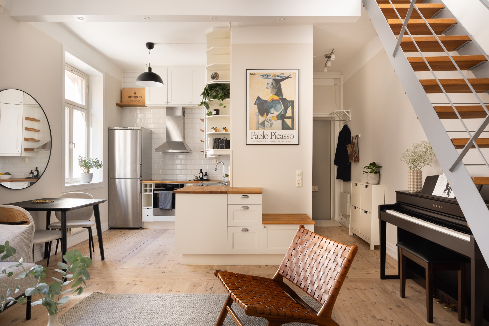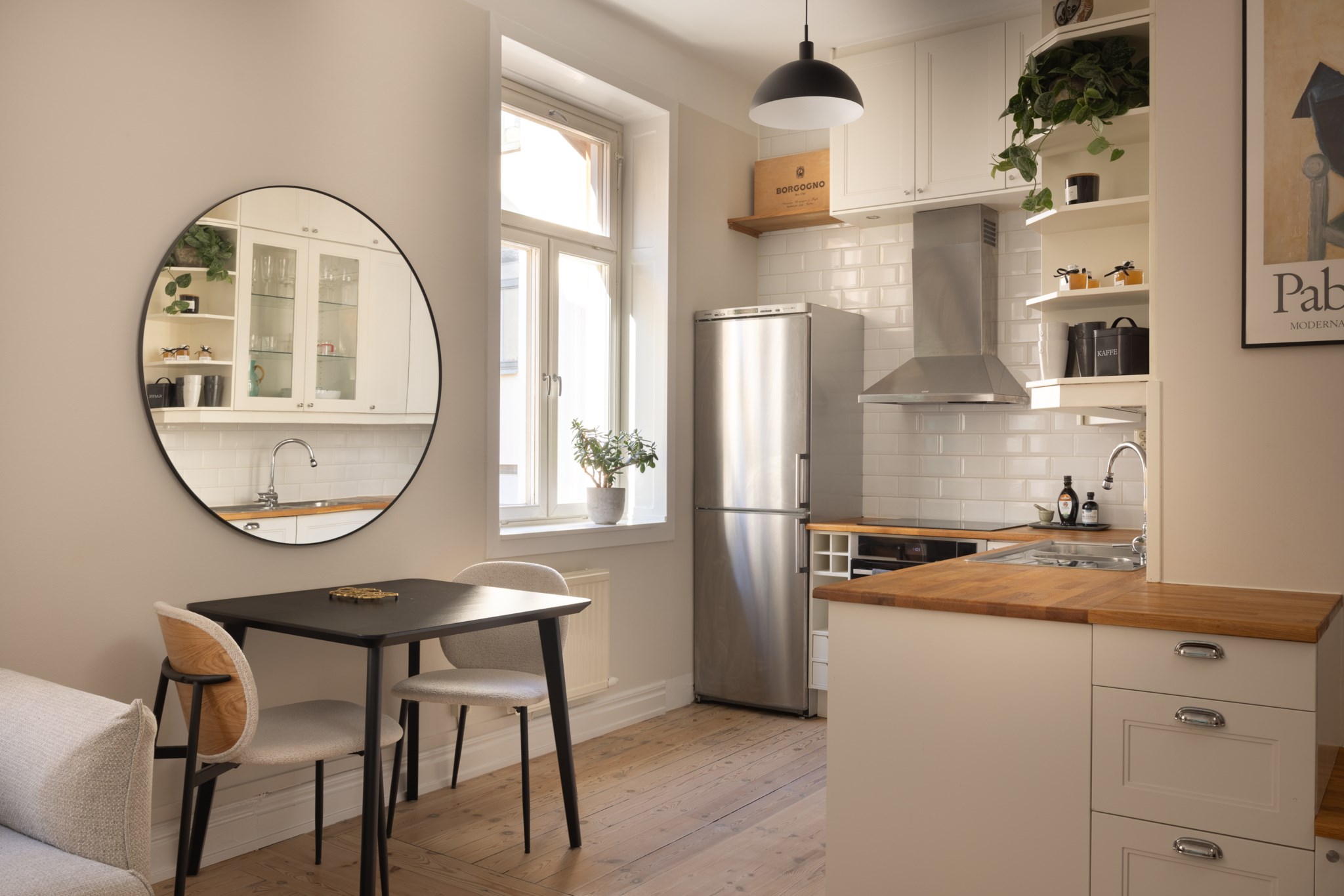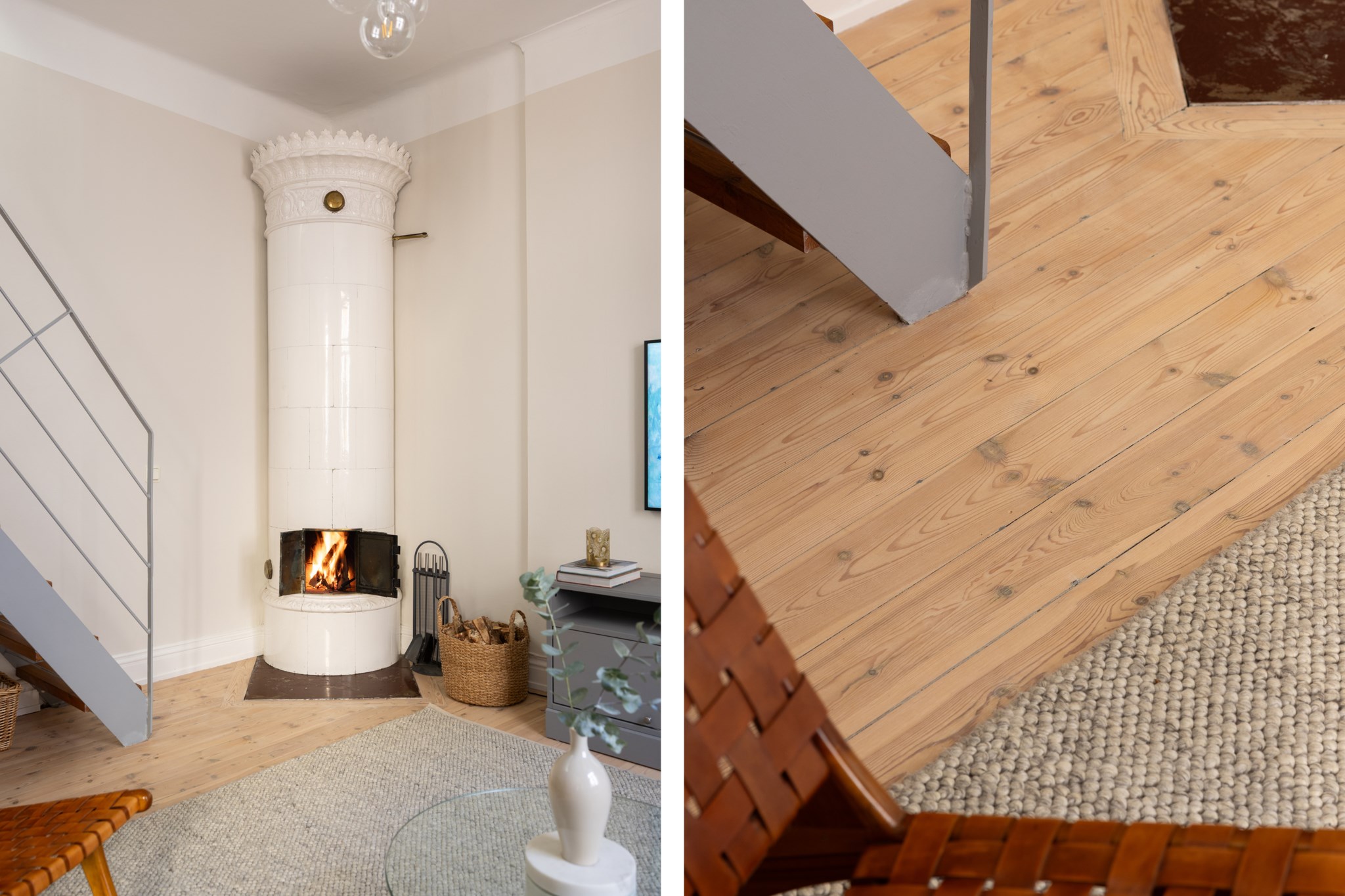 Välkommen till Norrtullsgatan 26A, en unik etagelägenhet som förenar sekelskiftescharm med modern funktion. Här bor du i ett hem med karaktär, ljus och rymd fördelat på två plan, med en solig terrass i söderläge som kronan på verket. På entréplanet möts du av vitlaserade plankgolv och en social yta där kök och vardagsrum smälter samman i en öppen planlösning. Köket har vita, sekelskiftesinspirerade skåpsluckor och en bänkskiva i trä – både tidlöst och inbjudande. I vardagsrummet står den vackra, fungerande kakelugnen som blir en självklar samlingspunkt och skapar en varm atmosfär under årets kallare månader. Här finns även ett stilrent badrum med helkaklade vita väggar och grå klinkergolv. En trappa upp väntar bostadens privata del med ett rofyllt sovrum och ett praktiskt kontorsutrymme under snedtaket. De platsbyggda garderoberna maximerar förvaringsmöjligheterna, och därtill finns två rymliga förråd som gör det enkelt att hålla ordning. Från detta plan nås också lägenhetens höjdpunkt – den soliga terrassen i söderläge, perfekt för odling, avkoppling eller middagar i kvällssolen. Bostaden är idag disponerad som en välplanerad 2,5:a men kan med enkla medel göras om till en 3:a för den som önskar ytterligare ett sovrum
