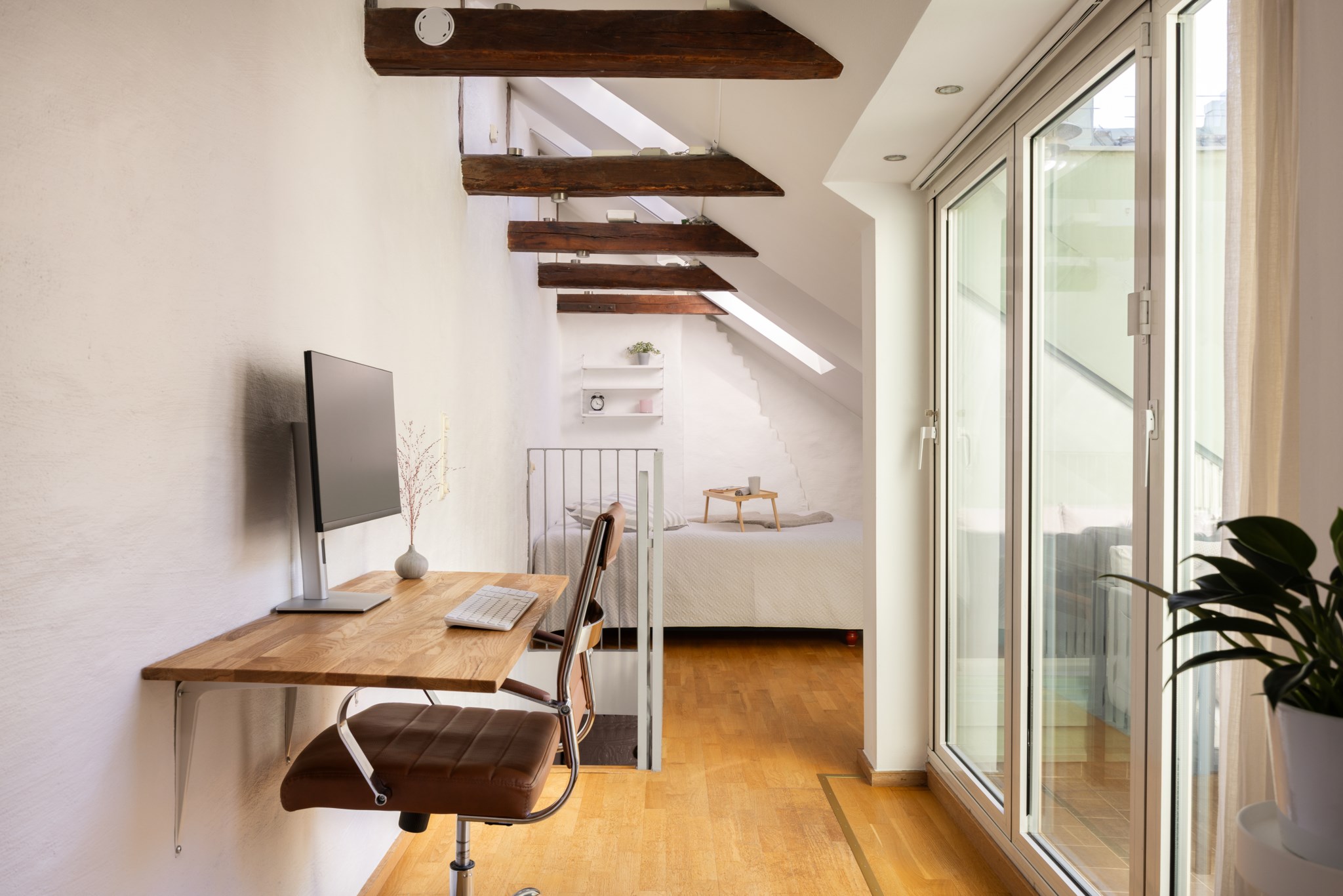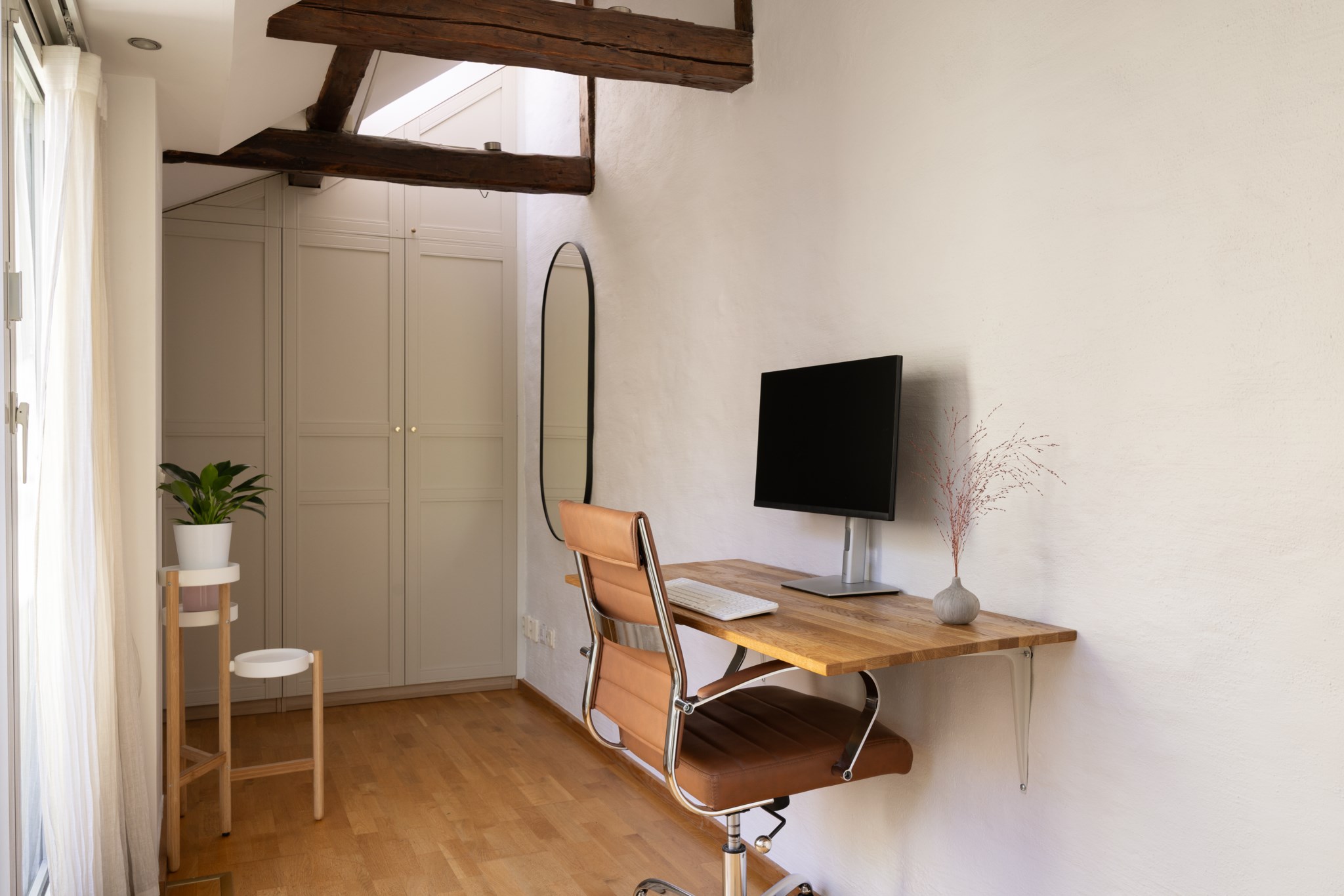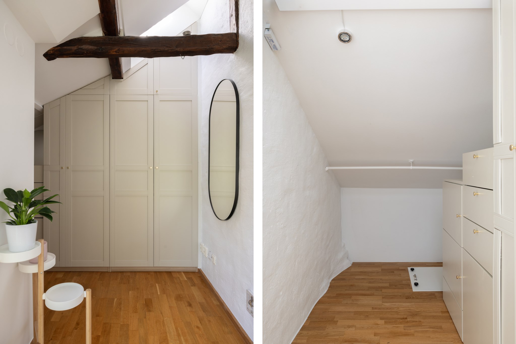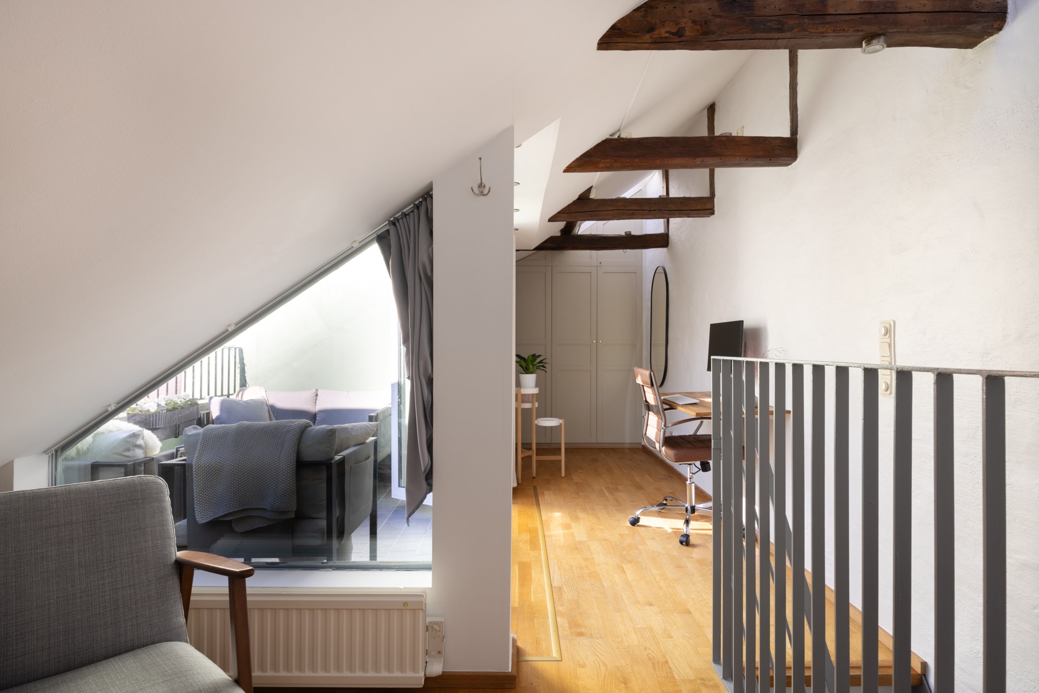 Praktiskt plats för kontorsdel eller mindre säng. Ljust parkettgolv och högt i tak med takbjälkar. Gott om förvaring via klädkammare och garderobsvägg.