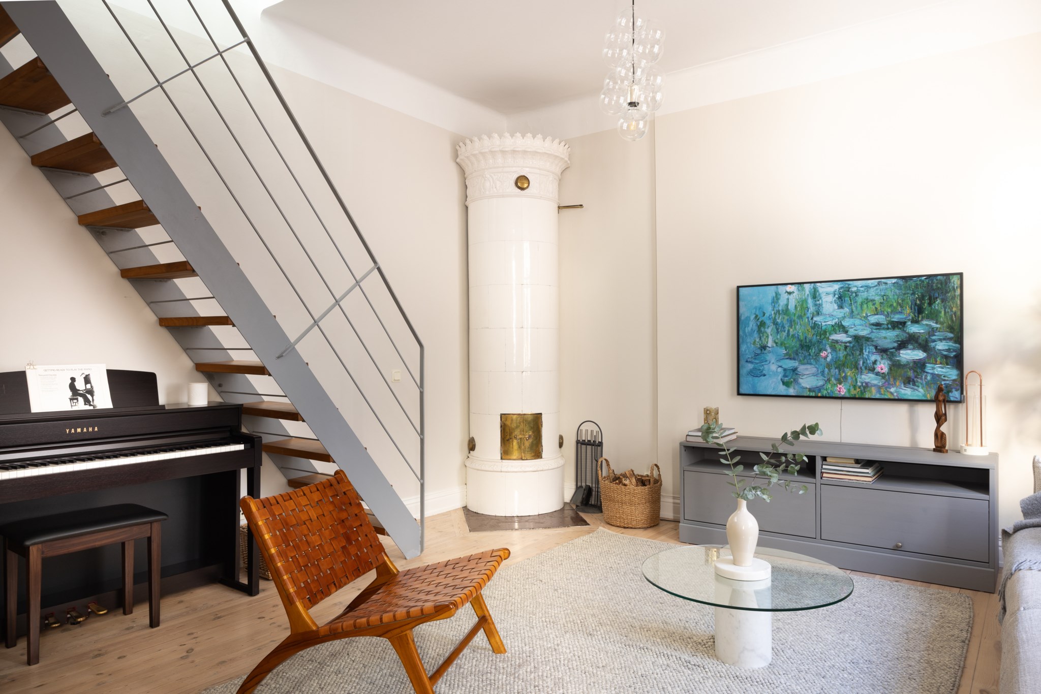 Pampigt vardagsrum i öppen planlösning mot köket. Vacker fungerande kakelugn, högt i tak och stora fönster. Plats för soffa, mediabänk och middagsbord.
