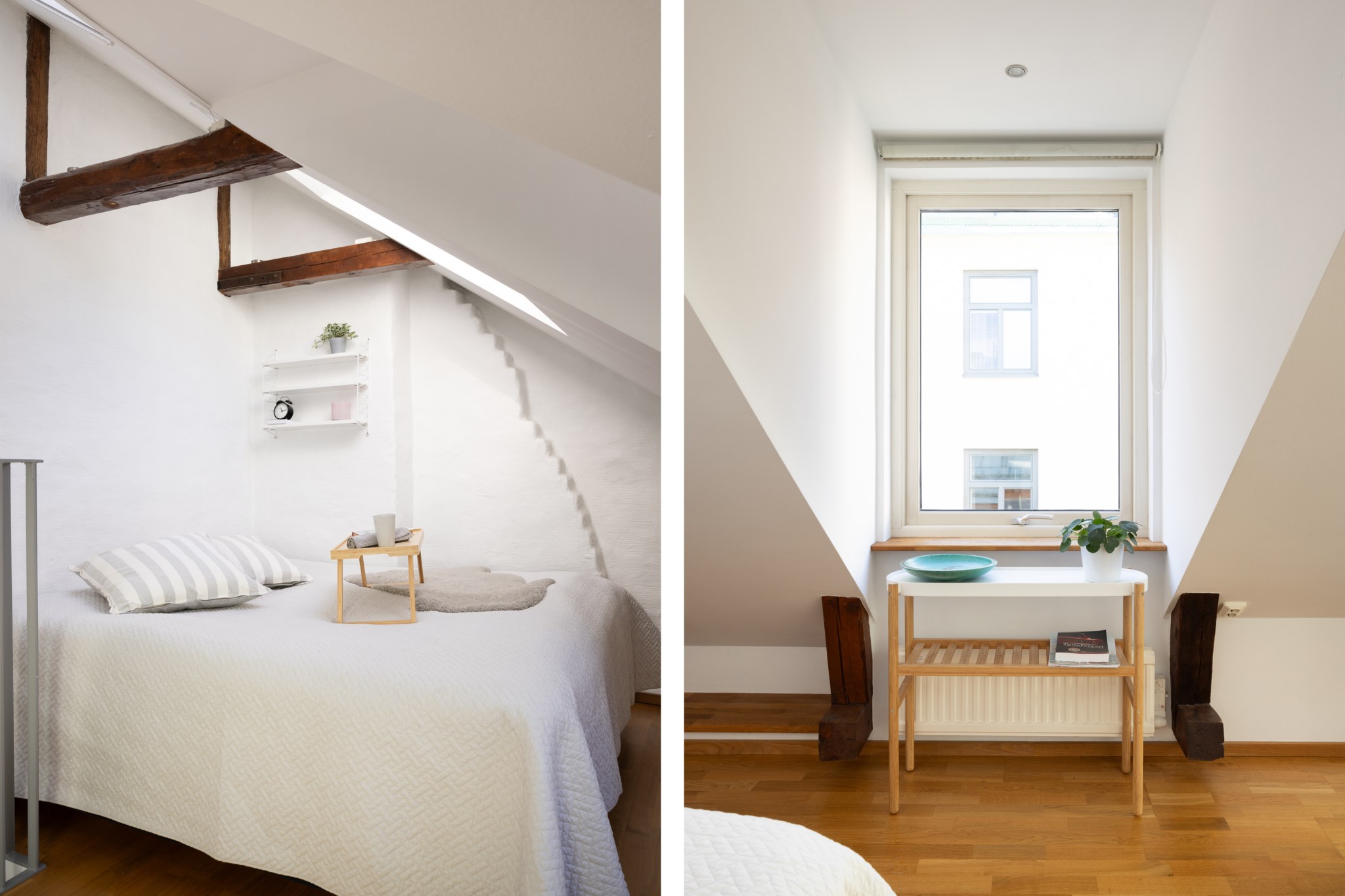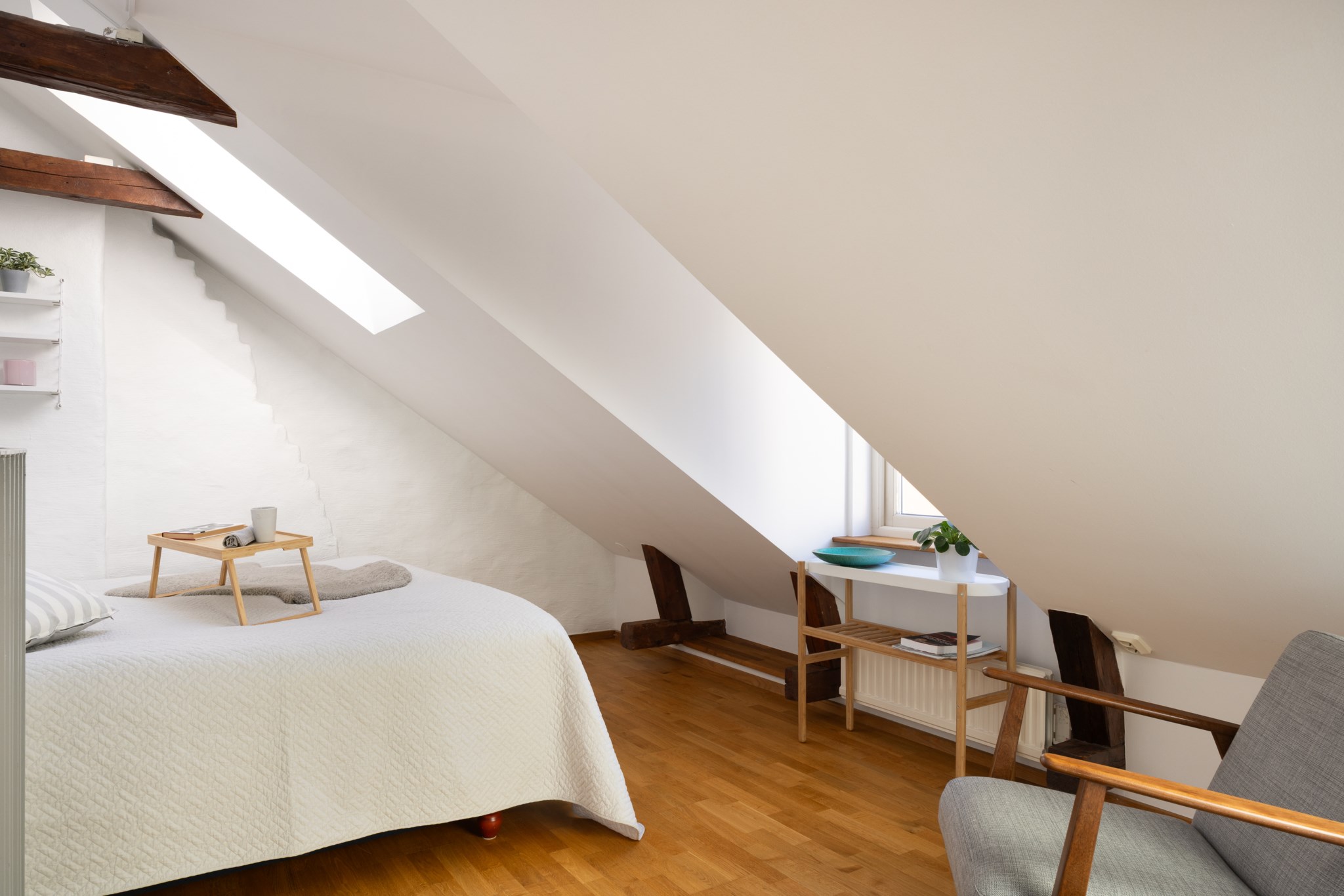 Mysigt sovrum med plats för större säng. Sovrummet har allt man kan önska som änglatrappor, takbjälkar, takfönster och fint ljusinsläpp.