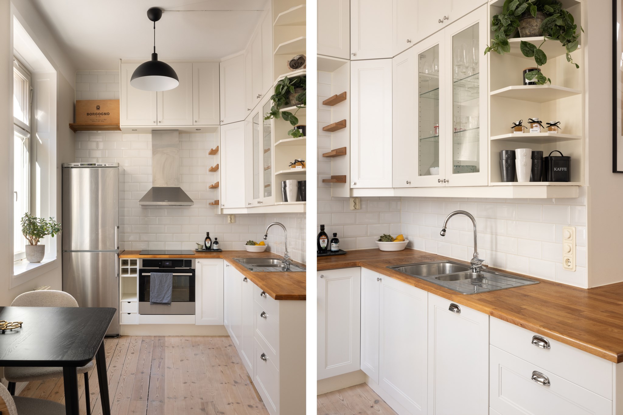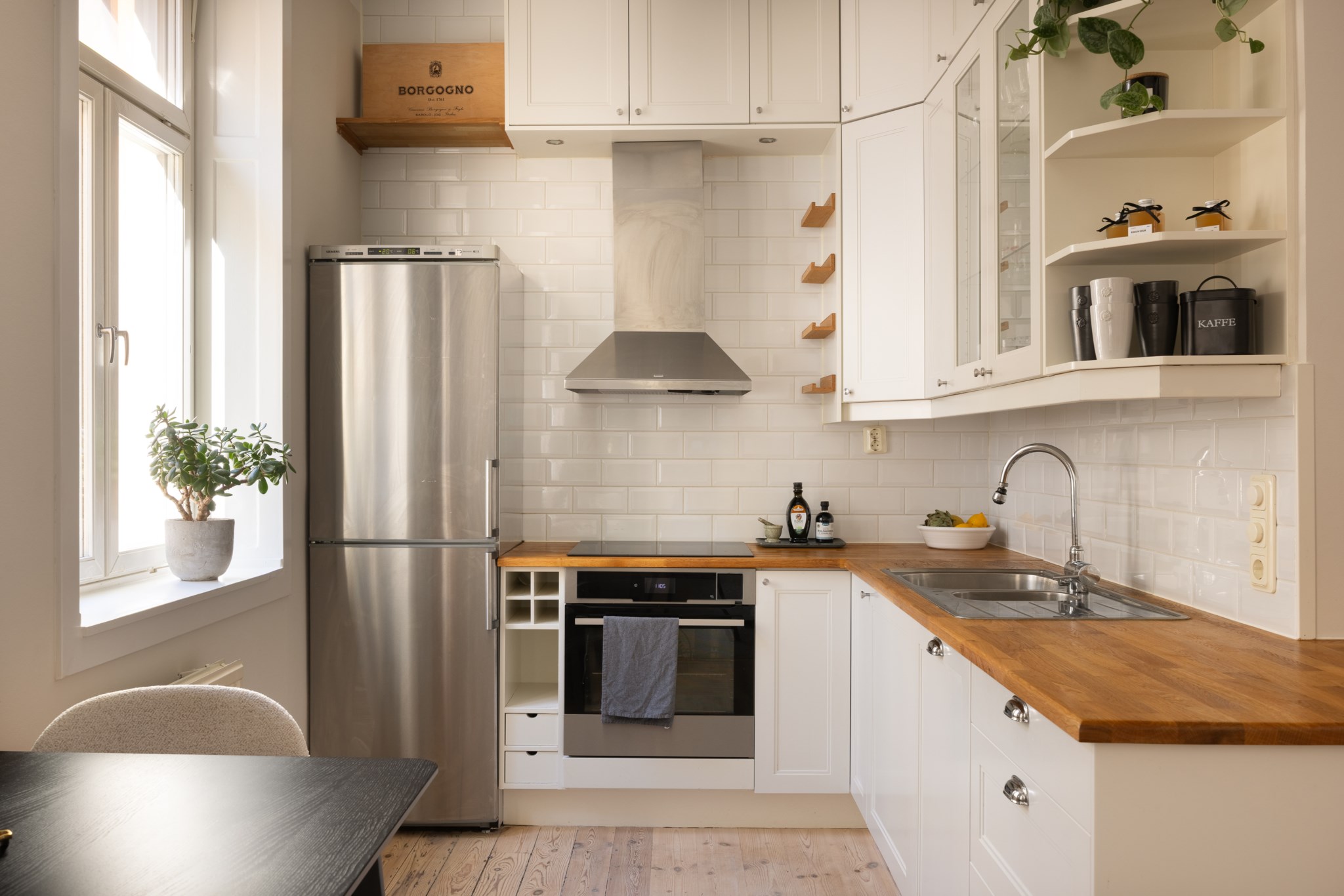 Stilrent kök med gott om arbetsyta. Utrustat med kyl,frys, fläkt, ugn, häll och diskmaskin. Ljusa luckor, ljust kakel och fint trägolv. Plats för middagsbord.