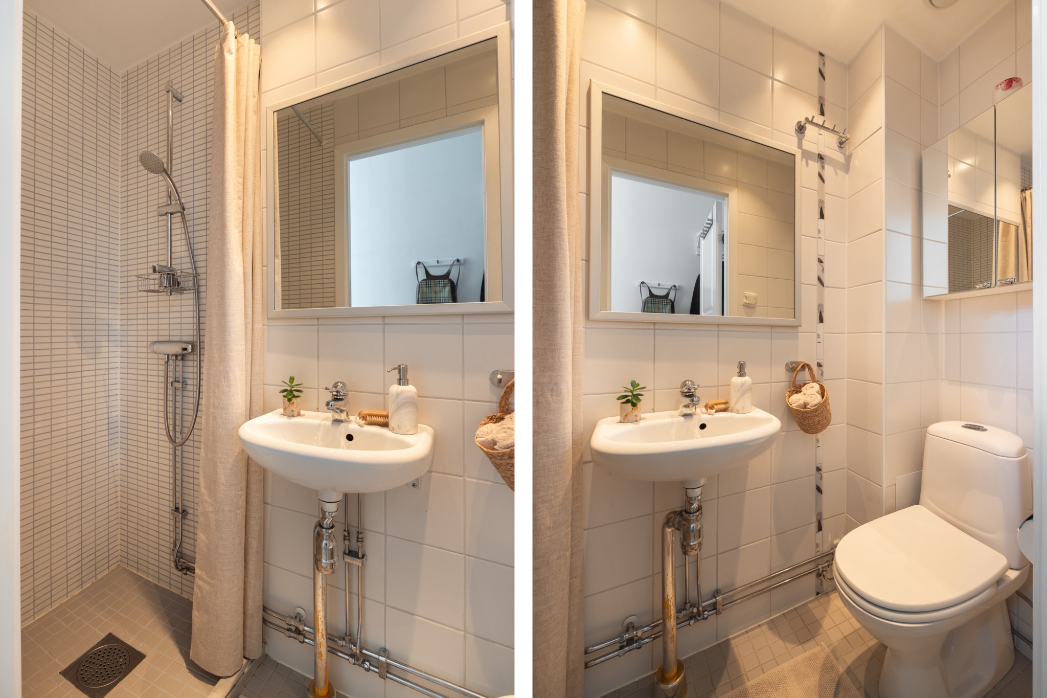 Helkaklat badrum utrustat med dusch, handfat, spegelskåp, WC och golvvärme,