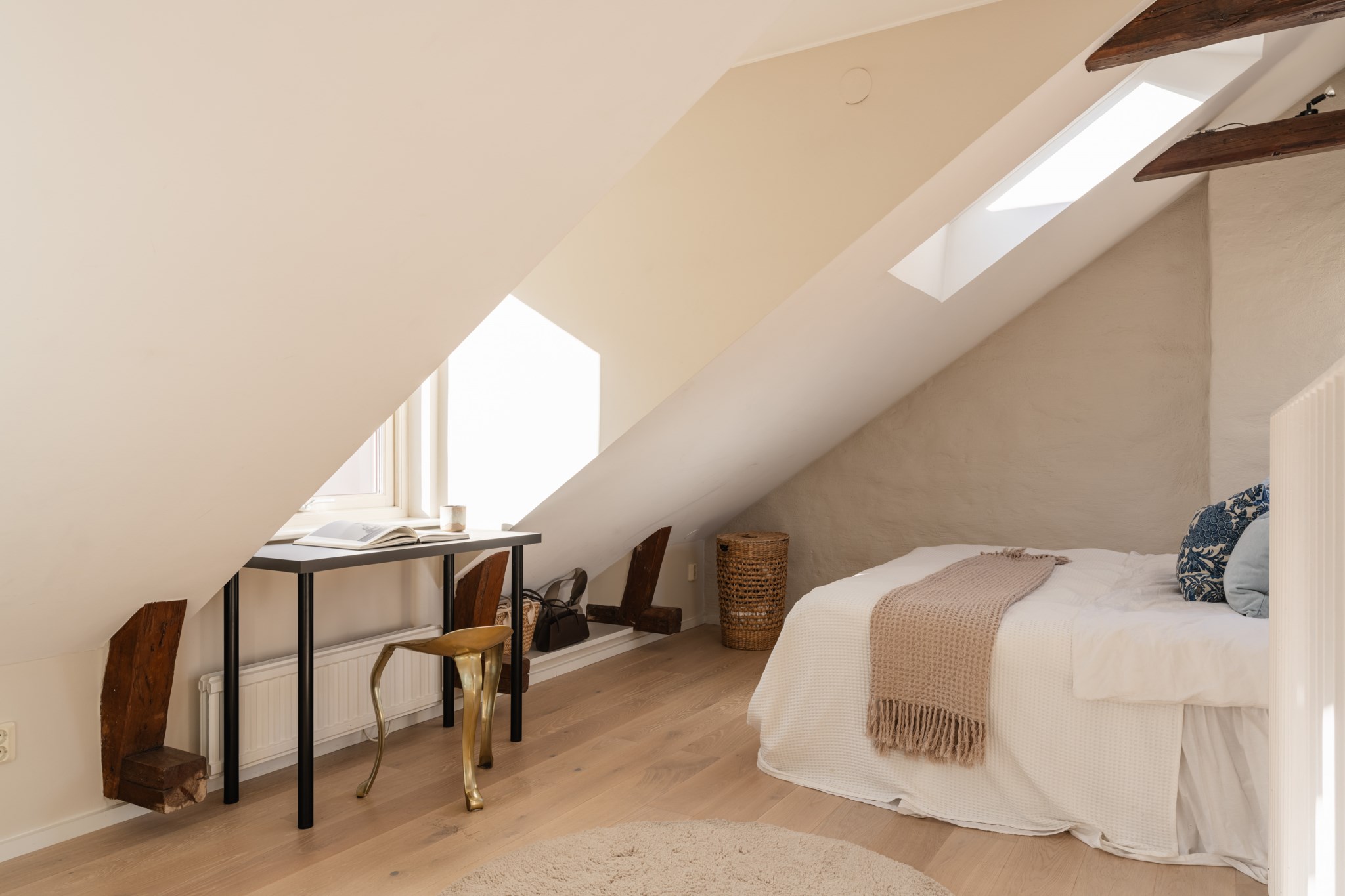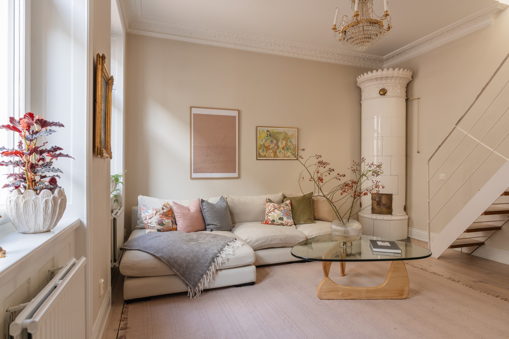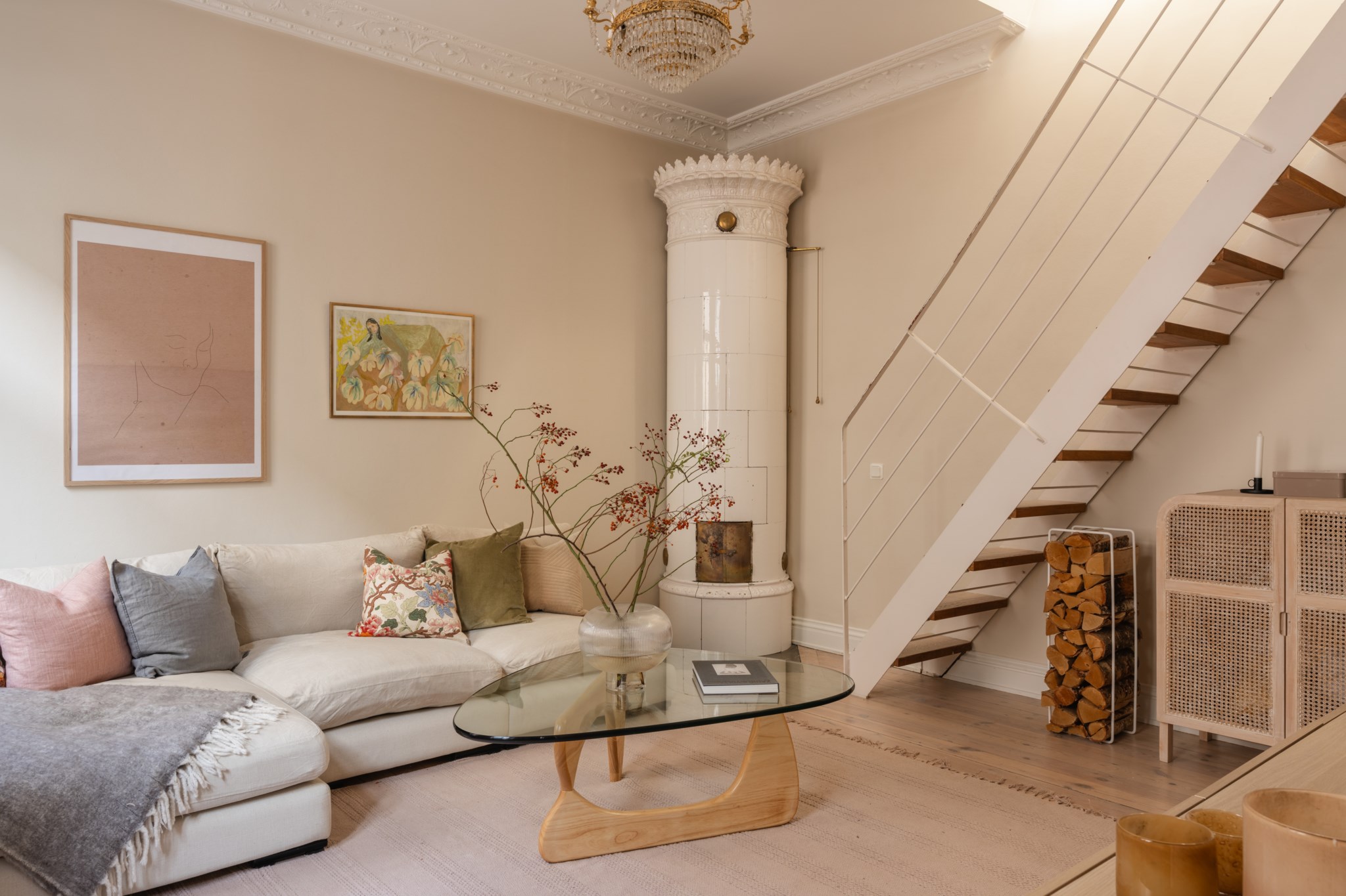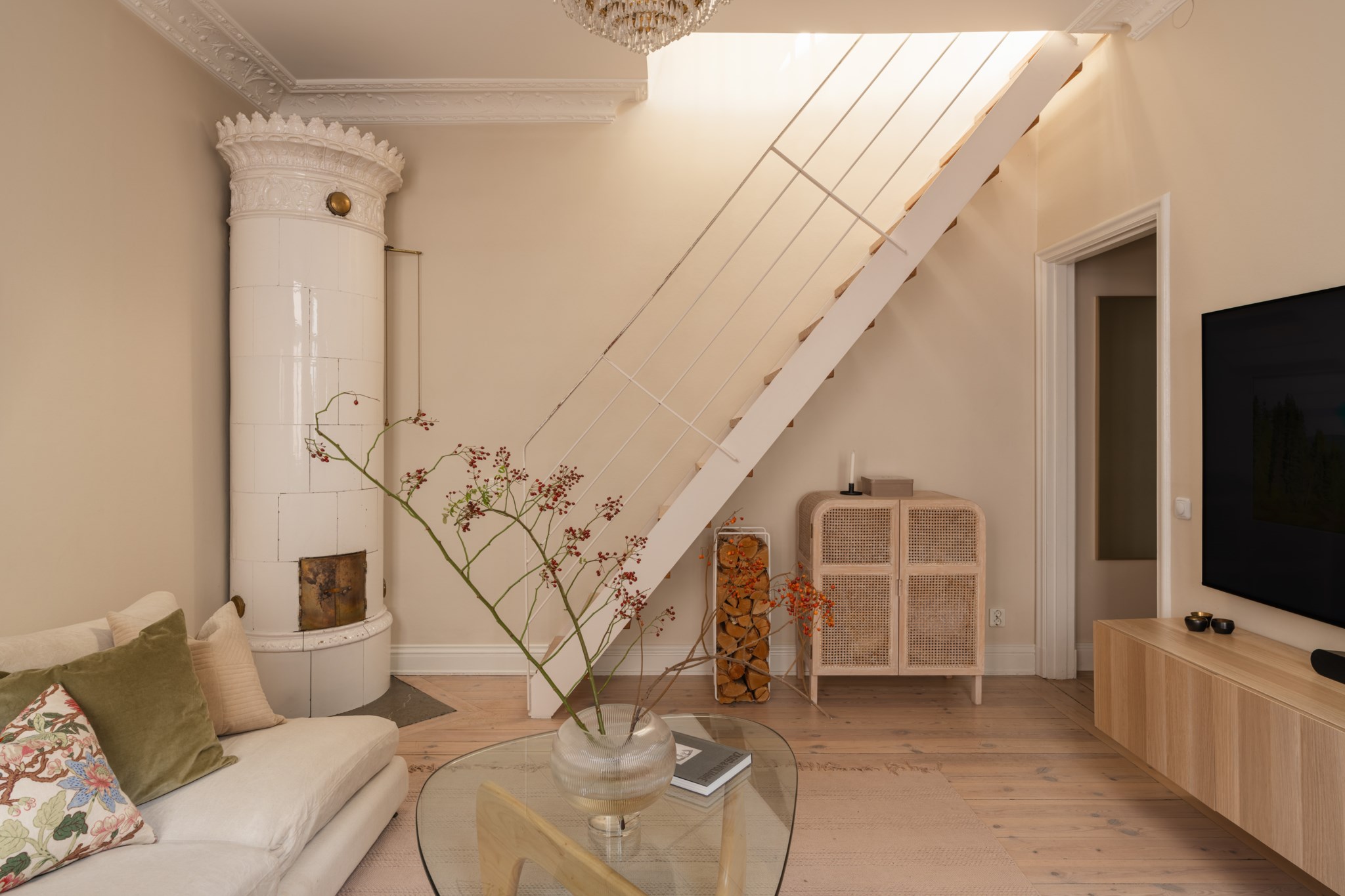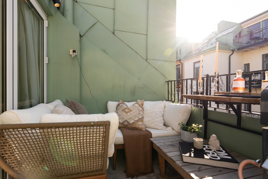 Bostaden bjuder på en alldeles särskild atmosfär – en plats där varje detalj samspelar. Den fungerande kakelugnen blir hemmets naturliga hjärta och skapar en varm och inbjudande känsla under årets kallare månader. Den öppna planlösningen tillsammans med etagelösningen ger bostaden karaktär och en social dynamik där rummen binds samman på ett naturligt sätt. Från bostaden nås även den underbara terrassen i rakt söderläge – en privat oas ovan stadens tak. Här kan du njuta av sol större delen av dagen, från lugna morgonkaffen till långa middagar i kvällssolen. Kombinationen av taknära läge och söderläge skapar ett fantastiskt ljusinsläpp som förstärker bostadens luftiga och harmoniska känsla. Planlösningen är både genomtänkt och charmig, där kvadratmeterna nyttjas optimalt och etageplanet bidrar till en tydlig separation mellan sociala ytor och mer privata delar. Resultatet är ett hem som känns större än sina kvadratmeter och som erbjuder flera naturliga möbleringsmöjligheter.