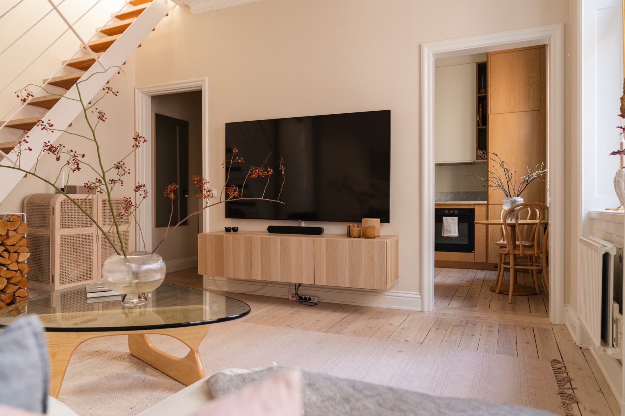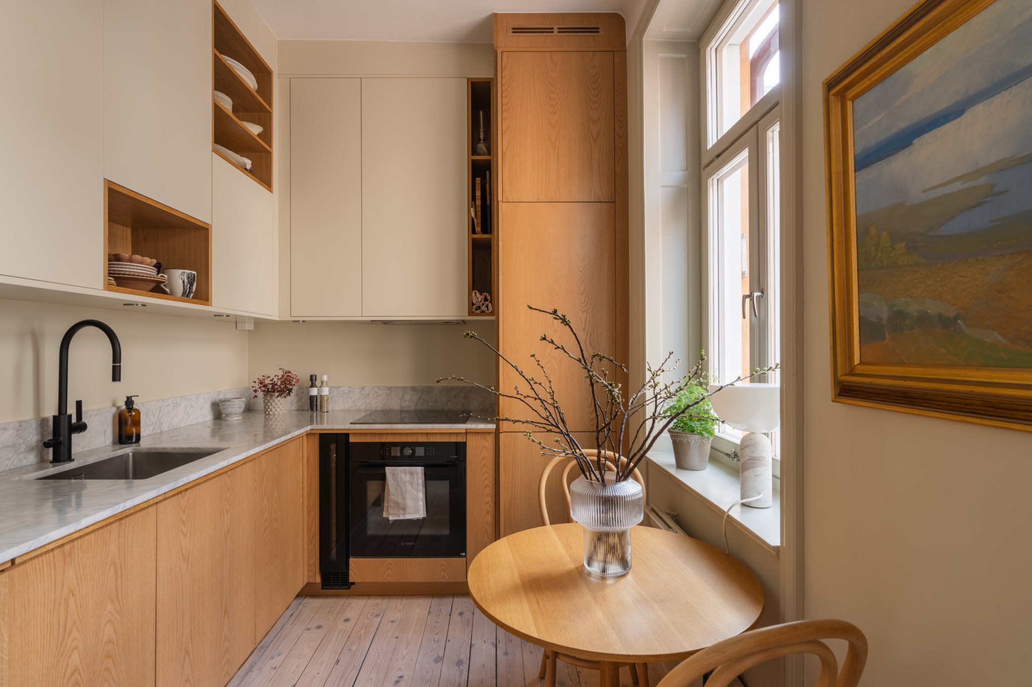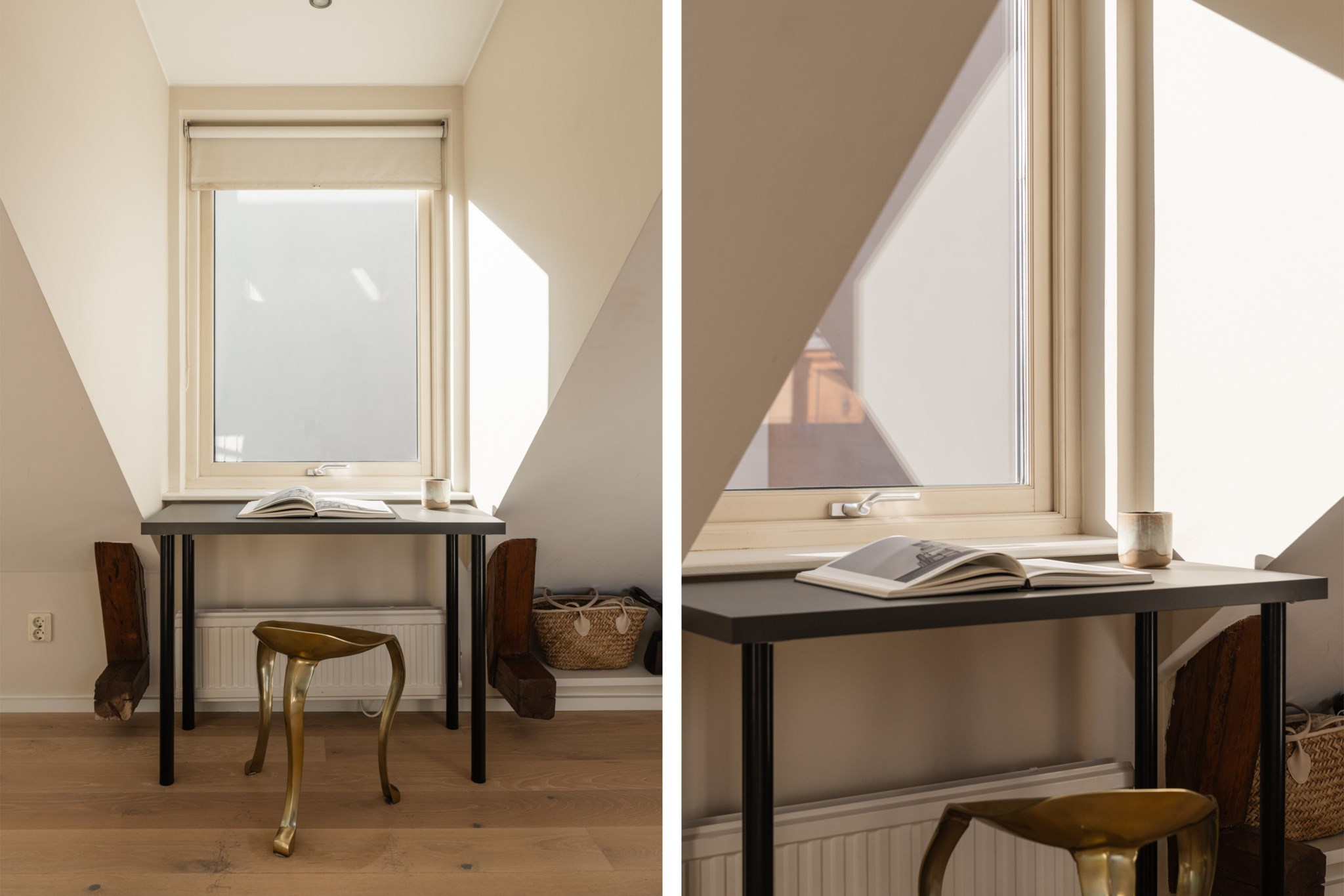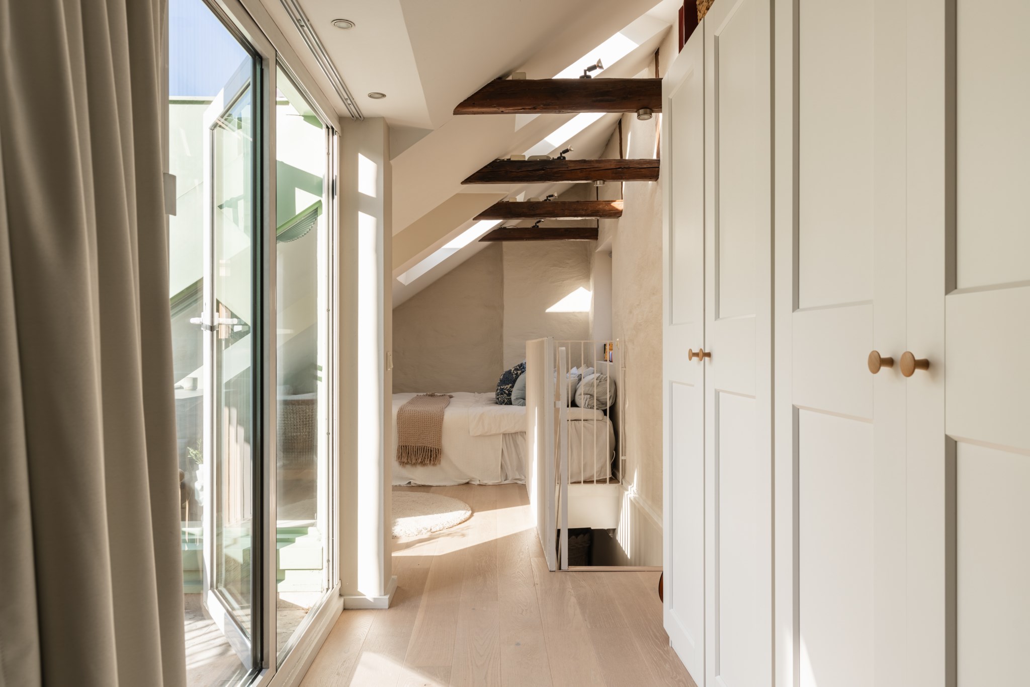 Bostaden bjuder på en alldeles särskild atmosfär – en plats där varje detalj samspelar. Den fungerande kakelugnen blir hemmets naturliga hjärta och skapar en varm och inbjudande känsla under årets kallare månader. Den öppna planlösningen tillsammans med etagelösningen ger bostaden karaktär och en social dynamik där rummen binds samman på ett naturligt sätt. Från bostaden nås även den underbara terrassen i rakt söderläge – en privat oas ovan stadens tak. Här kan du njuta av sol större delen av dagen, från lugna morgonkaffen till långa middagar i kvällssolen. Kombinationen av taknära läge och söderläge skapar ett fantastiskt ljusinsläpp som förstärker bostadens luftiga och harmoniska känsla. Planlösningen är både genomtänkt och charmig, där kvadratmeterna nyttjas optimalt och etageplanet bidrar till en tydlig separation mellan sociala ytor och mer privata delar. Resultatet är ett hem som känns större än sina kvadratmeter och som erbjuder flera naturliga möbleringsmöjligheter.