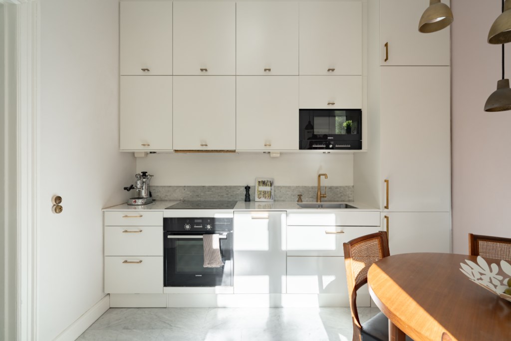Kök i social planlösning mot vardagsrummet, med tidlösa materialval. Modernt kök (HTH) med klassiskt Carrara marmorgolv, golvvärme samt målade väggar. Köket är fullt utrustat med vitvaror från Siemens - inbyggd diskmaskin, induktionshäll, ugn, inbyggd mikrovågsugn, fläkt samt kyl/frys. Generöst med förvaring i dubbla skåp ändå upp till taket med vita luckor och strama designerbeslag i mässing. Arbetsyta av helvit stenskiva komposit Silestone med underlimmad diskho och stänkskydd i Carraramosaik. Klassisk blandare i mässing. Köket möbleras ledigt med ett större matbord och har ett fint ljusinsläpp från ett fönster och dubbeldörrar ut till den härliga altanen.
