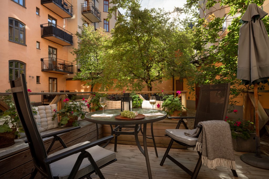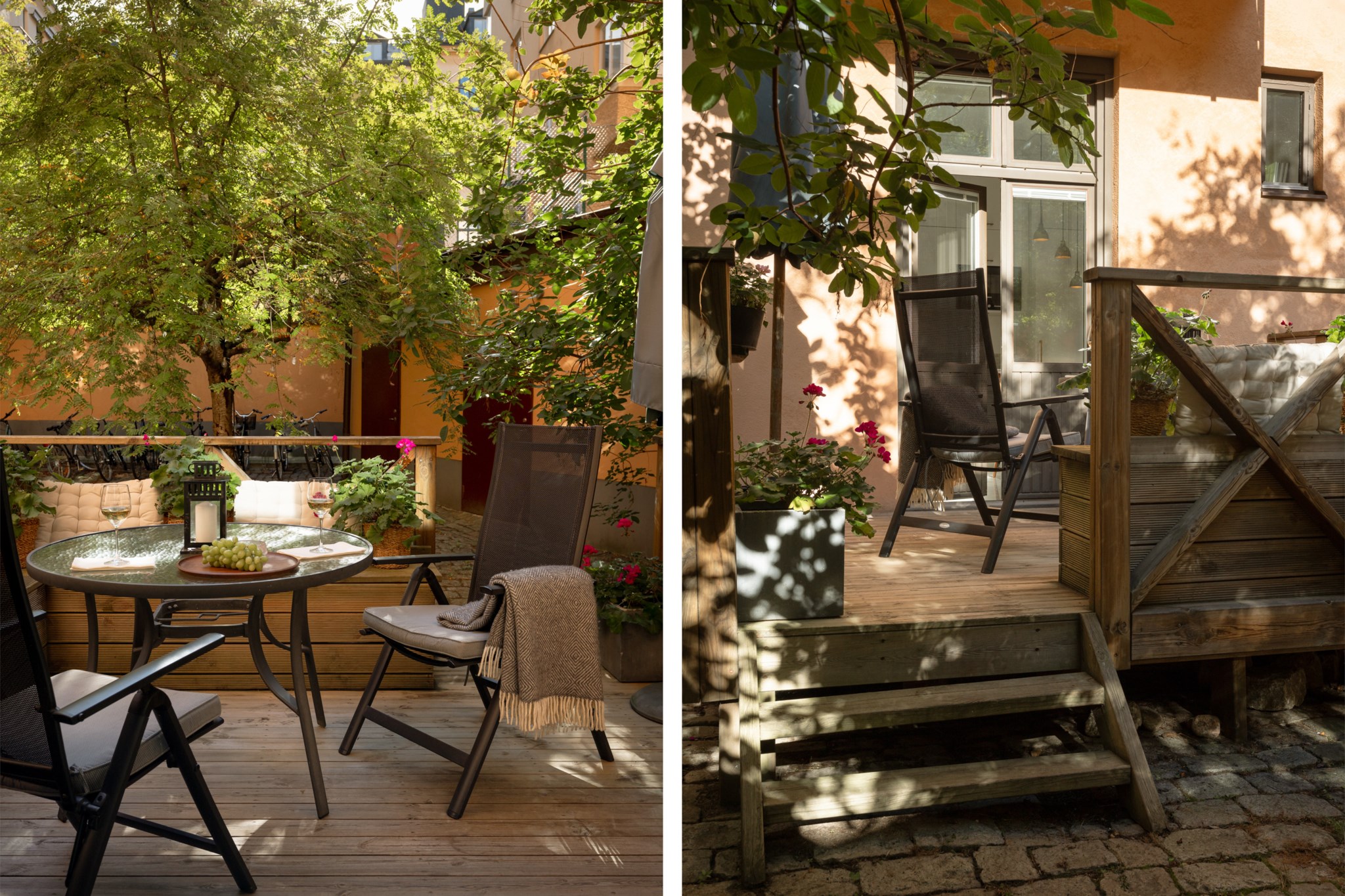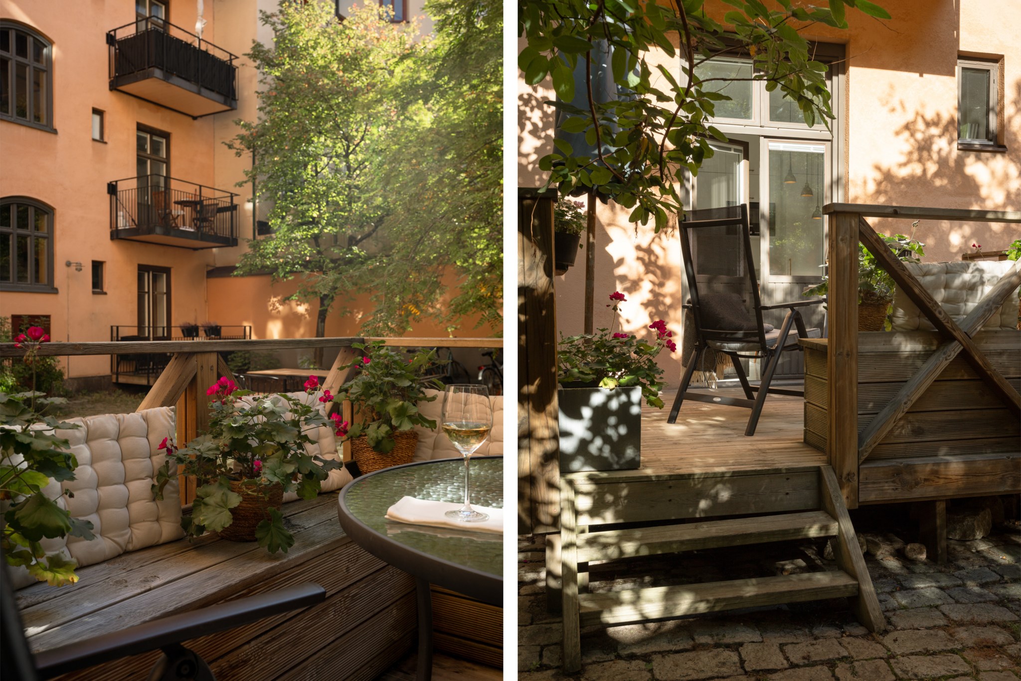 Fantastisk altan om ca 9 kvm, lugnt belägen på bolagets vackra kullerstensgård. Altanen har platsbyggda bänkar med förvaring och sittplats för 6-8 personer. Söderläge med sol från morgon till sen eftermiddag.
